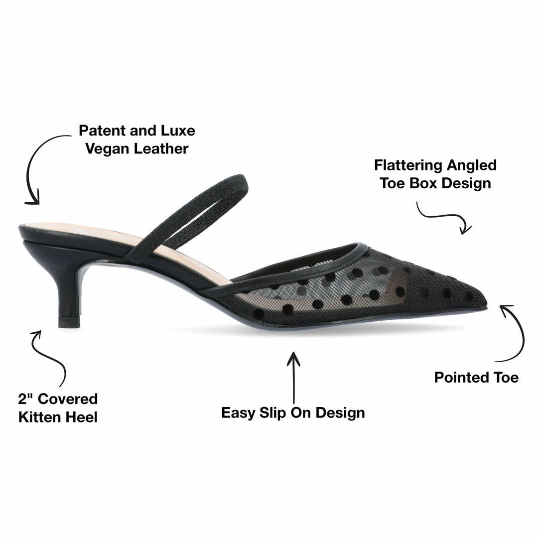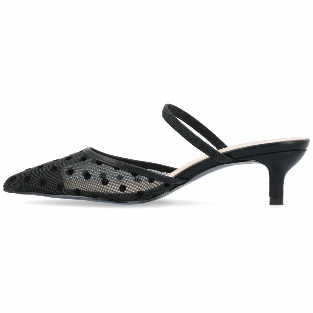 Proof that polka-dots are always in style, the Allana heel by Journee Collection. This vintage kitten heel is topped with a cap-toe and mesh fabric uppers with a polka dot pattern throughout. A stretchable strap and padded insole perfect this slip-on silhouette. At Journee Collection, our pump styles will let you go from a fun night out with the girls to kicking back and relaxing at the end of the night without any trouble. Heel Height – 2-inch Heel Type – Kitten Heel Platform Height – Flat-inch Shoe Width – Medium Closure Type – Slip-on Strap Type – Ankle Toe Style – Pointed Lining – Fabric Upper Material – Fabric Outersole Material – Man-made Footbed – Padded