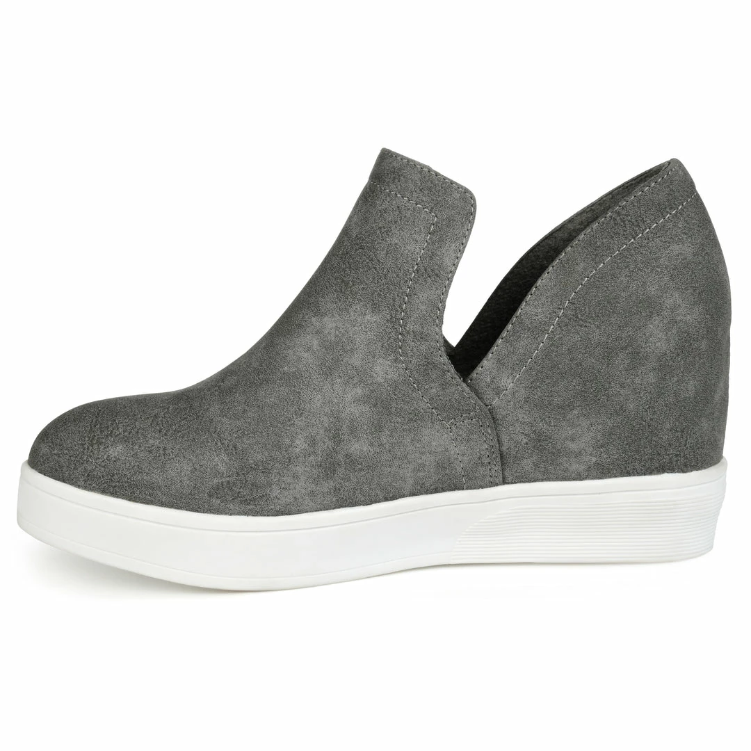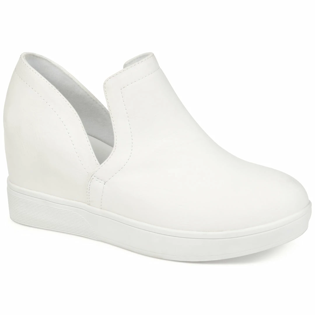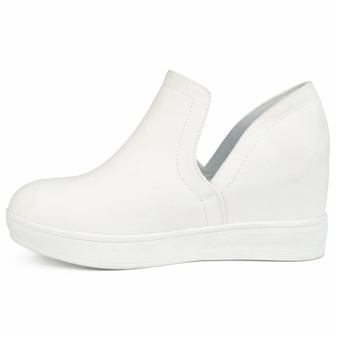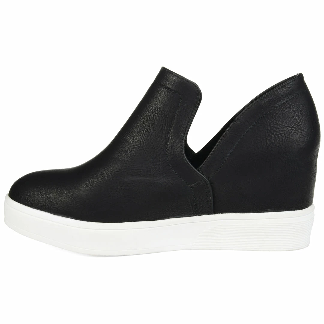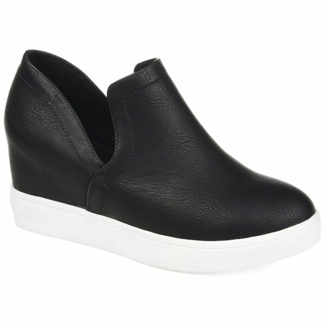 Add some freshness to your wardrobe with the Cardi sneaker by Journee Collection. This easy slip-on style shoe features a hidden wedge design with a round toe and platform bottom. The deep V side cut-outs add a unique touch and create an easy entry. Heel Height – 3-inch Heel Type – Hidden Wedge Platform Height – 1-inch Shaft Height – 3 1/2 inches Top Circumference – 11 inches Shoe Width – Medium Closure Type – Slip-on Toe Style – Round Lining – Fabric Upper Material – Faux Leather Outersole Material – Rubber Footbed – Padded