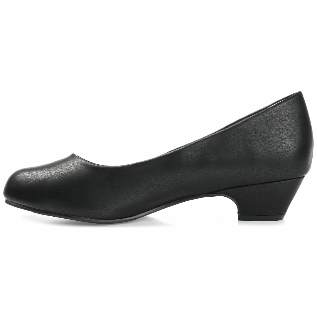 Step into sophisticated style when you wear these faux leather pumps from Journee Collection. These wear-anywhere heels are constructed out of faux leather and feature a comfort-sole footbed design Heel Height – 1 1/2-inch Heel Type – Kitten Heel Platform Height – 1/2-inch Shoe Width – Medium Closure Type – Slip-on Toe Style – Round Lining – Faux Leather Upper Material – Faux Leather Outersole Material – Faux Leather over Synthetic Footbed – Comfort