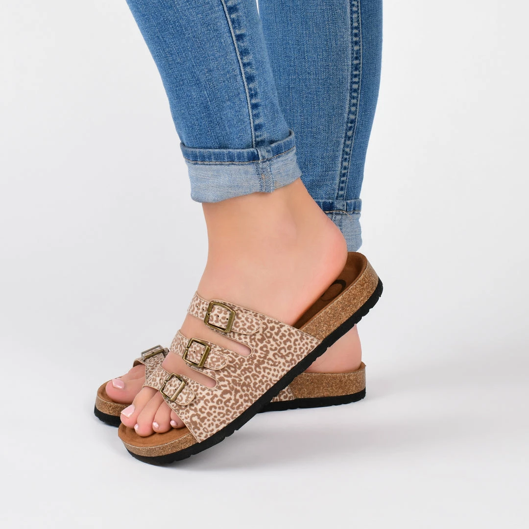 The Desta is a unique take on a trending style. This slip-on sandal features a triple strap with three square buckles and a synthetic cork outsole. The soft faux leather material opens up at the toe so you can have free movement, and the insole is lined with a soft material for extra comfort. Available in unique patterns such as floral and leopard. Heel Height – 1-inch Heel Type – Sole Platform Height – 1-inch Shoe Width – Medium Closure Type – Slip-on Strap Type – Multi -Strap Toe Style – Open Lining – Faux Leather Upper Material – Faux Leather Outersole Material – Synthetic Footbed – Padded