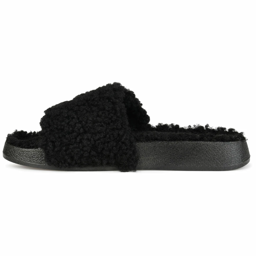Work from home or lounge all day in the Haimi by Journee Collection. This open toe slide is lined with cuddly cute teddy bear faux fur. A durable outsole finishes the look so you can wear and pair them on errands. Heel Height – 1-inch Heel Type – Sole Platform Height – 1-inch Shoe Width – Medium Closure Type – Slip-on Toe Style – Open Lining – Fabric Upper Material – Faux Fur Outersole Material – Man-made Footbed – Comfort