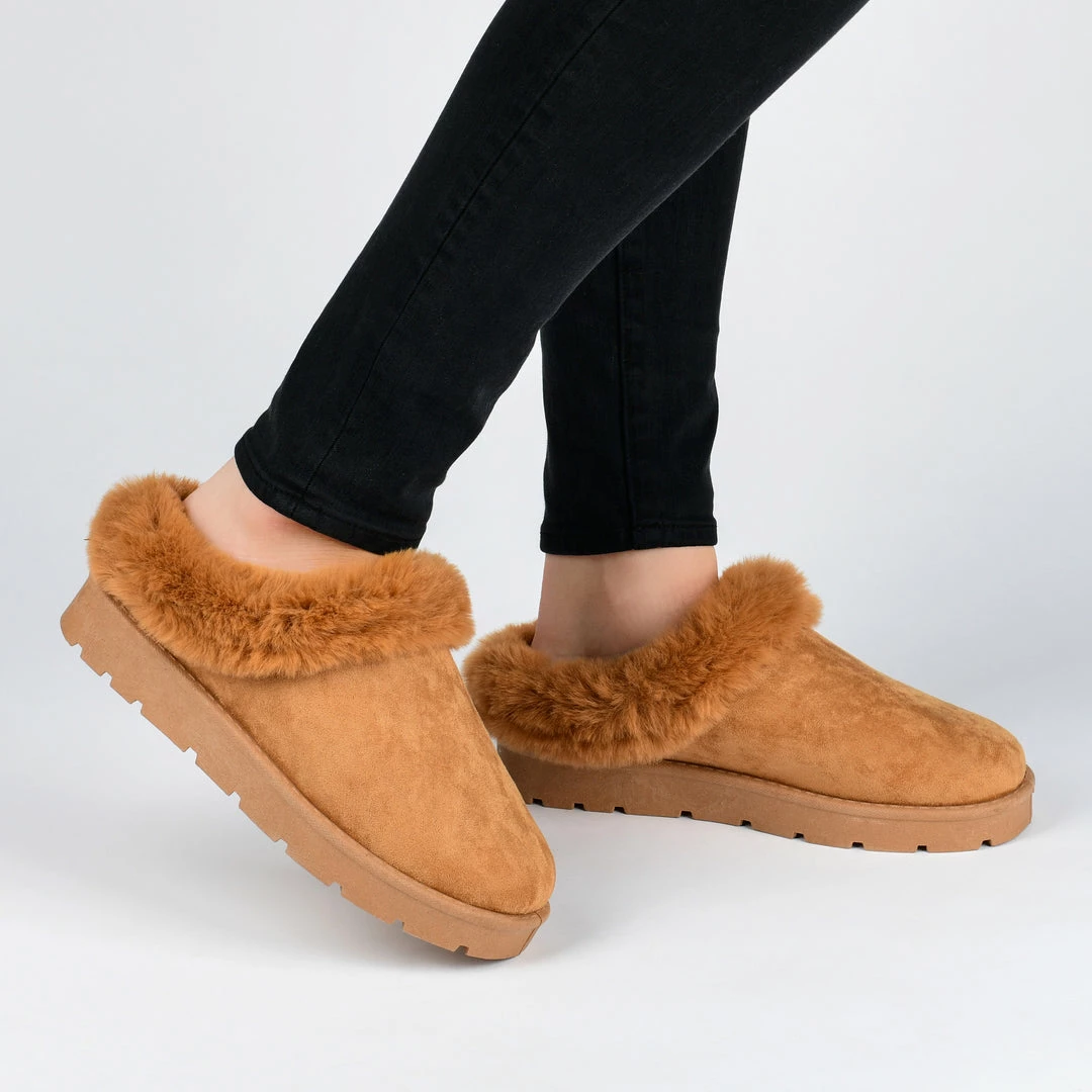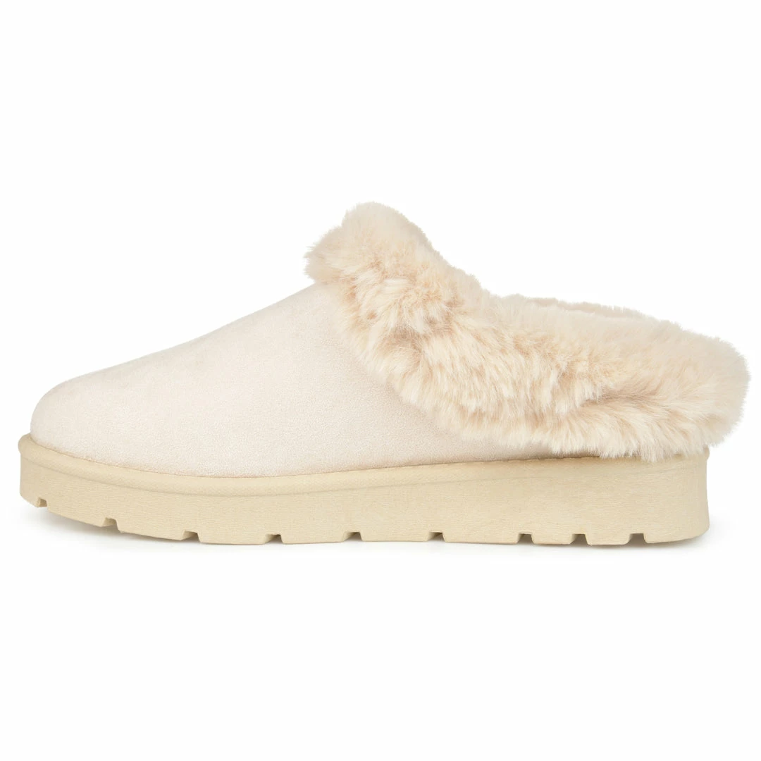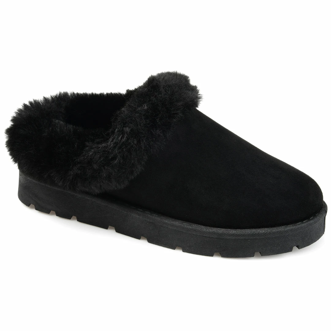 Time for some self-care? The Whisp by Journee Collection is a perfectly cozy slipper with its cushioned footbed and plush fur trim. A sturdy bottom sole finishes this vegan leather design, so you can wear them on a quick errand or out to the mailbox. Heel Height – 1 1/4-inch Heel Type – Sole Platform Height – 1-inch Shoe Width – Medium Closure Type – Slip-on Toe Style – Round Lining – Faux Fur Upper Material – Vegan Leather Outersole Material – Man-made Footbed – Comfort