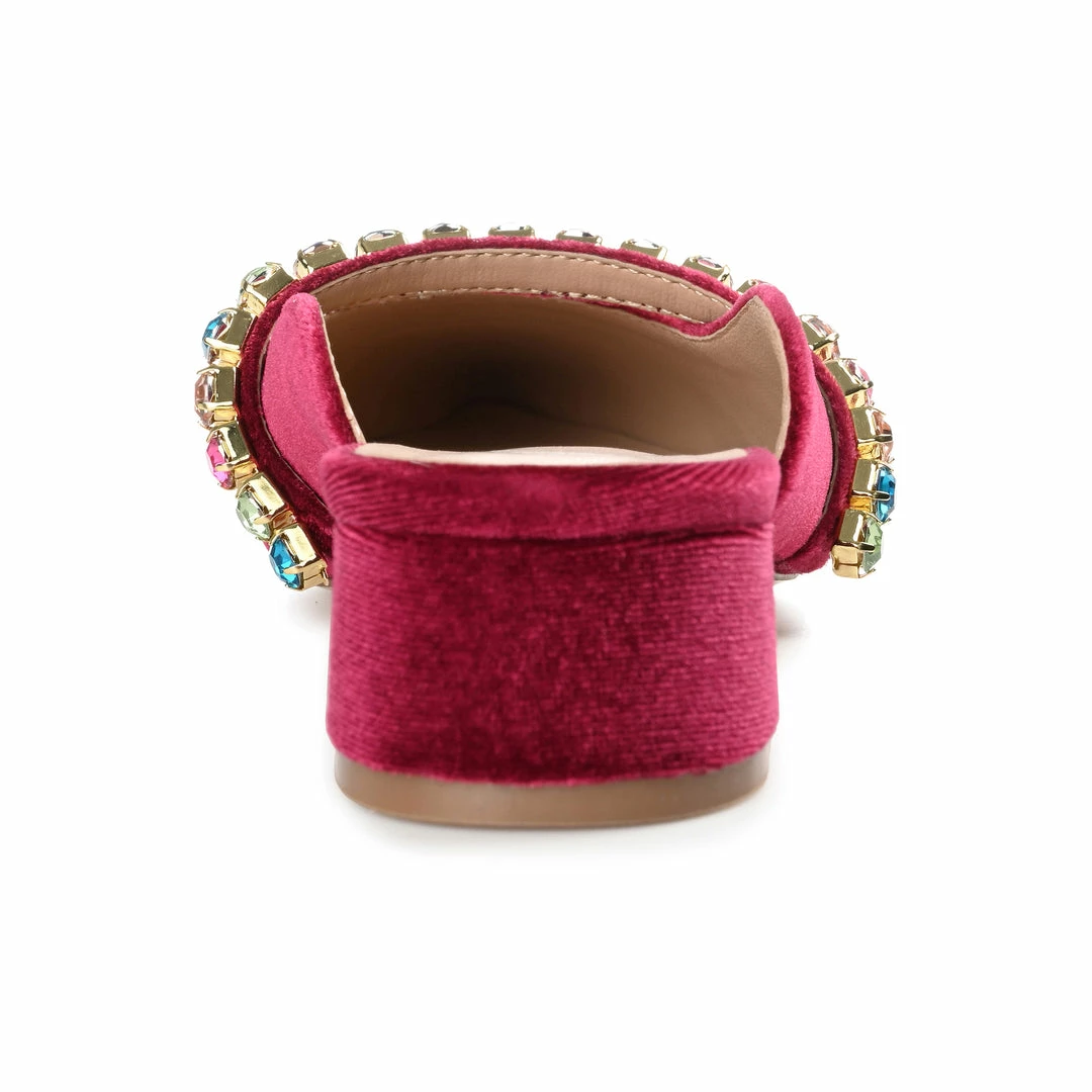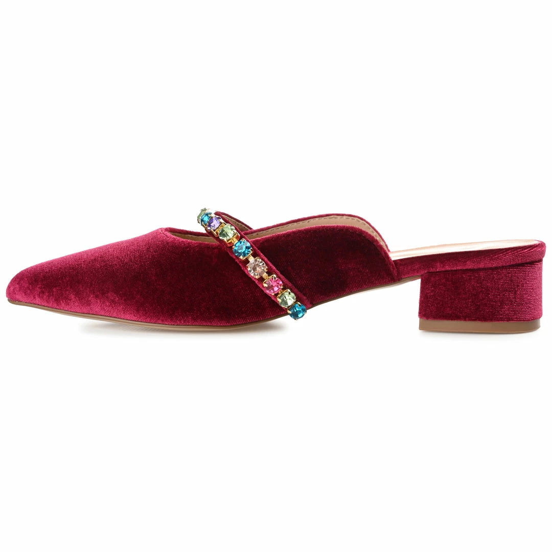 Add some sparkle to your look with the Jewel flats by Journee Collection. This velvet mule is as easy as it is stylish, thanks to the gemstone-covered strap and padded insole. A pointed-toe and a tiny covered block heel complete the silhouette for an elevated look. Heel Height – 1 1/2-inch Heel Type – Block Heel Platform Height – Flat-inch Shoe Width – Medium Closure Type – Slip-on Toe Style – Pointed Lining – Faux Leather Upper Material – Fabric Outersole Material – Man-made Footbed – Padded