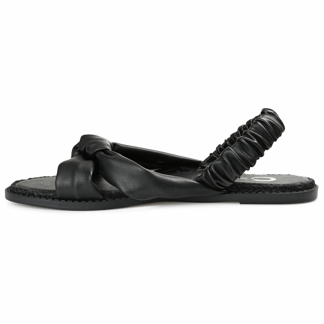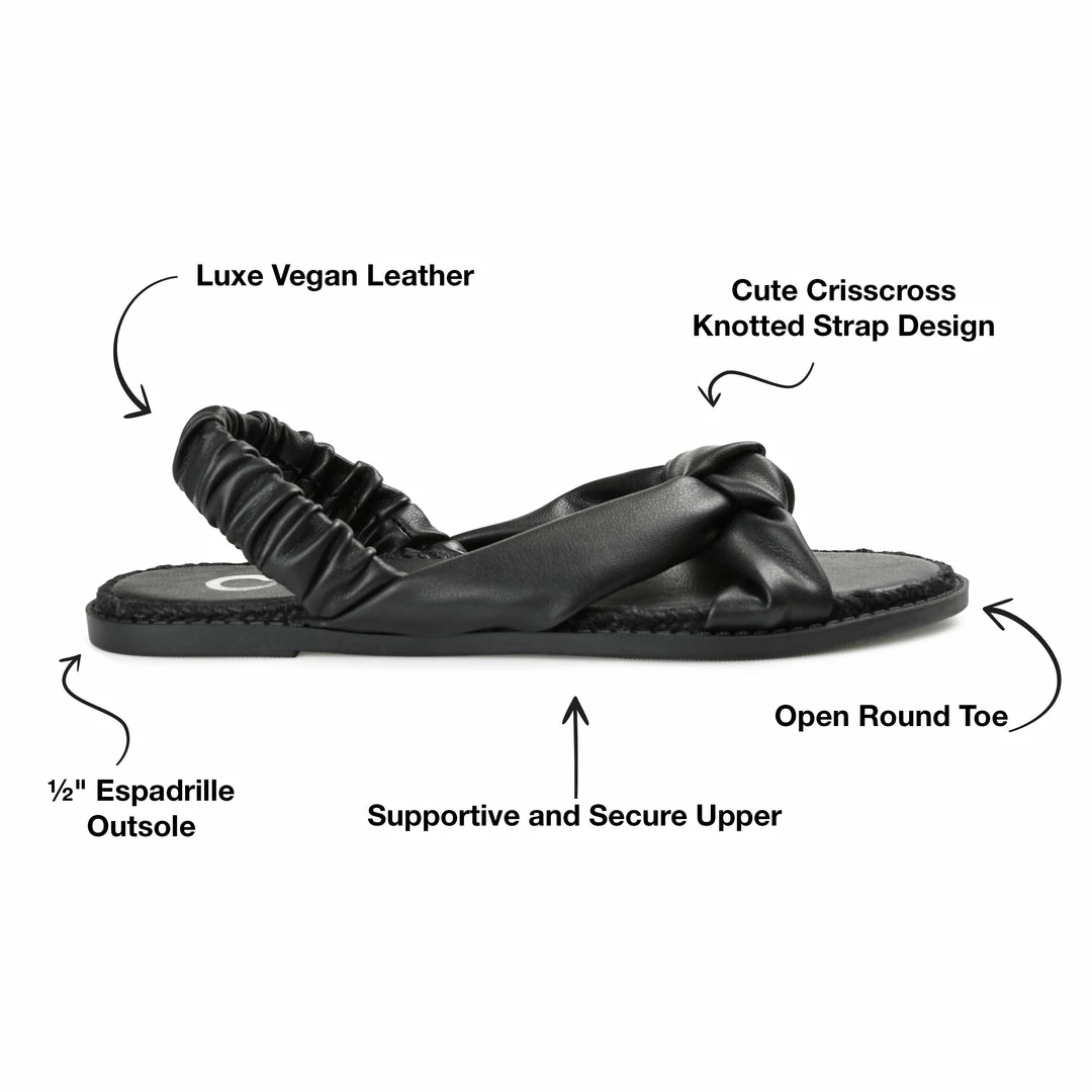 A sweet look for summer, the Kiandra by Journee Collection. Knotted vegan leather straps top this effortless sandal for an elevated finish. A padded insole offers the perfect amount of support, and an espadrille braid adds texture to the look. Heel Height – 1/2-inch Heel Type – Sole Platform Height – Flat-inch Shoe Width – Medium Closure Type – Pull-on Strap Type – Ankle Toe Style – Open Lining – Faux Leather Upper Material – Vegan Leather Outersole Material – Man-made Footbed – Padded