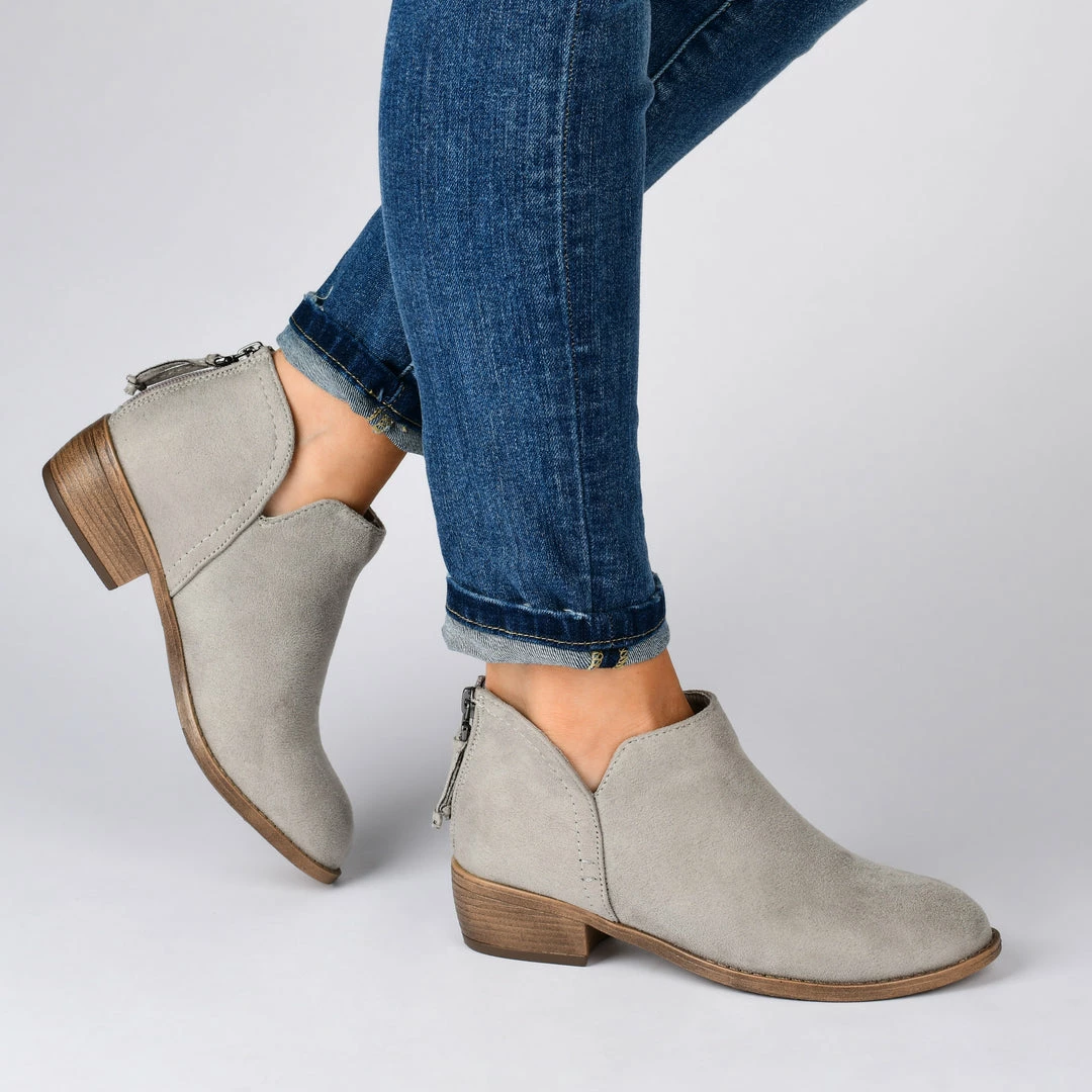 Show off versatile style with the side-split buckle booties by Journee Collection. These ankle booties have soft faux suede uppers that rise to the ankles and highlight a side-split detail and back zippers with tassel accents. Heel Height – 1 1/2-inch Heel Type – Stacked Platform Height – 1/2-inch Shaft Height – 3 1/2 inches Top Circumference – 11 1/2 inches Shoe Width – Medium Closure Type – Back Heel Zip Toe Style – Round Lining – Fabric Upper Material – Faux Suede Outersole Material – Man-made Footbed – Padded
