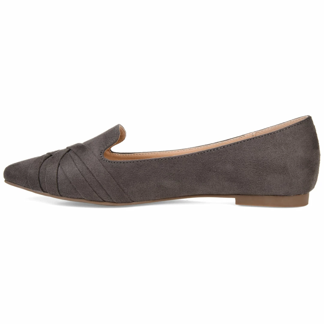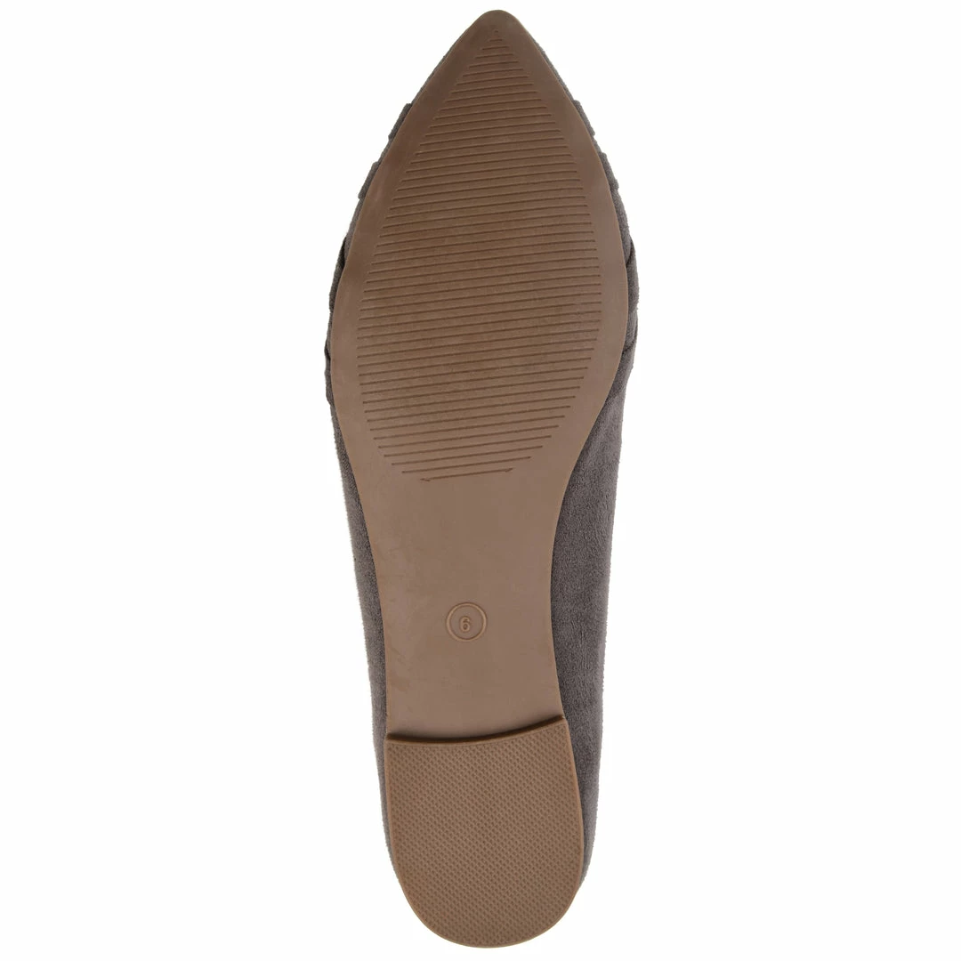 Step into a new style with the Mindee flat by Journee Collection. This shoe features faux suede material and has the perfect amount of stretch to it. The faux suede blend of the criss-cross pattern highlights this design, and the pointed toe adds the perfect touch. At Journee Collection, our flat styles will have you looking just as professional as the boss at work to having the cutest shoes when you go out for the night. Heel Height – 1/2-inch Heel Type – Block Heel Platform Height – 1/2-inch Shoe Width – Medium Closure Type – Slip-on Toe Style – Pointed Lining – Fabric Upper Material – Faux Suede Outersole Material – Man-made Footbed – Padded