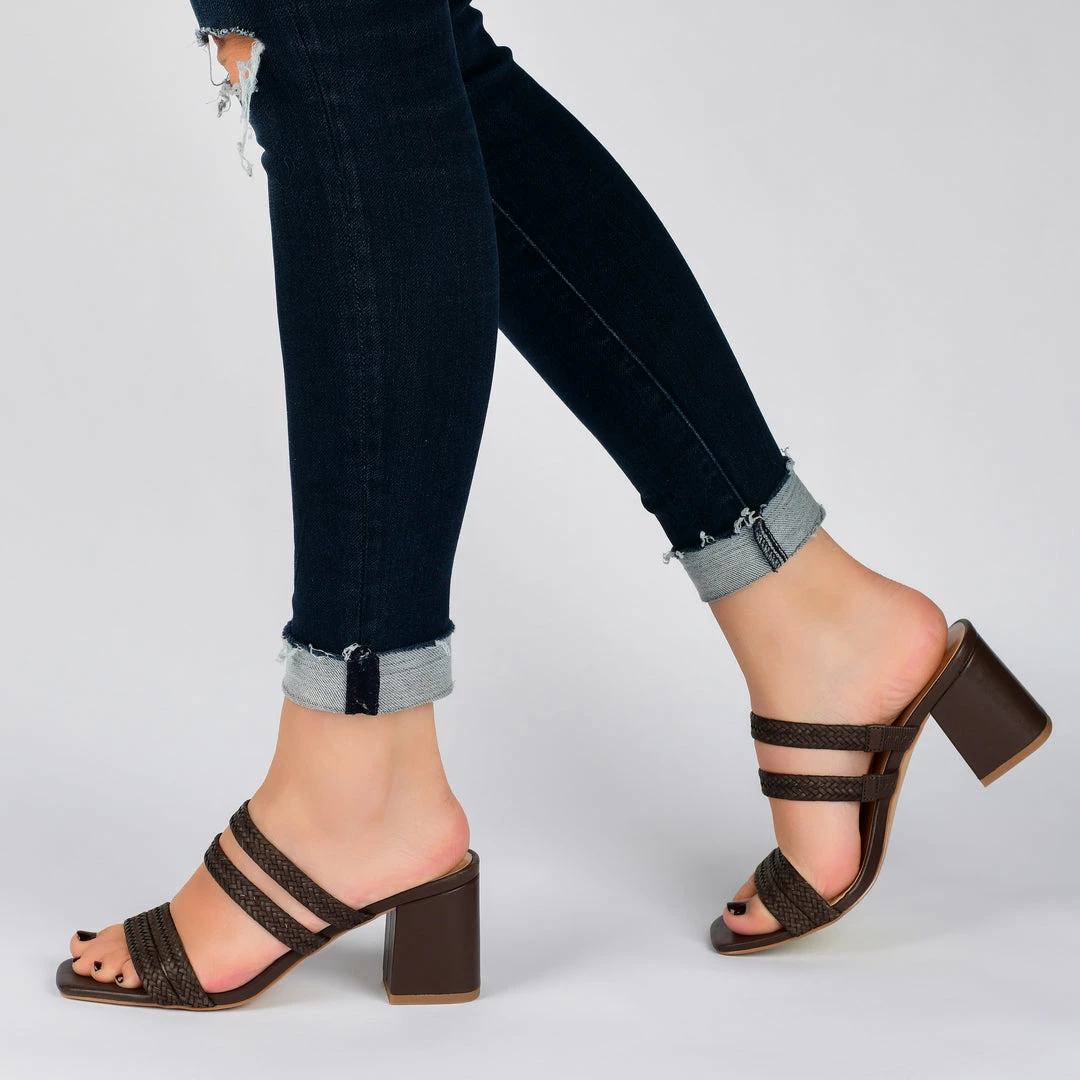 Treat your feet to something chic with the Natia by Journee Collection. Braided vegan leather straps shape these heeled sandals for a textured look. A padded footbed provides a comfortable fit, and a covered block heel elevates the design. Heel Height – 3-inch Heel Type – Block Heel Platform Height – Flat-inch Shoe Width – Medium Closure Type – Slip-on Strap Type – Multi -Strap Toe Style – Open Lining – Faux Leather Upper Material – Vegan Leather Outersole Material – Man-made Footbed – Padded