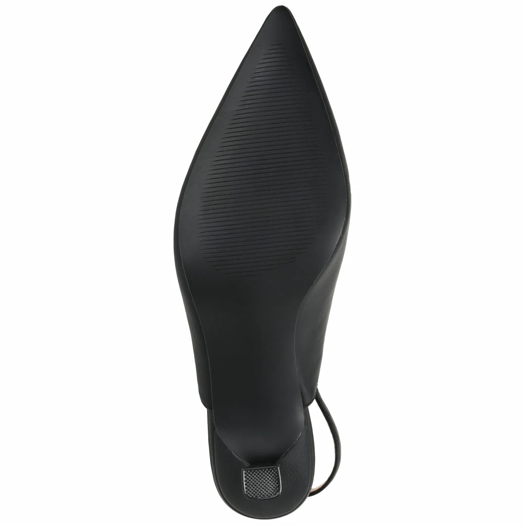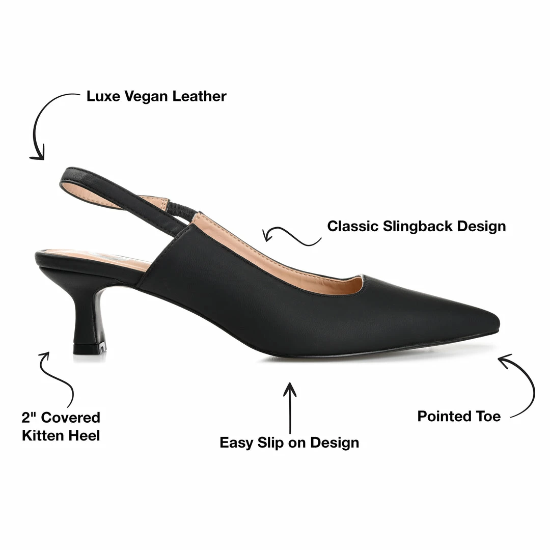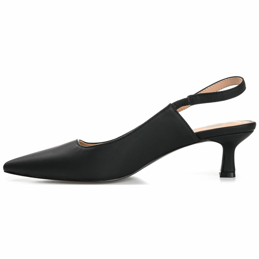 There isn’t an outfit the Paulina heels by Journee Collection can’t handle, from cocktail dresses to your comfiest skinny jeans. This pointed-toe silhouette features a soft padded footbed and lux vegan leather for a comfy fit. A sling-back strap and a tiny kitten heel complete this retro must-have look. Heel Height – 2-inch Heel Type – Kitten Heel Platform Height – Flat-inch Shoe Width – Medium Closure Type – Slip-on Strap Type – Ankle Toe Style – Pointed Lining – Faux Leather Upper Material – Vegan Leather Outersole Material – Man-made Footbed – Padded