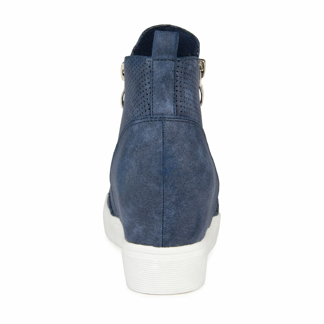 Need a lift? The Pennelope sneaker by Journee Collection features a lofty hidden wedge heel lined with a cushioned footbed for a comfortable elevation. Round perforations cover this vegan leather design, and silver tone zippers at the sides finish the look. Heel Height – 1 1/4-inch Heel Type – Hidden Wedge Platform Height – 1-inch Shaft Height – 4 1/2 inches Top Circumference – 11 inches Shoe Width – Medium Closure Type – Double Zip Toe Style – Round Lining – Fabric Upper Material – Vegan Leather Outersole Material – Man-made Footbed – Cushioned