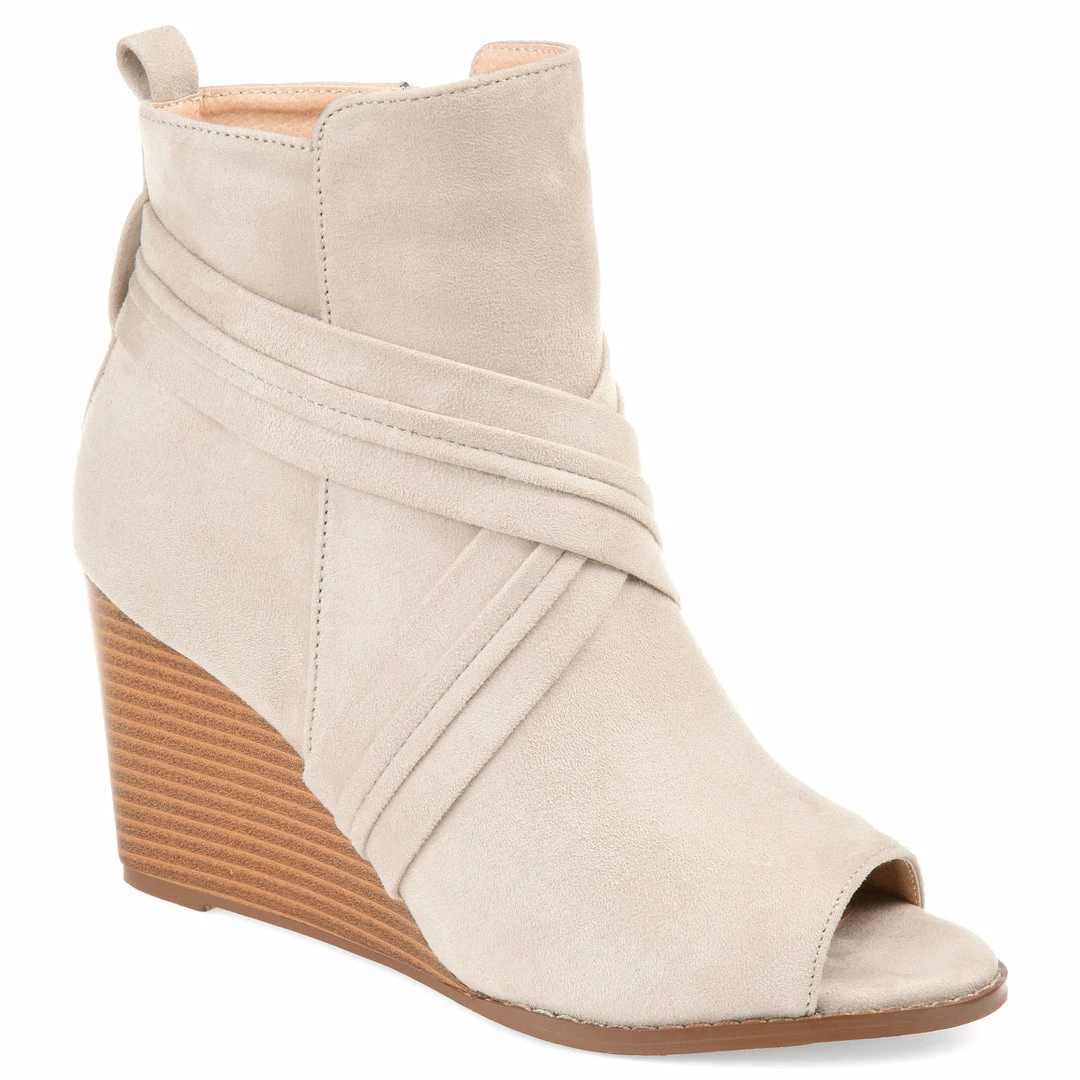 Show off chic booties style in open-toe booties by Journee Collection. These wedge booties are made with faux suede uppers and highlight an overlapping design. Stacked wedge high heels finish the look. Heel Height – 3 1/2-inch Heel Type – Wedge Platform Height – 1/2-inch Shaft Height – 4 inches Top Circumference – 10 1/2 inches Shoe Width – Medium Closure Type – Inside Zip Toe Style – Open Lining – Fabric Upper Material – Faux Suede Outersole Material – Man-made Footbed – Padded