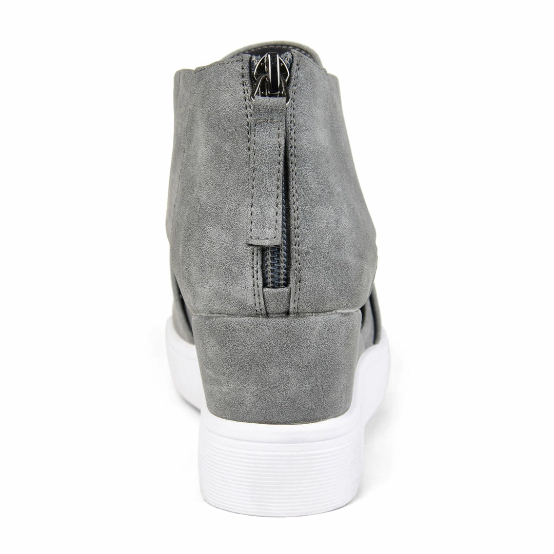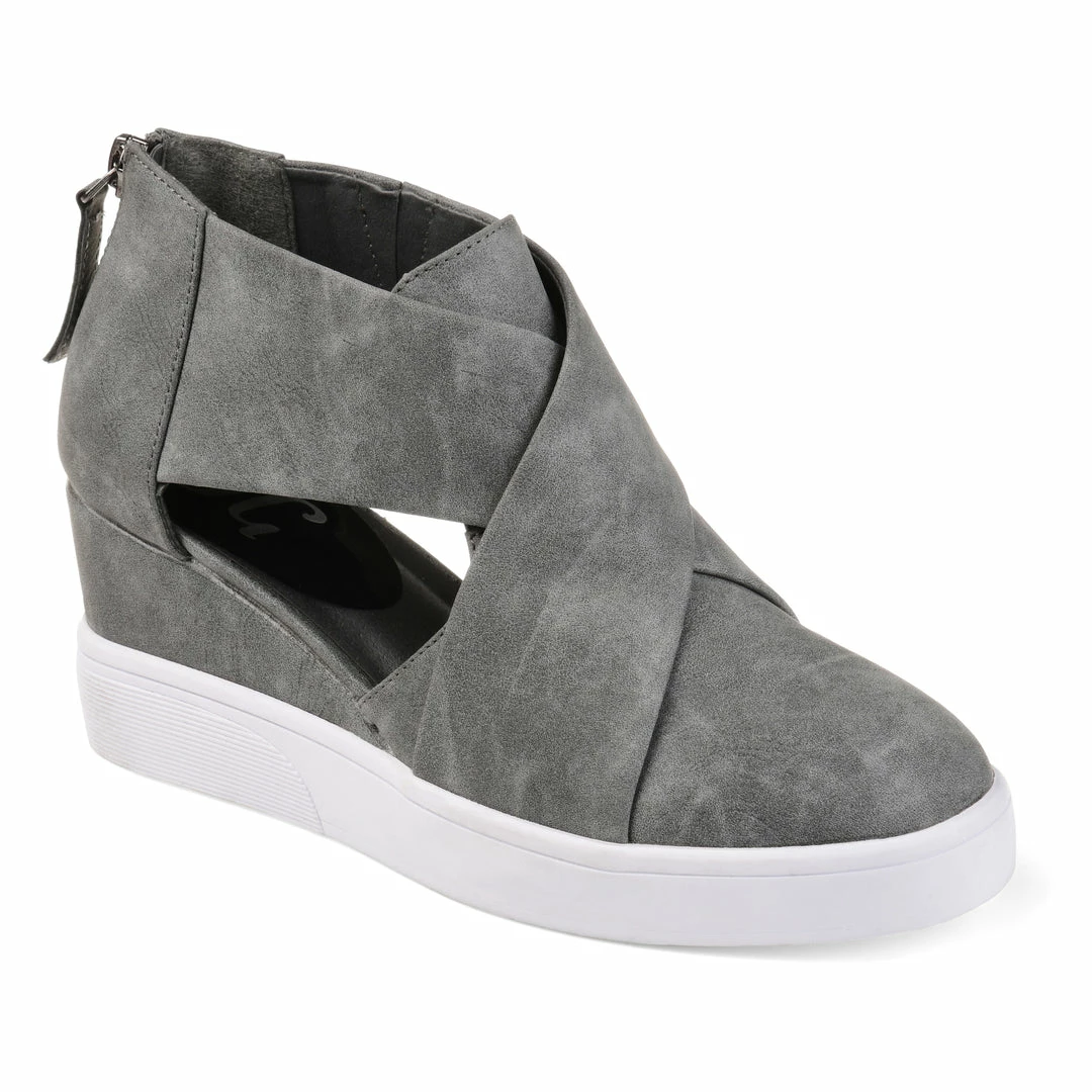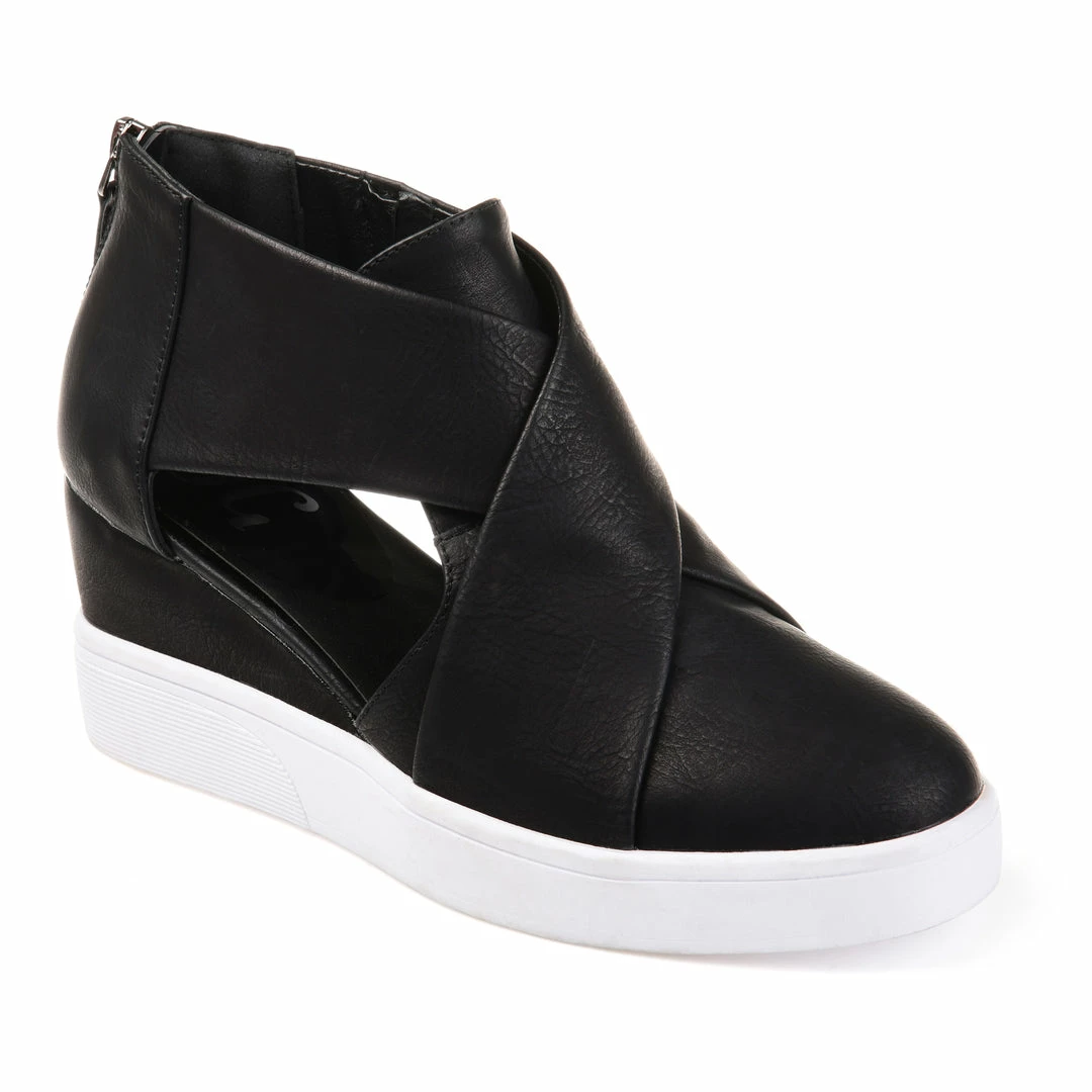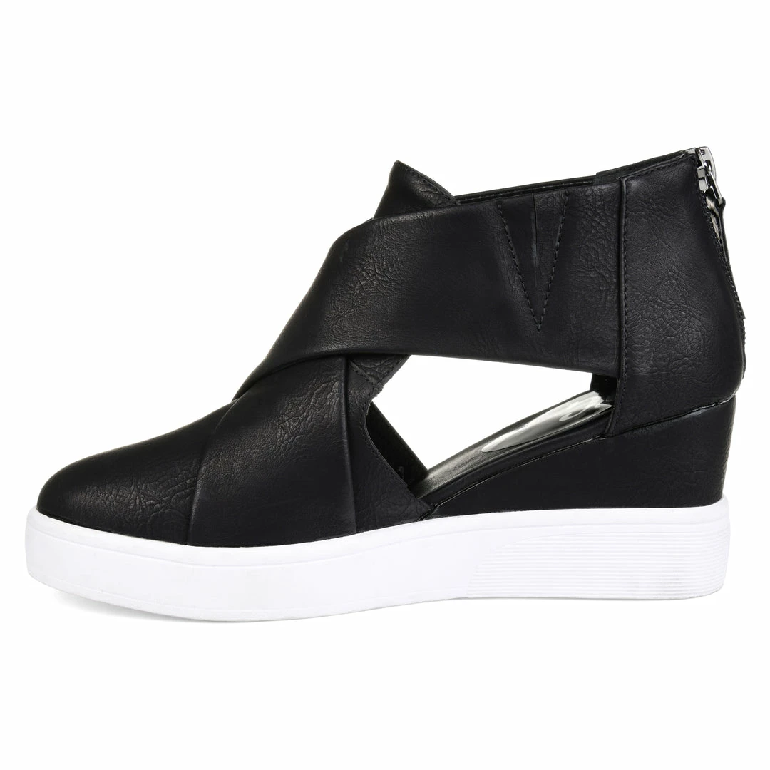 Look effortlessly cool in fashion sneakers from Journee Collection. Soft faux leather uppers display a crisscross design on the vamps and stylish D’Orsay cut-outs at the sides. Thick outsoles and wedge heels create stylish lift to finish the look Heel Height – 2 1/2-inch Heel Type – Wedge Platform Height – 1-inch Shoe Width – Medium Closure Type – Back Heel Zip Toe Style – Round Lining – Faux Leather Upper Material – Faux Leather Outersole Material – Man-made Footbed – Padded
