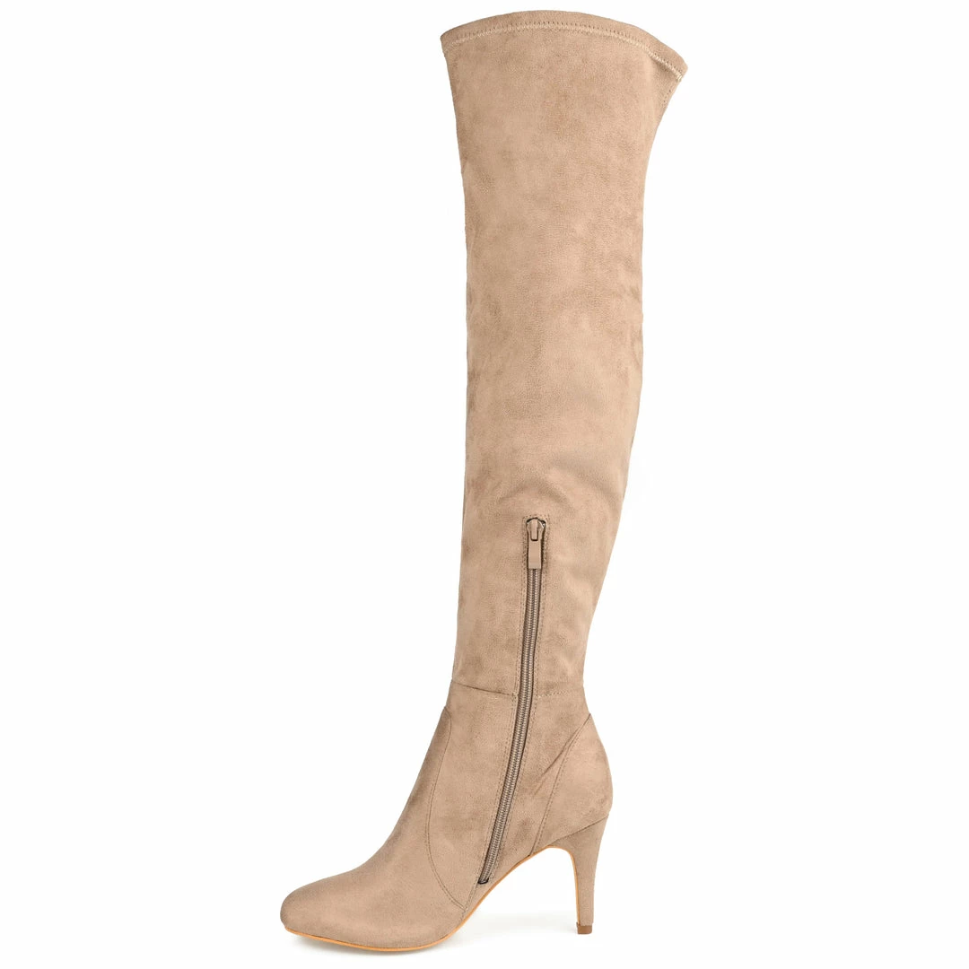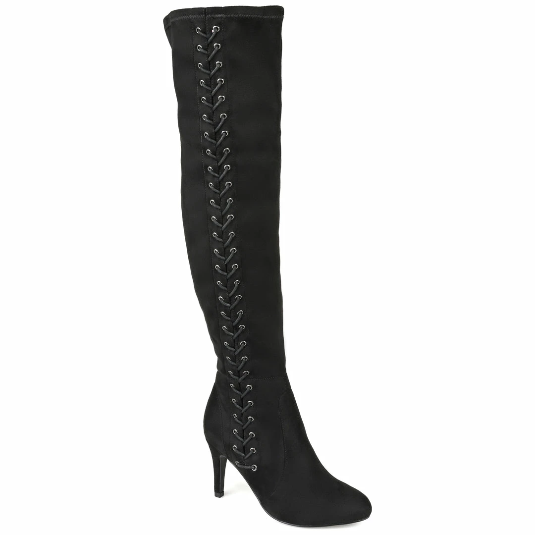 Surve up sass and class with the Abie boot by Journee Collection. Soft vegan leather uppers rise above the knees, detailed with a vintage-inspired lace-up design with metal accents. A covered high heel and a 4 mm Tru Comfort Foam™ insole complete this over-the-knee style. Heel Height – 3 1/2-inch Heel Type – Stiletto Platform Height – Flat-inch Shaft Height – 20 inches Calf Circumference – 14 inches Top Circumference – 15 1/2 inches Shoe Width – Medium Closure Type – Inside Zip Toe Style – Almond Lining – Fabric Upper Material – Vegan Leather Outersole Material – Man-made Footbed – 4 MM Tru Comfort Foam™