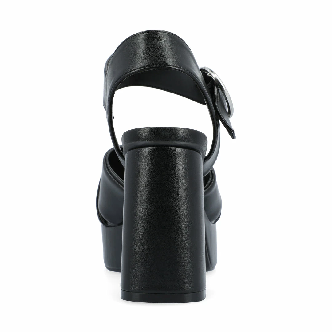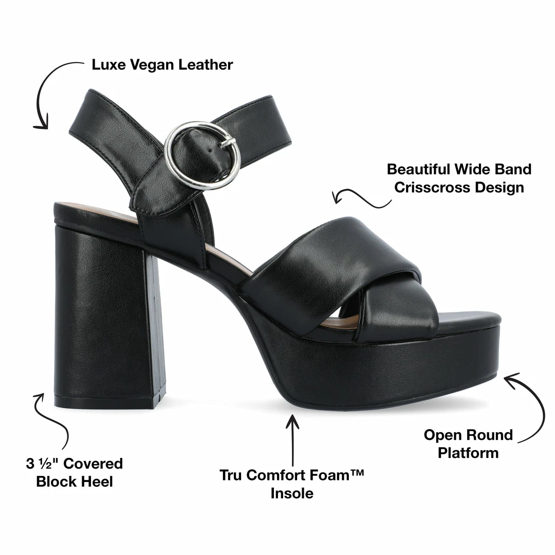 Our Akeely sandals from Journee Collection have a 4 mm Tru Comfort Foamβ’ insole that will leave your feet feeling more comfortable than before. The luxe vegan leather, platform, covered block heel, and crisscross straps will make you walk in style. Their open round toe will also add a lovely finishing touch to keep your outfit snatched. Heel Height – 3 1/2-inch Heel Type – Platform Platform Height – 1 1/4-inch Shoe Width – Medium Closure Type – Buckle Strap Type – Ankle Toe Style – Open Lining – Faux Leather Upper Material – Vegan Leather Outersole Material – Man-made Footbed – 4 MM Tru Comfort Foamβ’