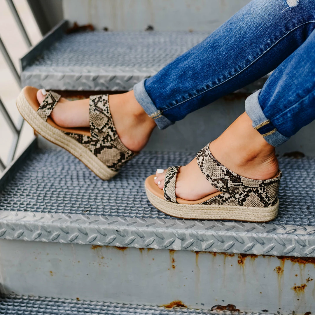 The Alissa features a chic design with a unique espadrille detail. The 3 .25″ wedge heel is covered in the same faux leather as the dual straps on the toe and foot, but the platform also features a beautiful espadrille design. A cushioned insole provides all-day comfort, and the slip-on design makes it simple to put on and kick off these gorgeous sandals. The Alissa is available in denim and snake patterns. Heel Height – 3 1/4-inch Heel Type – Wedge Platform Height – 1 1/2-inch Shoe Width – Medium Closure Type – Slip-on Strap Type – Multi -Strap Toe Style – Open Lining – Faux Leather Upper Material – Faux Leather Outersole Material – Synthetic Footbed – 4 MM Tru Comfort Foamโข