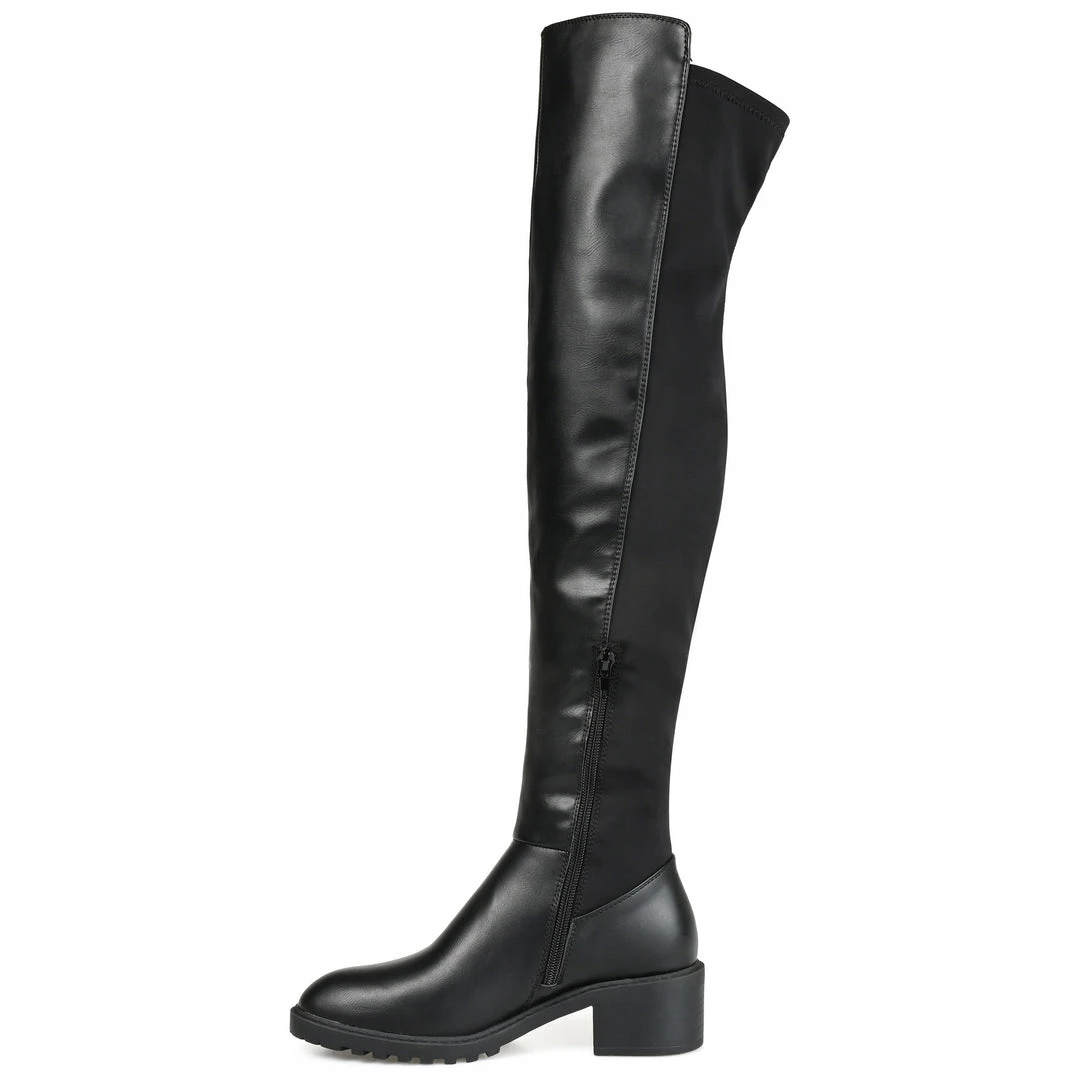Embrace your bold side in the Aryia boot by Journee Collection. Textured vegan leather uppers rise above the knees, detailed with a stretch gore accent and inside zipper. A chunky stacked heel and a 4 mm Tru Comfort Foamβ’ insole complete this over-the-knee style. Heel Height – 2-inch Heel Type – Stacked Platform Height – 1/2-inch Shaft Height – 20 inches Calf Circumference – 14 inches Top Circumference – 16 inches Shoe Width – Medium Closure Type – Inside Zip Toe Style – Almond Lining – Fabric Upper Material – Vegan Leather Outersole Material – Man-made Footbed – 4 MM Tru Comfort Foamβ’
