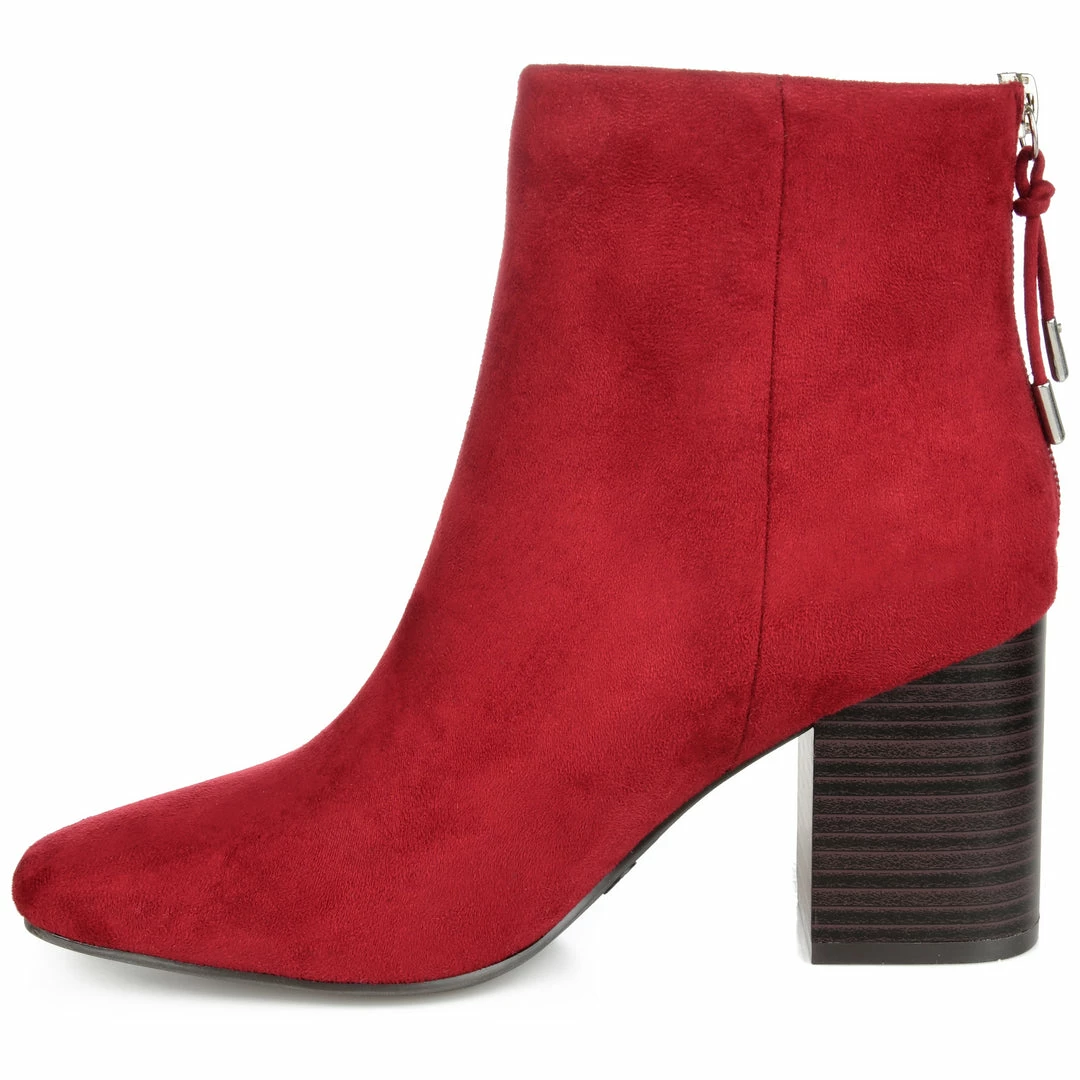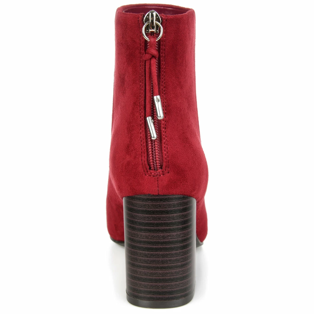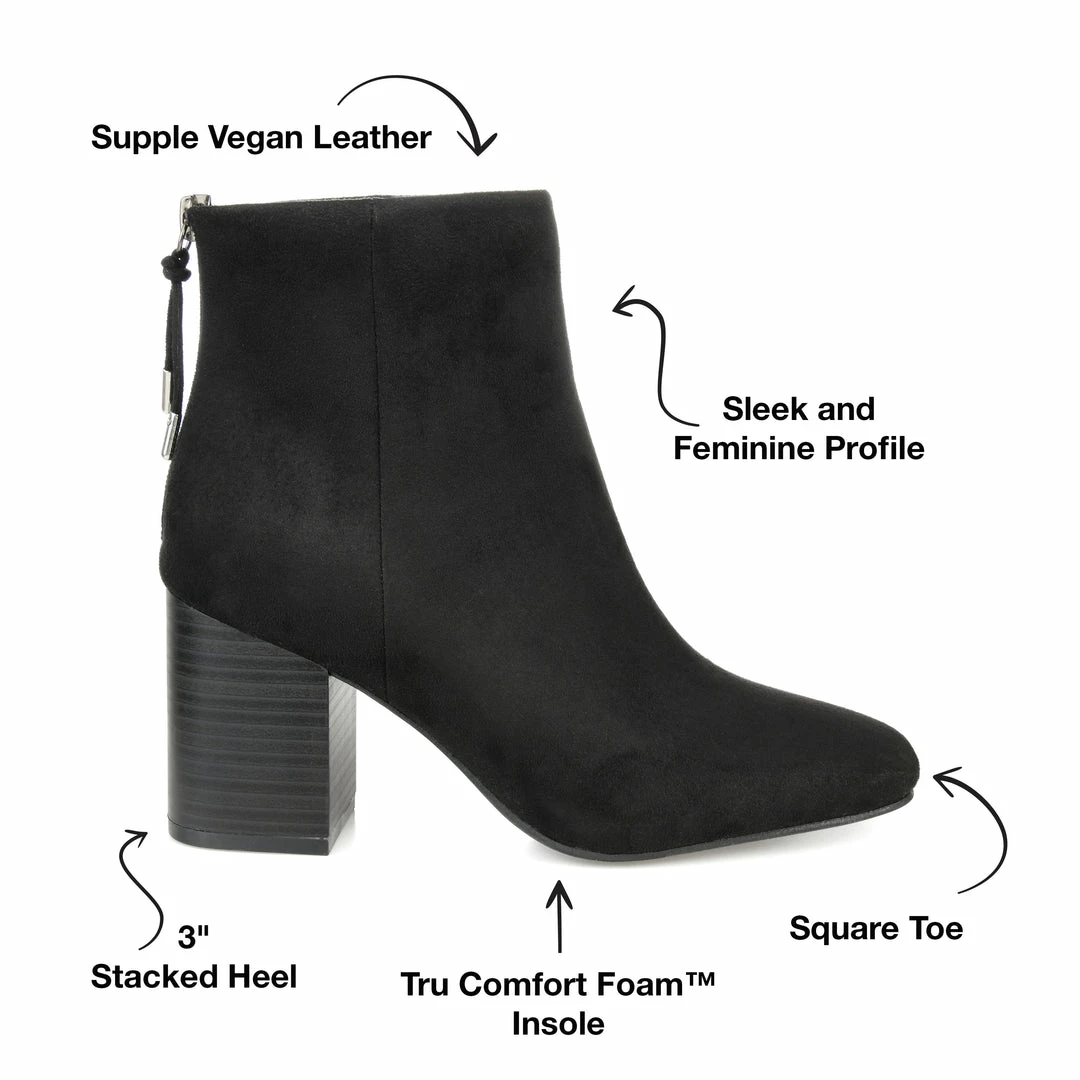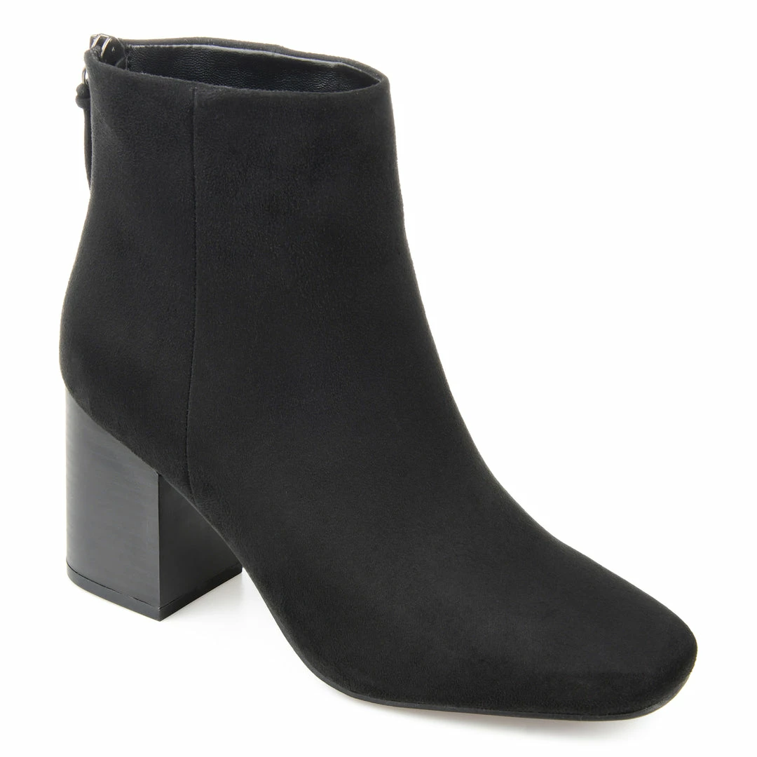 A basic classic by Journee Collection, the Audrina bootie. A lofty block heel adds a leg-lengthening lift, and soft vegan suede shapes this versatile square-toe silhouette. A back zipper entry makes them easy to slip on, and a 4 mm Tru Comfort Foamβ’ insole finishes the design. Heel Height – 3-inch Heel Type – Stacked Platform Height – Flat-inch Shaft Height – 4 1/2 inches Top Circumference – 10 1/2 inches Shoe Width – Medium Closure Type – Back Heel Zip Toe Style – Square Lining – Fabric Upper Material – Vegan Leather Outersole Material – Man-made Footbed – 4 MM Tru Comfort Foamβ’