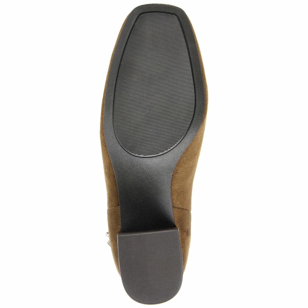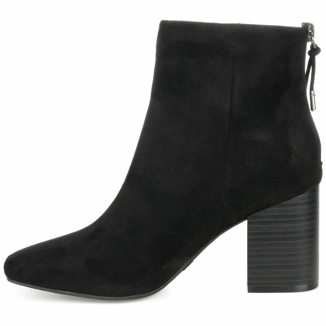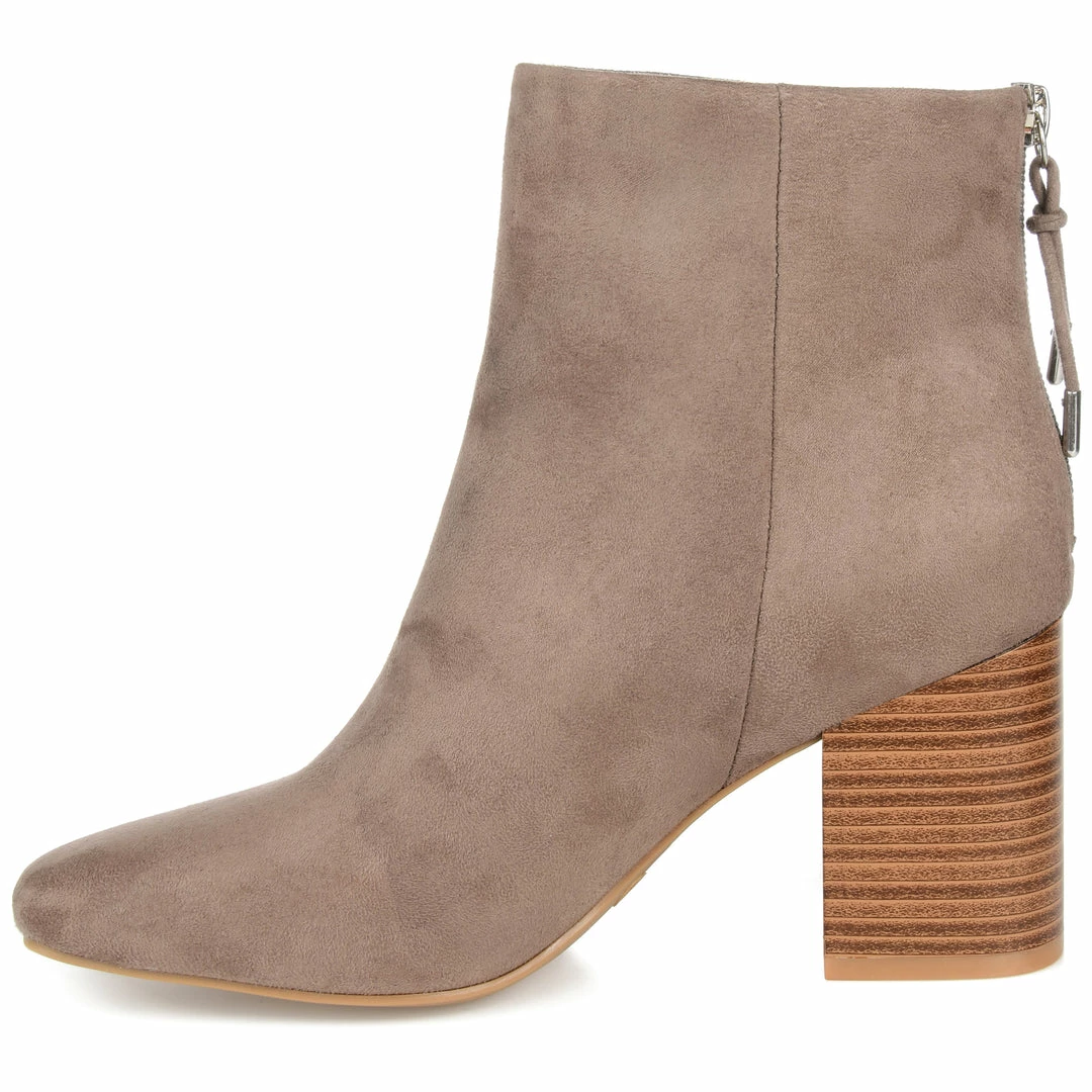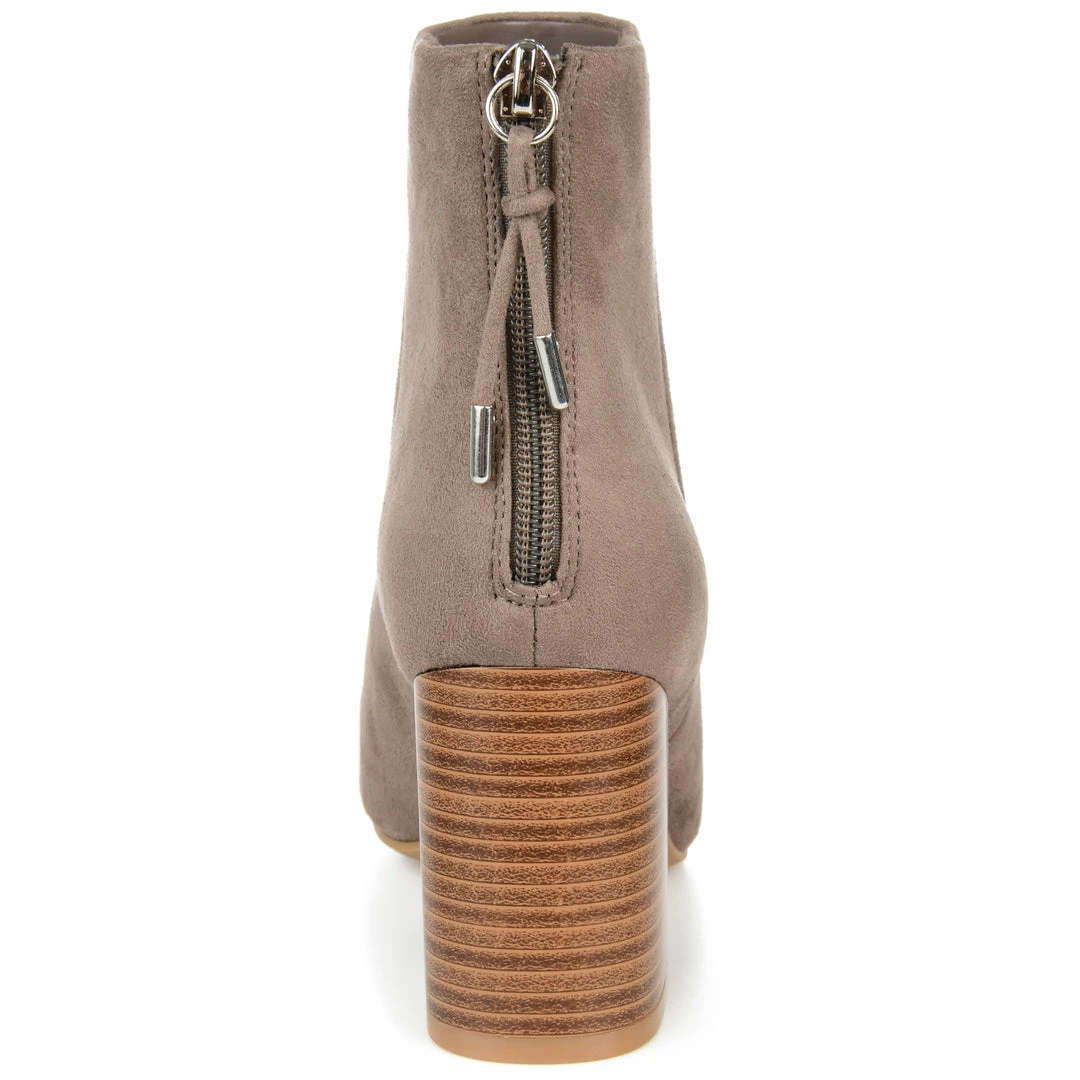A basic classic by Journee Collection, the Audrina bootie. A lofty block heel adds a leg-lengthening lift, and soft vegan suede shapes this versatile square-toe silhouette. A back zipper entry makes them easy to slip on, and a 4 mm Tru Comfort Foamβ’ insole finishes the design. Heel Height – 3-inch Heel Type – Stacked Platform Height – Flat-inch Shaft Height – 4 1/2 inches Top Circumference – 10 1/2 inches Shoe Width – Medium Closure Type – Back Heel Zip Toe Style – Square Lining – Fabric Upper Material – Vegan Leather Outersole Material – Man-made Footbed – 4 MM Tru Comfort Foamβ’