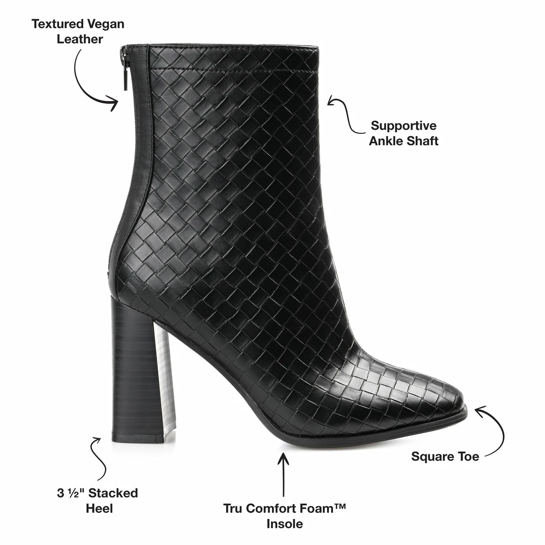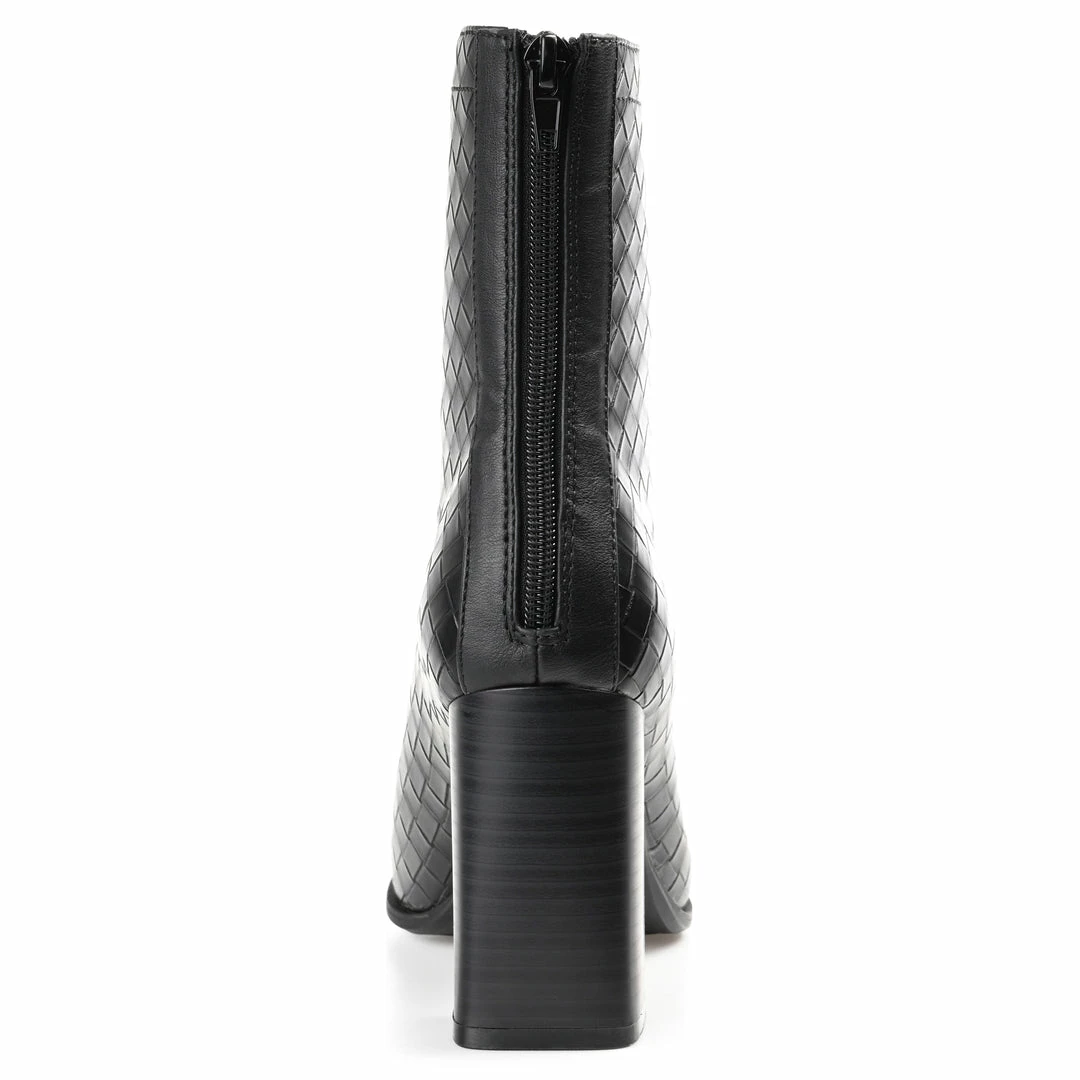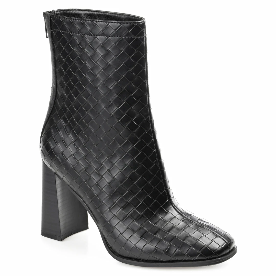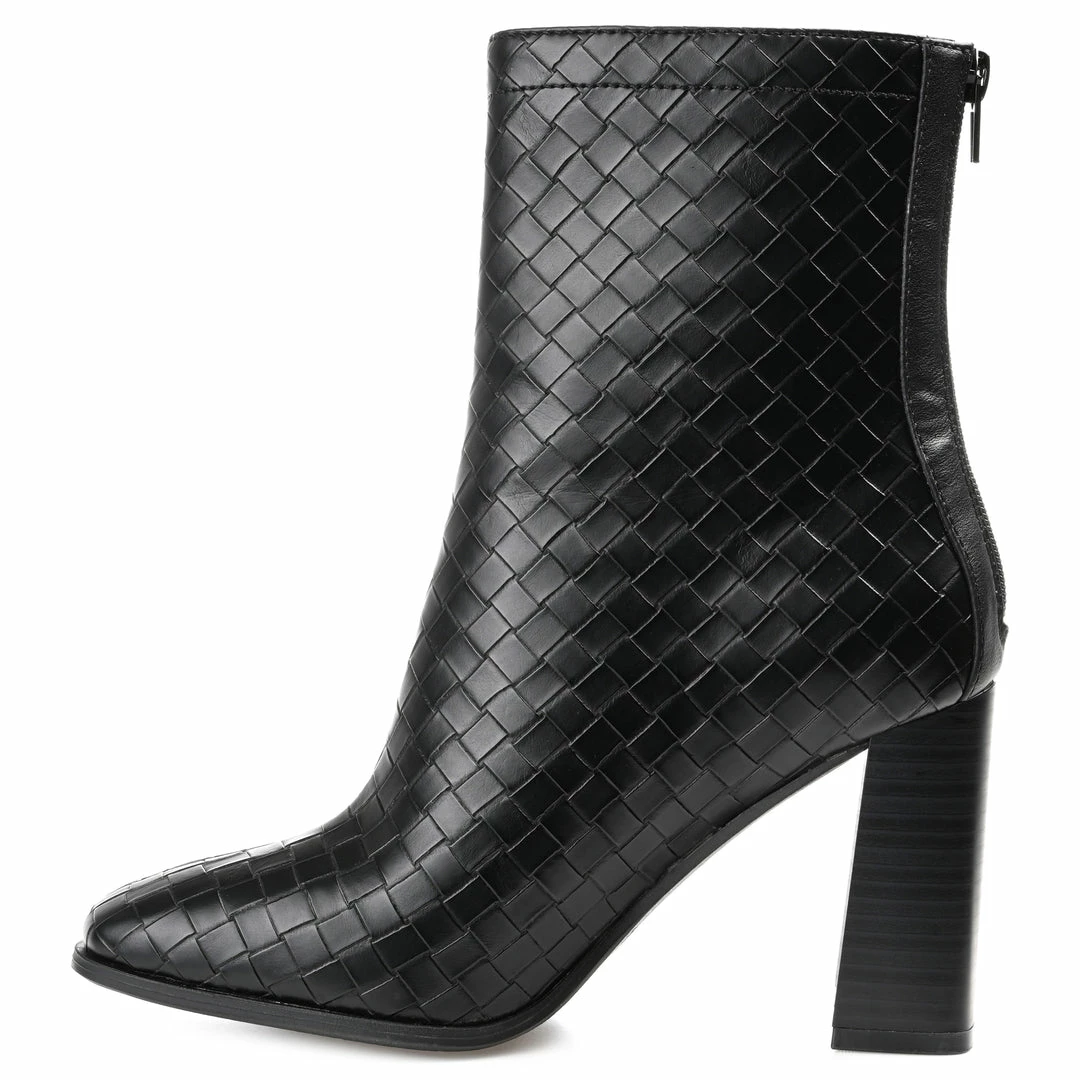 A look borrowed from the runway, the Brielle by Journee Collection. These modern booties feature woven textured leather uppers detailed with a square-toe and chunky block heel. A 4 mm Tru Comfort Foamβ’ insole makes them a breeze to walk in, and a back zipper detail at the ankle makes them easy to pull on. Heel Height – 3 1/2-inch Heel Type – Stacked Platform Height – Flat-inch Shaft Height – 6 inches Top Circumference – 10 1/2 inches Shoe Width – Medium Closure Type – Back Heel Zip Toe Style – Square Lining – Fabric Upper Material – Vegan Leather Outersole Material – Man-made Footbed – 4 MM Tru Comfort Foamβ’