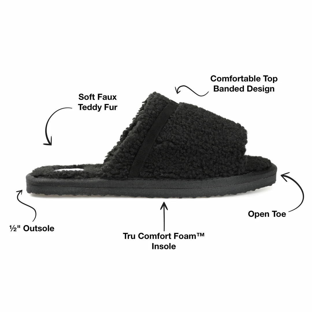 Relax after a long day in the Caterina slipper by Journee Collection. This slide-on design features snuggly teddy bear fur and a 4 mm Tru Comfort Foamβ’ footbed. A banded detail and an open toe perfect the look. Heel Height – 1/2-inch Heel Type – Sole Platform Height – 1/2-inch Shoe Width – Medium Closure Type – Slip-on Toe Style – Open Lining – Fabric Upper Material – Faux Fur Outersole Material – Man-made Footbed – 4 MM Tru Comfort Foamβ’