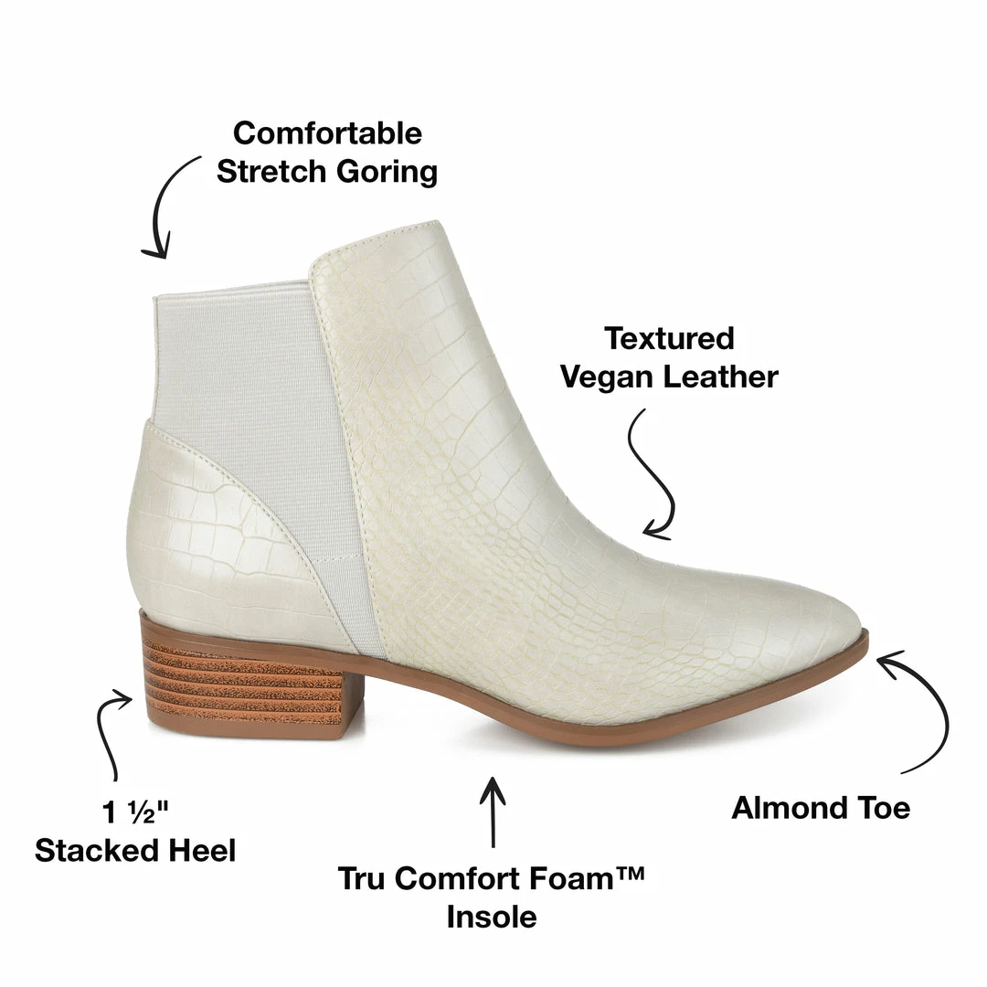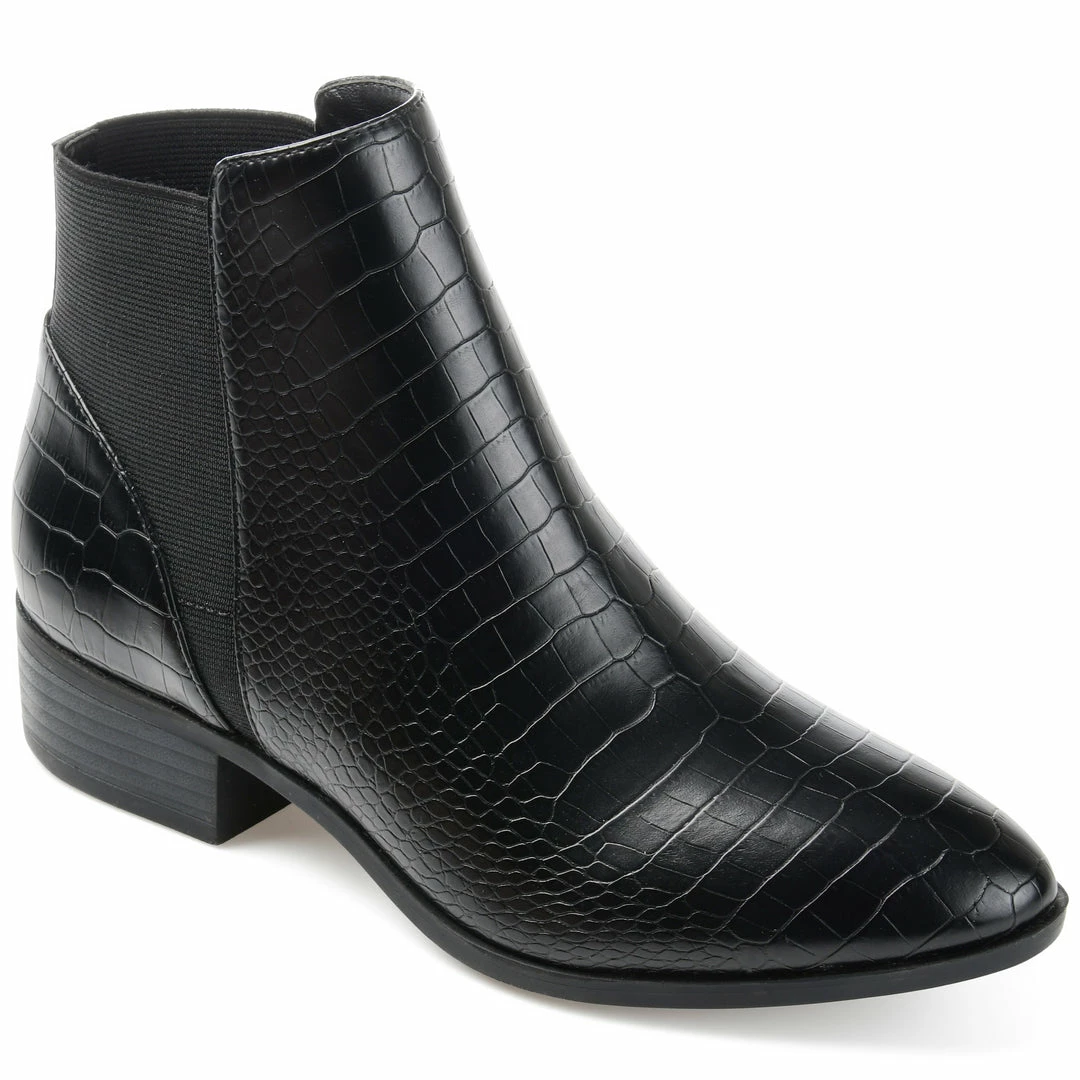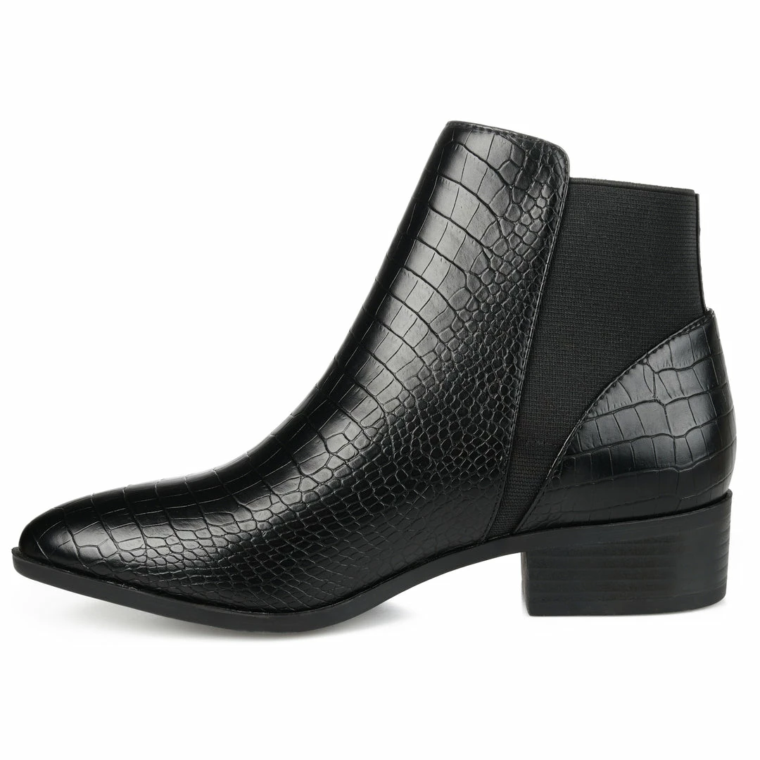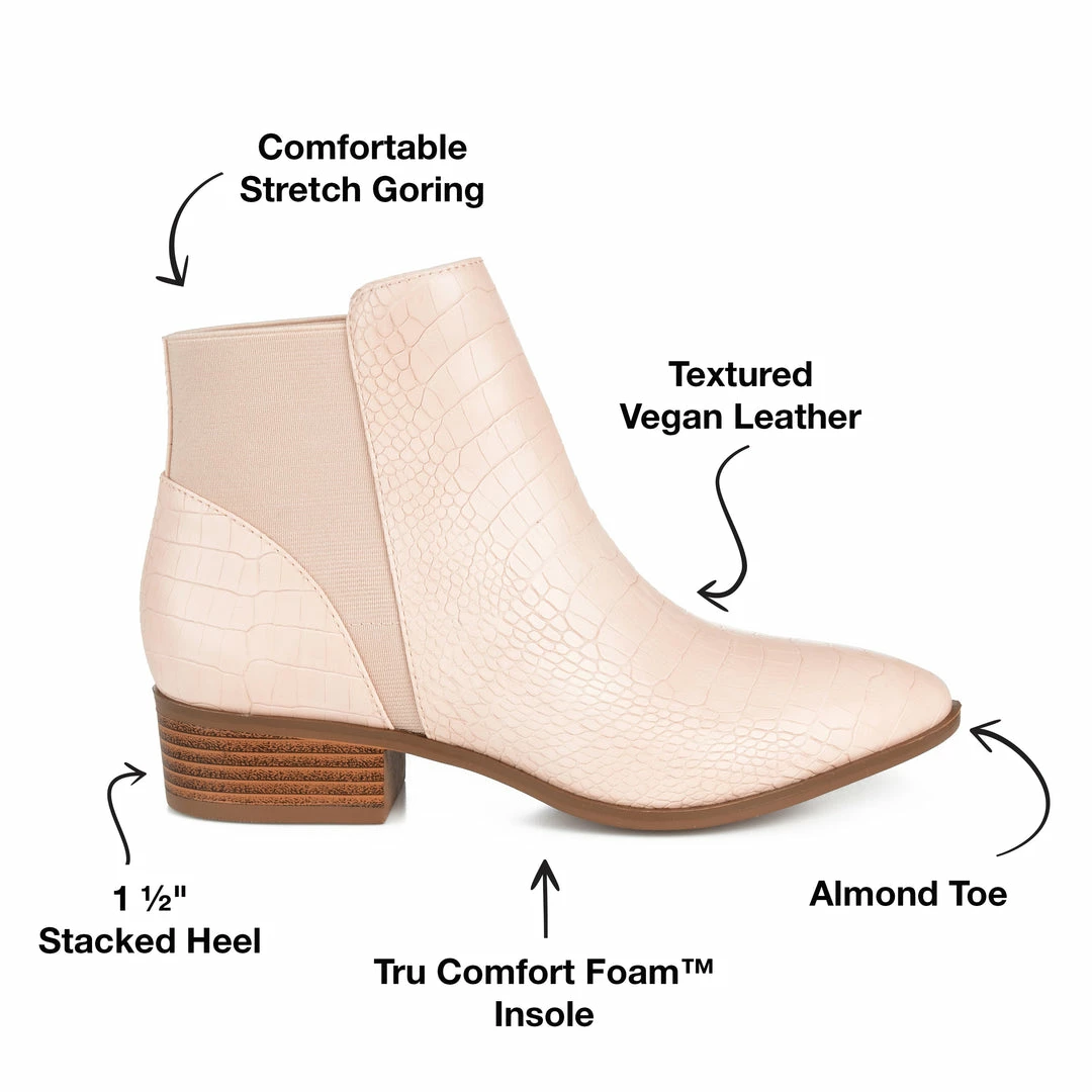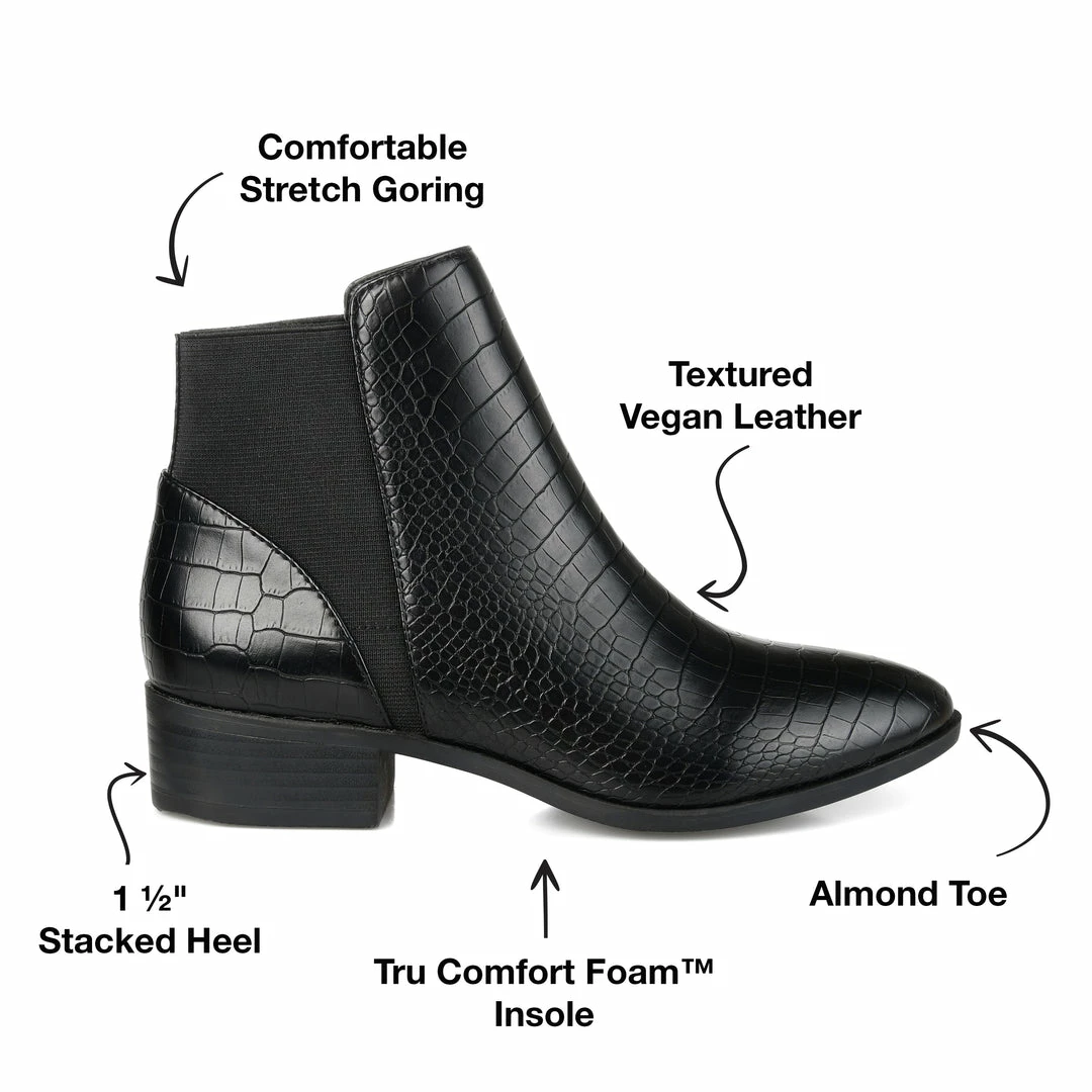 Subtly chic details shape the Cerise bootie by Journee Collection. This almond-toe bootie features a modern stretch gore panel and croc textured vegan leather uppers. A low stacked heel paired with a 4 mm Tru Comfort Foamβ’ footbed finish, this must-have look for a comfortable fit. Heel Height – 1 1/2-inch Heel Type – Stacked Platform Height – Flat-inch Shaft Height – 4 inches Top Circumference – 9 1/2 inches Shoe Width – Medium Closure Type – Pull-on Toe Style – Almond Lining – Fabric Upper Material – Vegan Leather Outersole Material – Man-made Footbed – 4 MM Tru Comfort Foamβ’