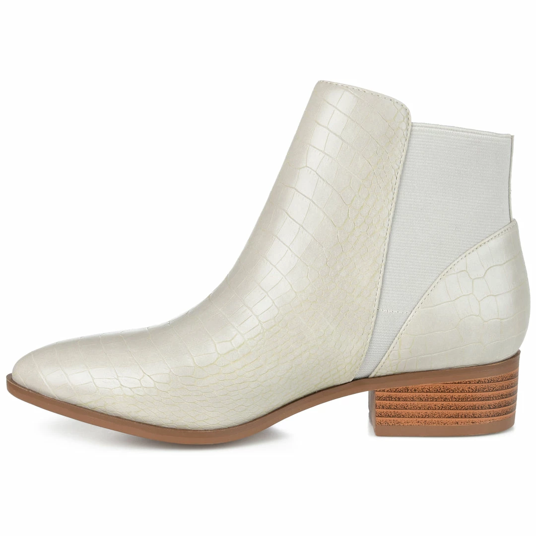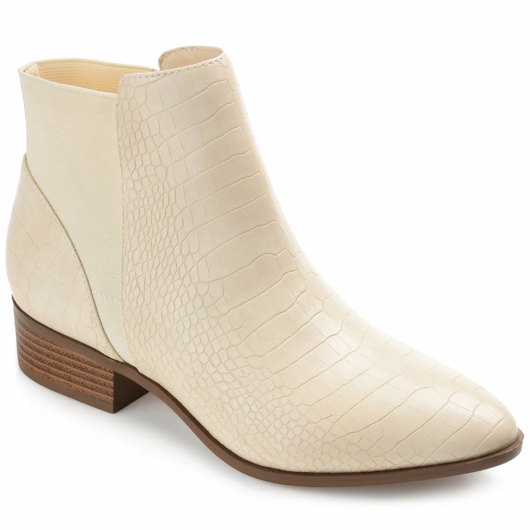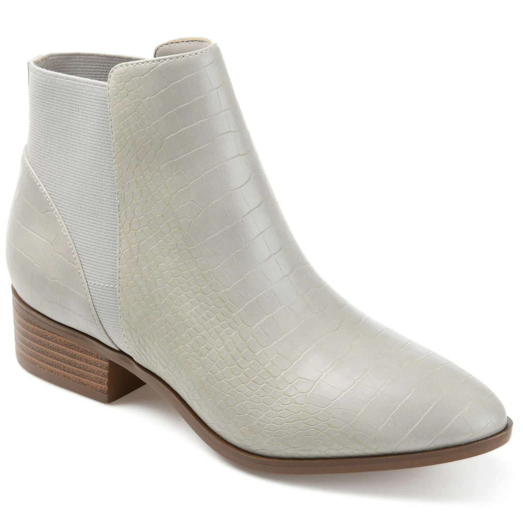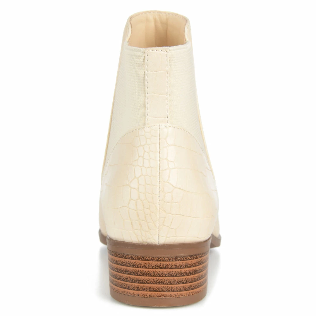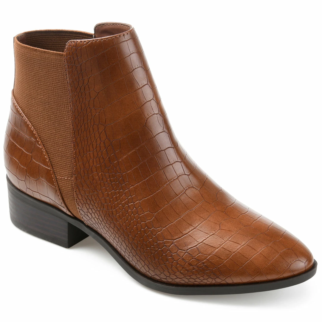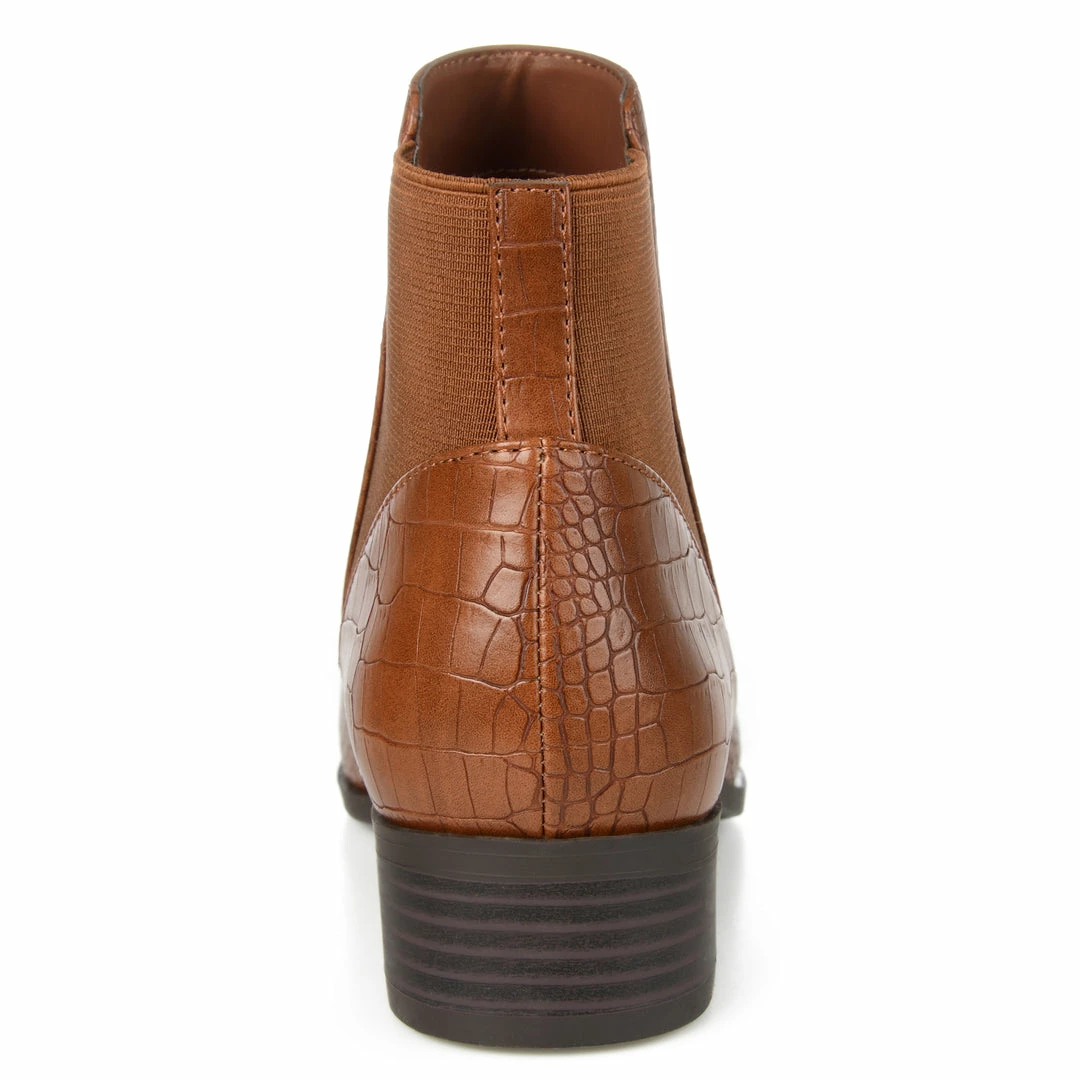 Subtly chic details shape the Cerise bootie by Journee Collection. This almond-toe bootie features a modern stretch gore panel and croc textured vegan leather uppers. A low stacked heel paired with a 4 mm Tru Comfort Foamβ’ footbed finish, this must-have look for a comfortable fit. Heel Height – 1 1/2-inch Heel Type – Stacked Platform Height – Flat-inch Shaft Height – 4 inches Top Circumference – 9 1/2 inches Shoe Width – Medium Closure Type – Pull-on Toe Style – Almond Lining – Fabric Upper Material – Vegan Leather Outersole Material – Man-made Footbed – 4 MM Tru Comfort Foamβ’