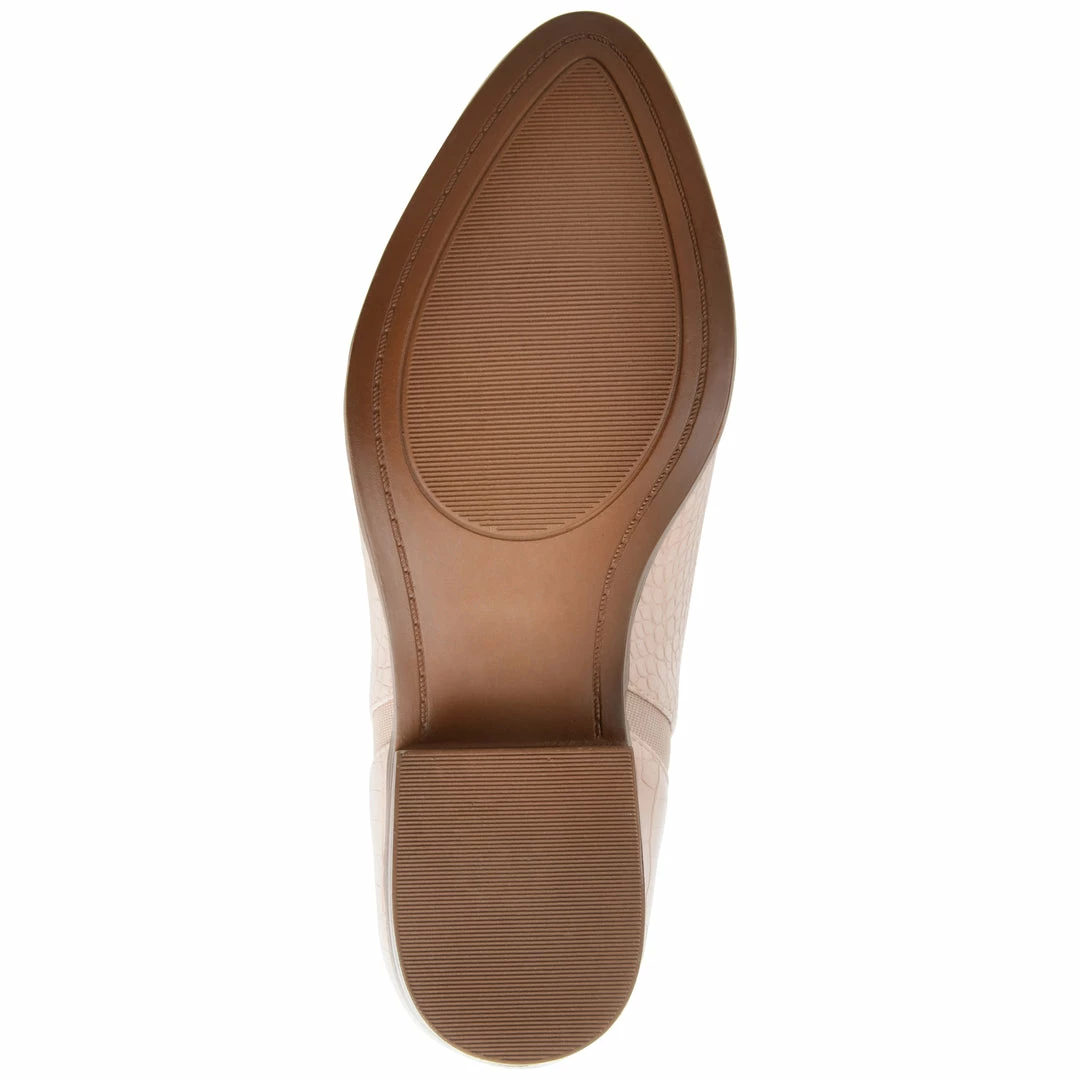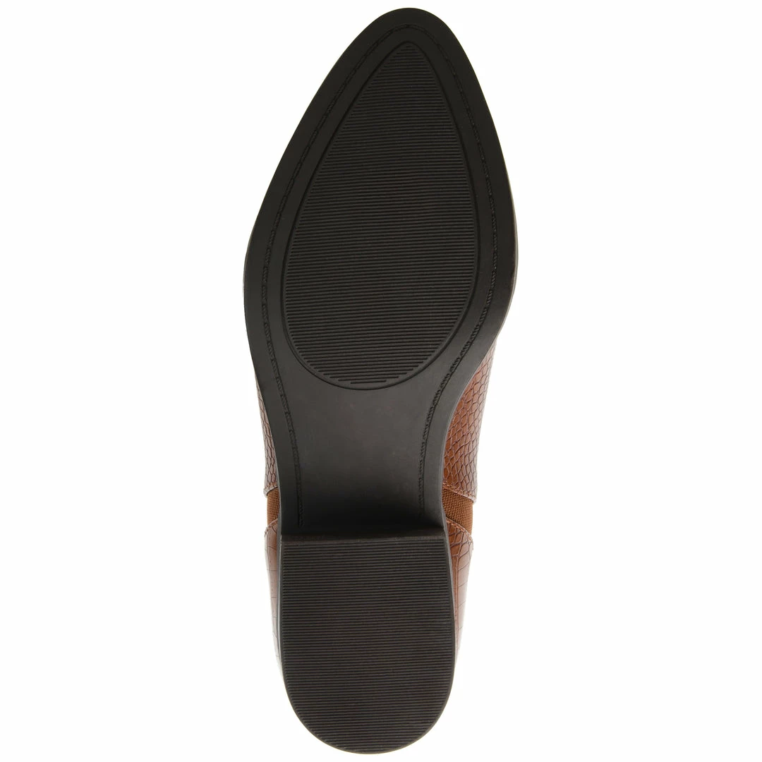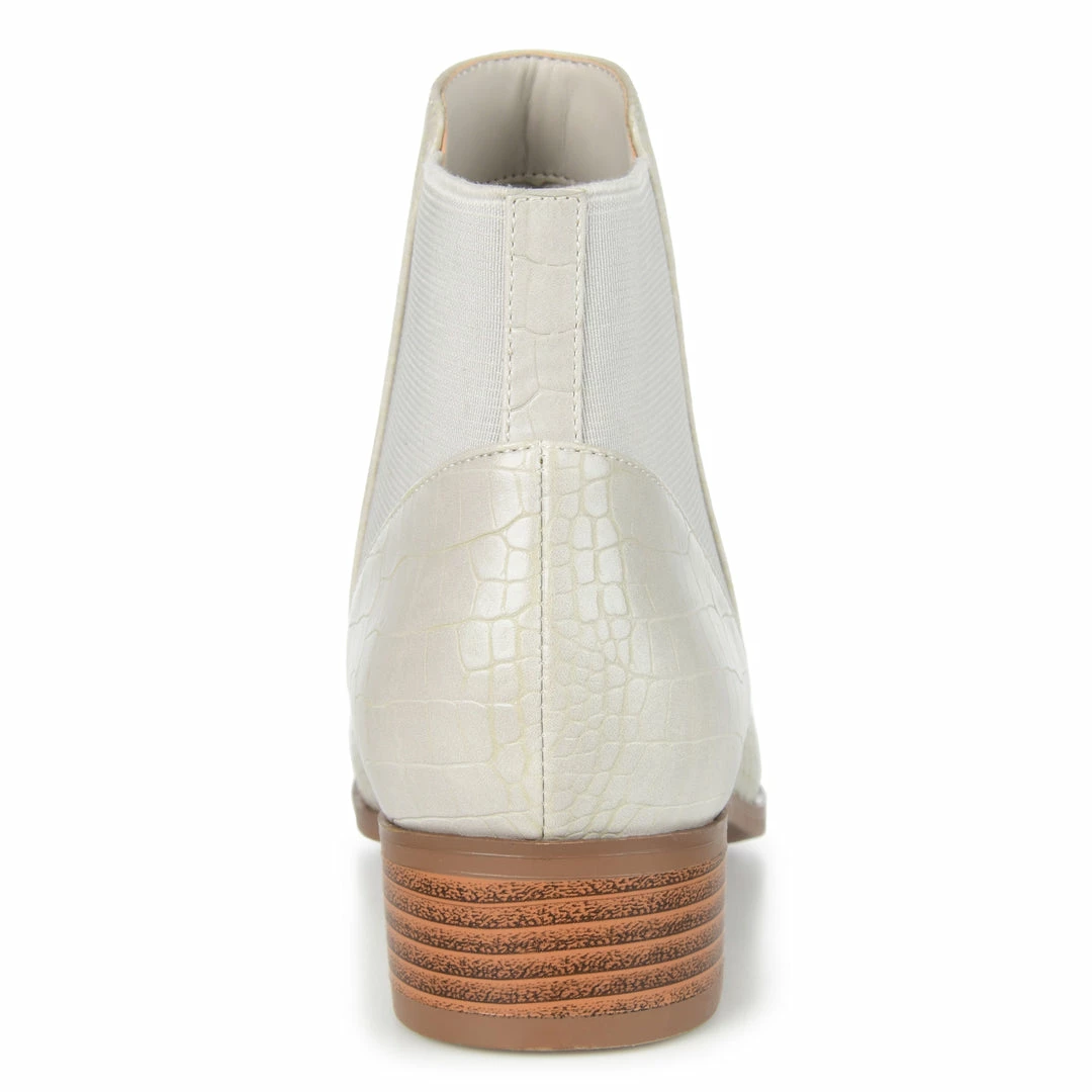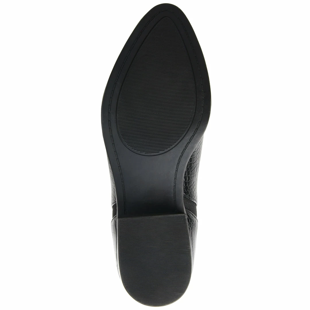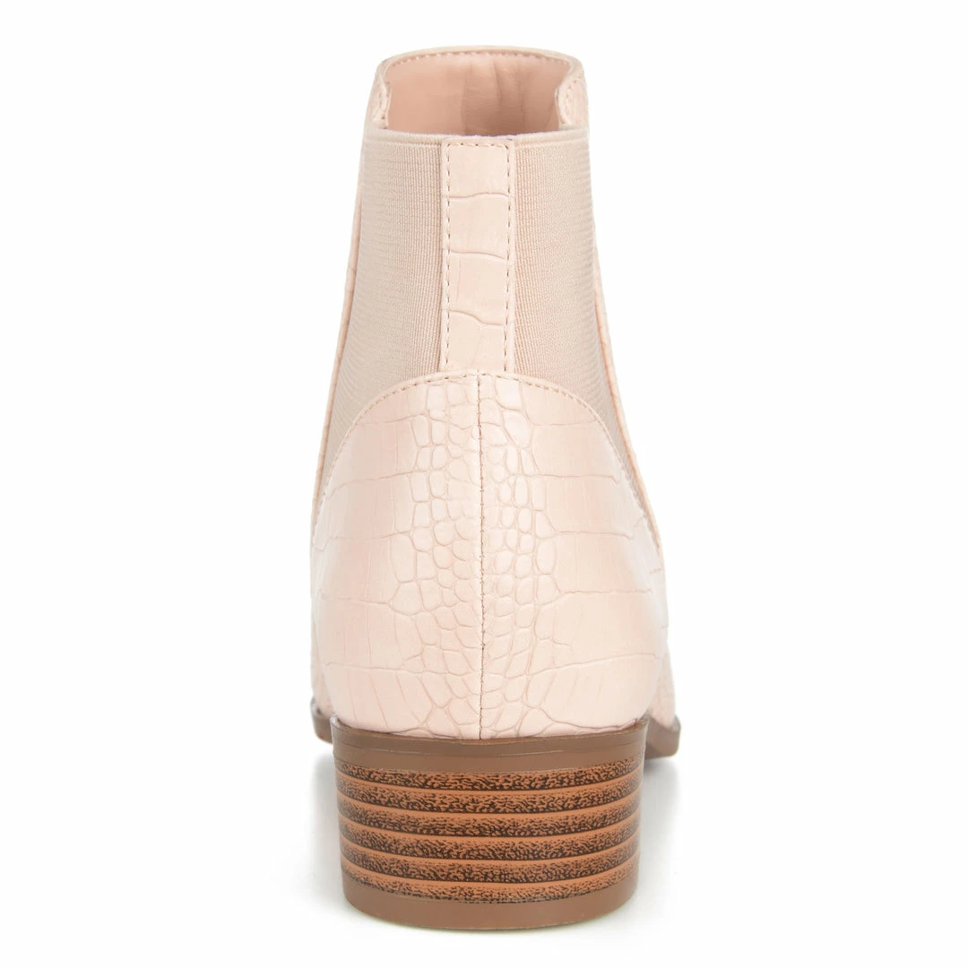 Subtly chic details shape the Cerise bootie by Journee Collection. This almond-toe bootie features a modern stretch gore panel and croc textured vegan leather uppers. A low stacked heel paired with a 4 mm Tru Comfort Foamβ’ footbed finish, this must-have look for a comfortable fit. Heel Height – 1 1/2-inch Heel Type – Stacked Platform Height – Flat-inch Shaft Height – 4 inches Top Circumference – 9 1/2 inches Shoe Width – Medium Closure Type – Pull-on Toe Style – Almond Lining – Fabric Upper Material – Vegan Leather Outersole Material – Man-made Footbed – 4 MM Tru Comfort Foamβ’