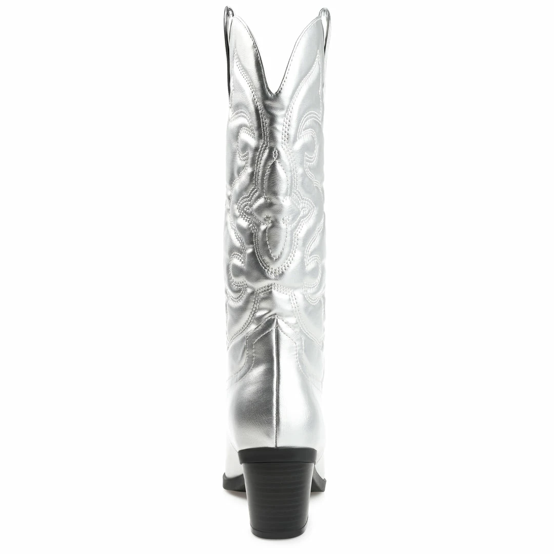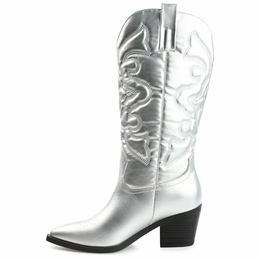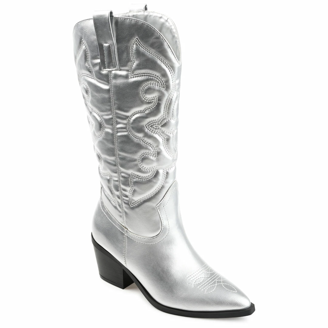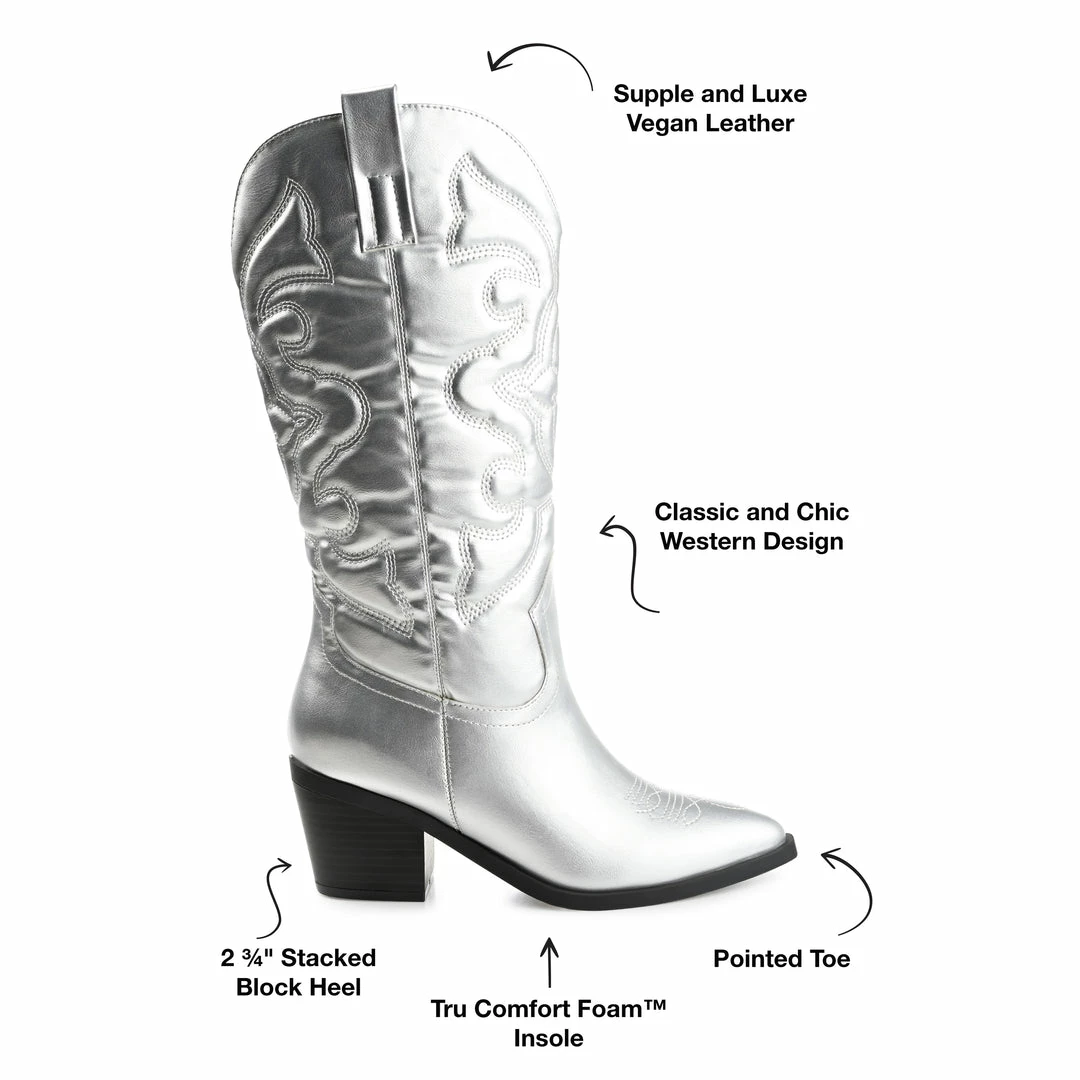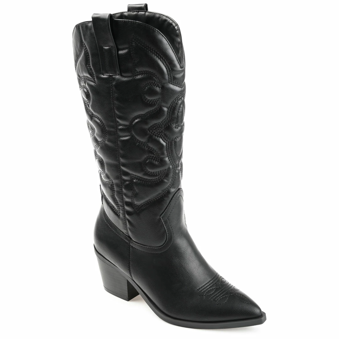 A classic cowgirl bootie reimagined for the modern fashionista, the Chantry by Journee Collection. This pointed-toe boot with western stitch details and soft vegan leather is the most stylish way to embrace your country roots. A block heel and a 4 mm Tru Comfort Foamโข footbed add comfortable height to this mid-calf design. Heel Height – 2 3/4-inch Heel Type – Stacked Platform Height – 1/2-inch Shaft Height – 12 inches Calf Circumference – 14 1/2 inches Top Circumference – 14 1/2 inches Shoe Width – Medium Closure Type – Pull-on Toe Style – Pointed Lining – Fabric Upper Material – Vegan Leather Outersole Material – Man-made Footbed – 4 MM Tru Comfort Foamโข