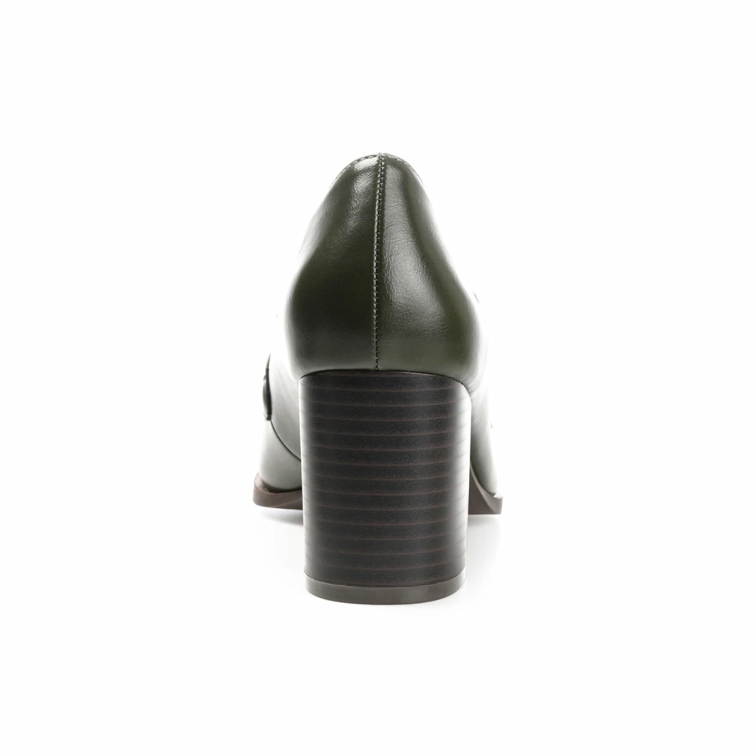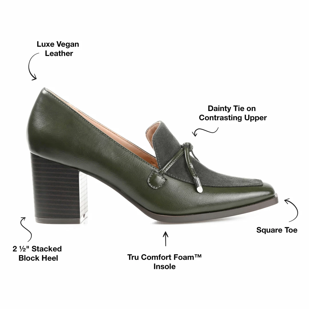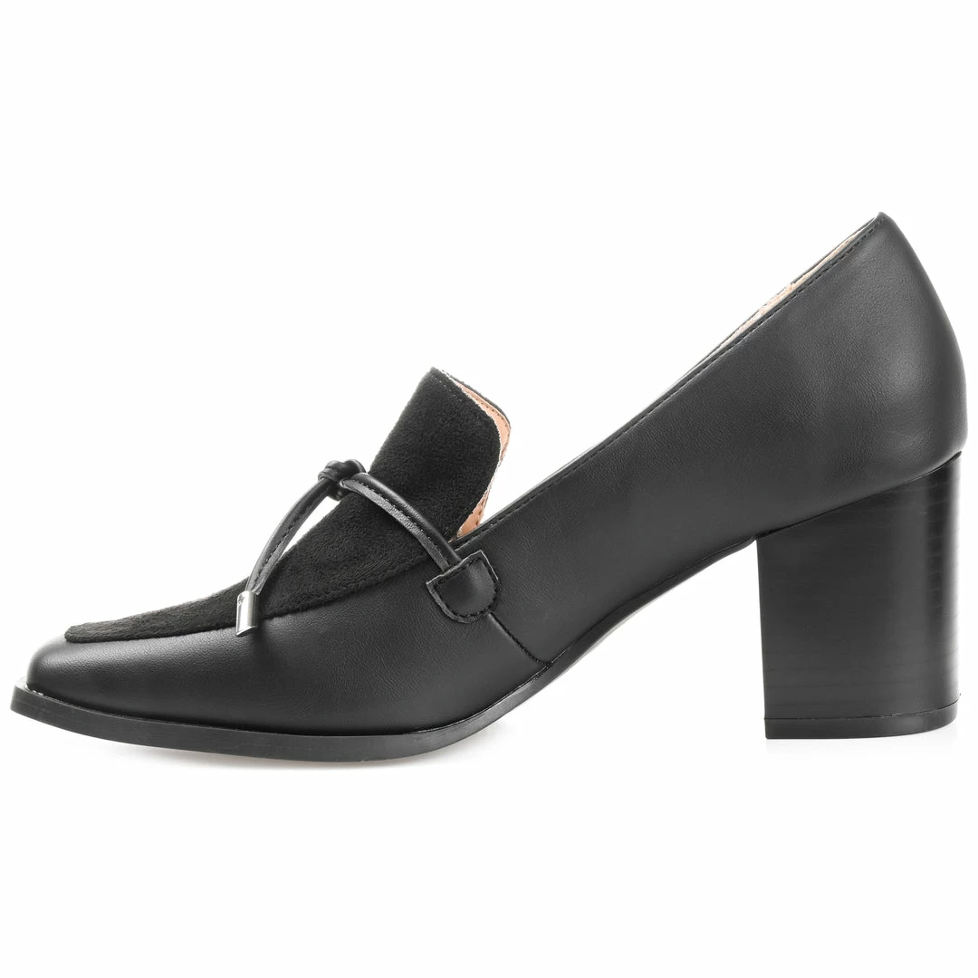 A bow on a loafer, what could be better? The Crawford by Journee Collection is topped with a tiny bow accent complimented by a square-toe and two-tone detail. A block heel lined with a 4 mm Tru Comfort Foamβ’ elevates the design, and vegan leather shapes the look. Heel Height – 2 1/2-inch Heel Type – Stacked Platform Height – Flat-inch Shoe Width – Medium Closure Type – Slip-on Toe Style – Square Lining – Fabric Upper Material – Vegan Leather Outersole Material – Man-made Footbed – 4 MM Tru Comfort Foamβ’