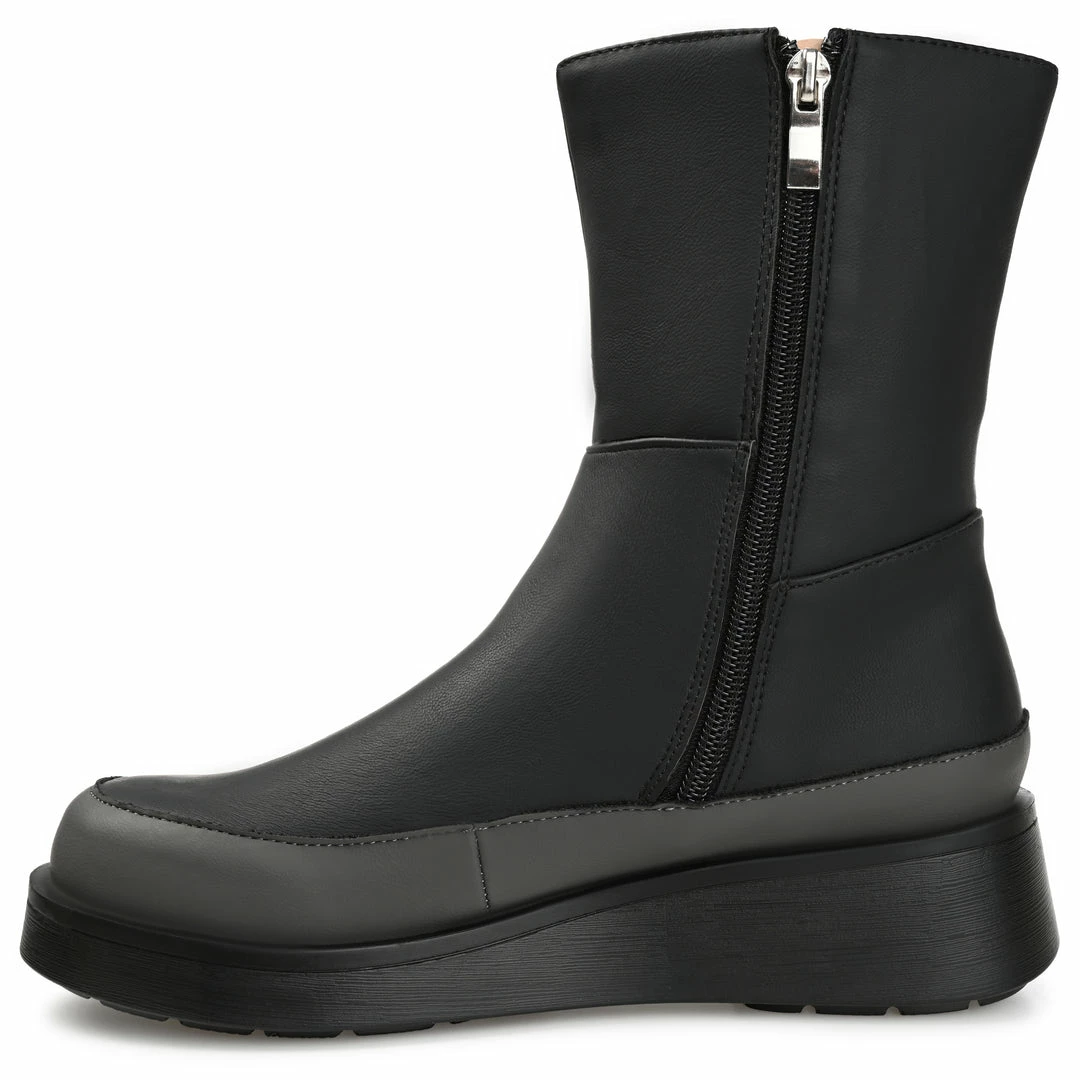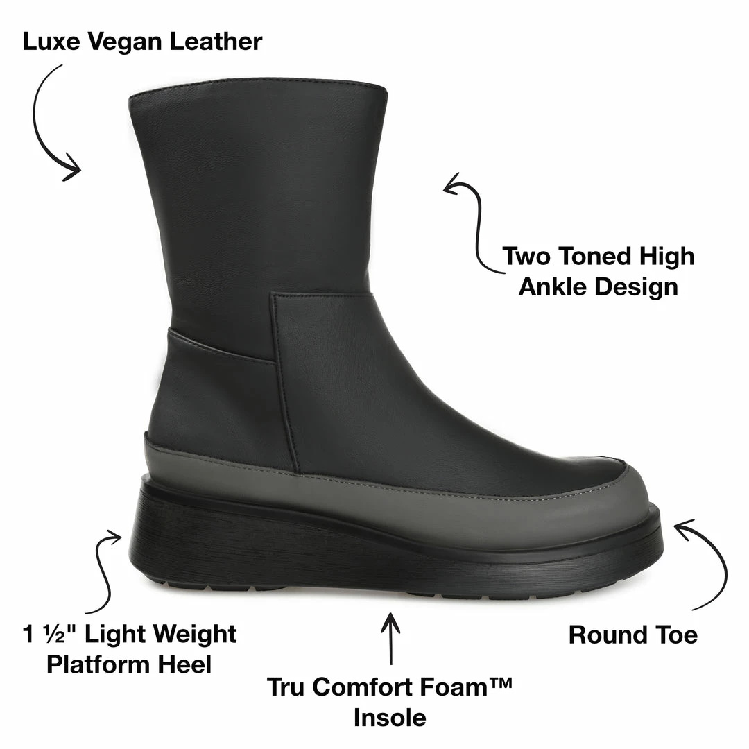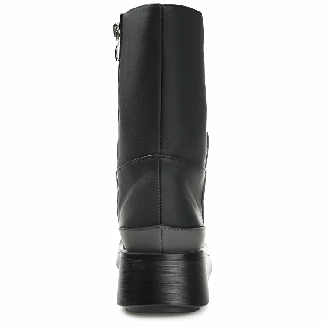 A modern look with sleek finishes, the Cristen booties by Journee Collection. This fall design is easy on the eyes and feet with its vegan leather uppers and a 4 mm Tru Comfort Foamβ’ insole. Two-tone details and a retro lug sole ground the design. Heel Height – 1 1/2-inch Heel Type – Platform Platform Height – 1-inch Shaft Height – 7 inches Top Circumference – 11 1/2 inches Shoe Width – Medium Closure Type – Inside Zip Toe Style – Round Lining – Fabric Upper Material – Vegan Leather Outersole Material – Man-made Footbed – 4 MM Tru Comfort Foamβ’