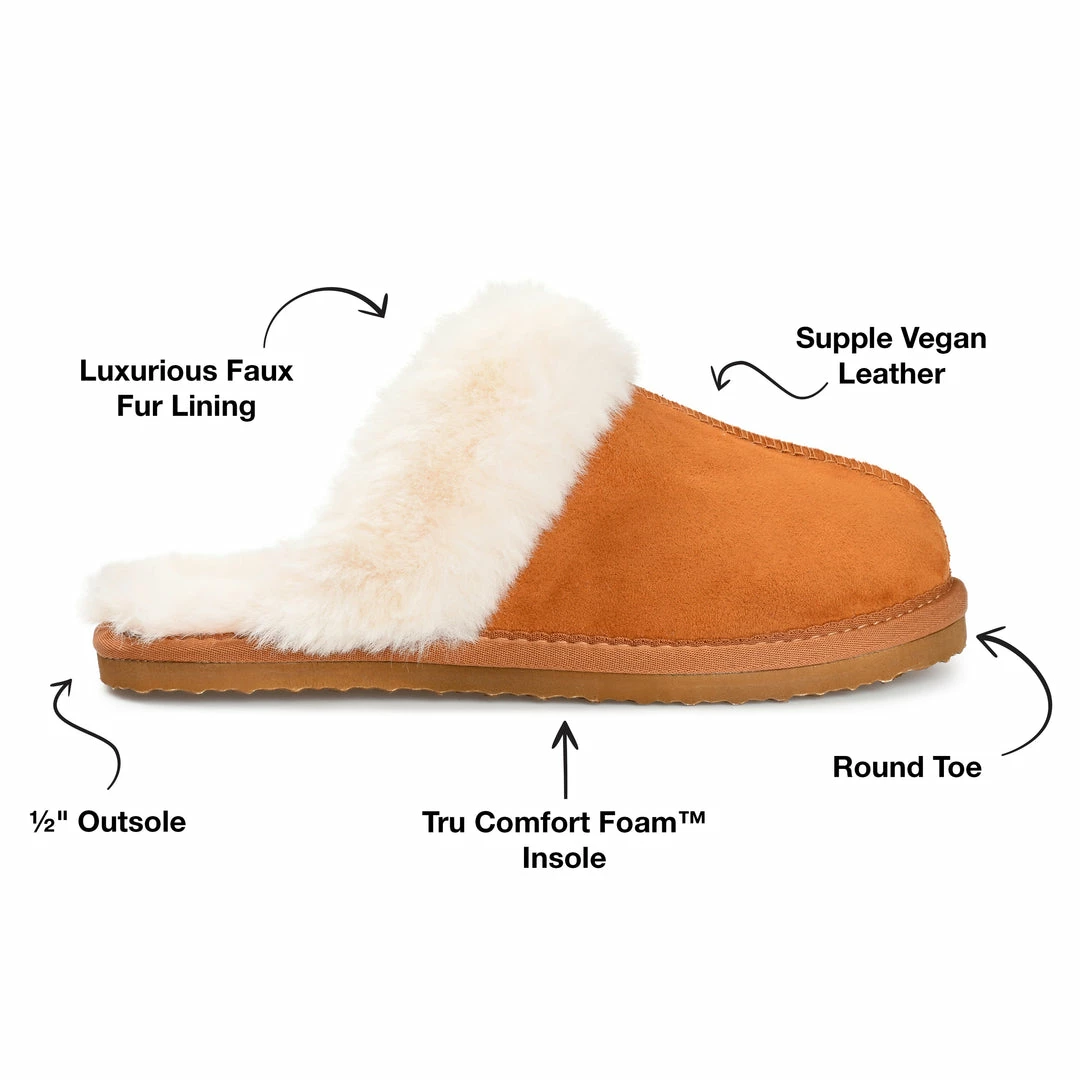The Delanee slipper by Journee Collection makes evenings at home even better. This perfectly cozy slipper features a super supportive 4 mm Tru Comfort Foamβ’ footbed and soft faux fur lining. A sturdy outsole and vegan leather complete this easy-to-wear design. Heel Height – 1/2-inch Heel Type – Sole Platform Height – 1/2-inch Shoe Width – Medium Closure Type – Slip-on Toe Style – Round Lining – Faux Fur Upper Material – Vegan Leather Outersole Material – Man-made Footbed – 4 MM Tru Comfort Foamβ’