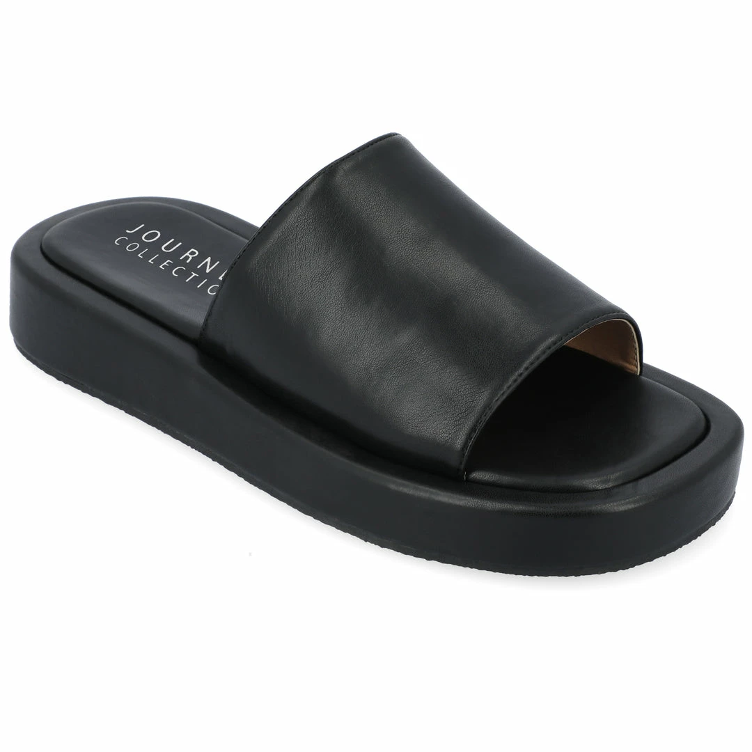 Our Denrie platform sandals from Journee Collection will be the perfect shoe for when you want to be comfy yet classy. With their luxe vegan leather, single band slide, and open round toe, you’ll notice that extra boost to your confidence. The 4 mm Tru Comfort Foamβ’ insole and slip-on feature will make your feet feel like you’re on cloud 9. Heel Height – 1 1/4-inch Heel Type – Platform Platform Height – 1-inch Shoe Width – Medium Closure Type – Slip-on Strap Type – Single Band Toe Style – Open Lining – Faux Leather Upper Material – Vegan Leather Outersole Material – Man-made Footbed – 4 MM Tru Comfort Foamβ’