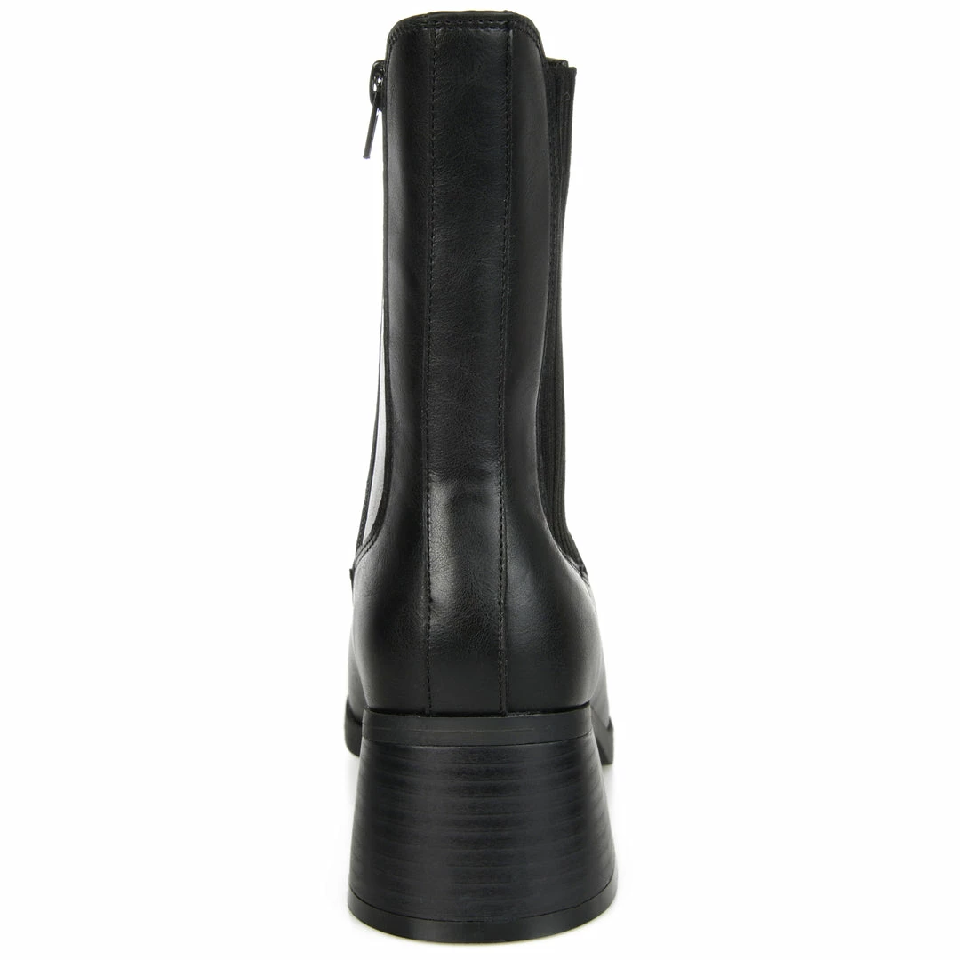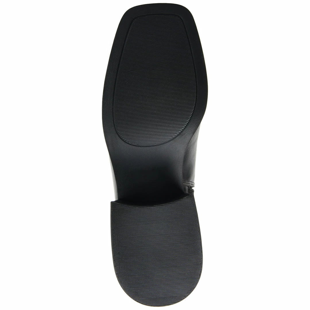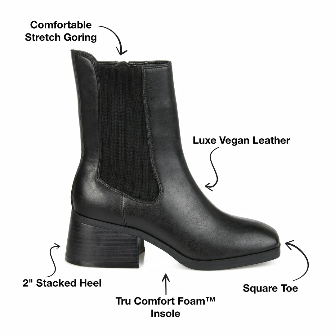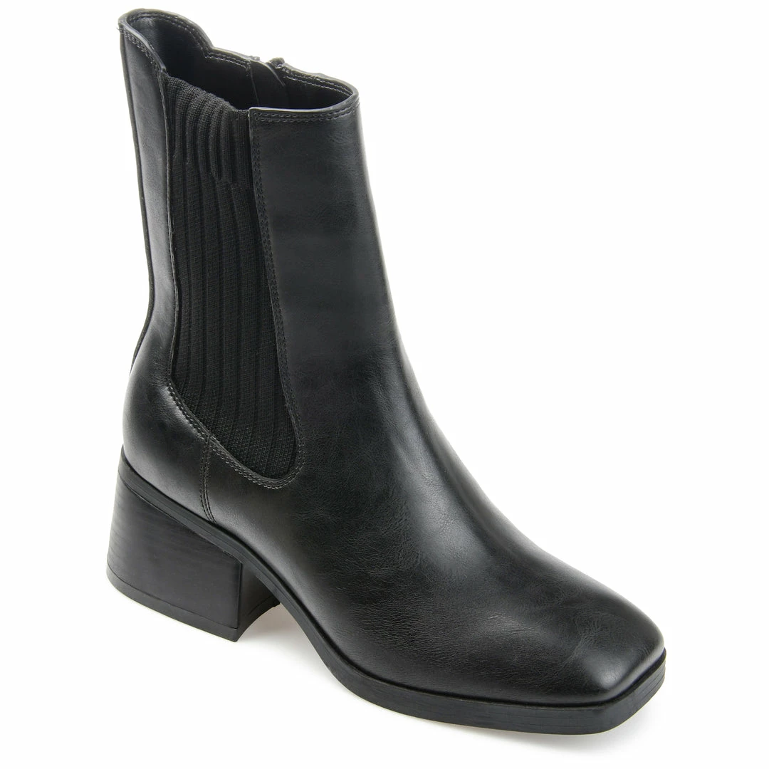 Cool contemporary details define the Desree by Journee Collection. A stretch knit panel and an inside zipper accent this square-toe bootie. A low heel paired with a 4 mm Tru Comfort Foamβ’ footbed finish this vegan leather silhouette. Heel Height – 2-inch Heel Type – Stacked Platform Height – 1/2-inch Shaft Height – 7 inches Top Circumference – 10 1/2 inches Shoe Width – Medium Closure Type – Inside Zip Toe Style – Square Lining – Fabric Upper Material – Vegan Leather Outersole Material – Man-made Footbed – 4 MM Tru Comfort Foamβ’