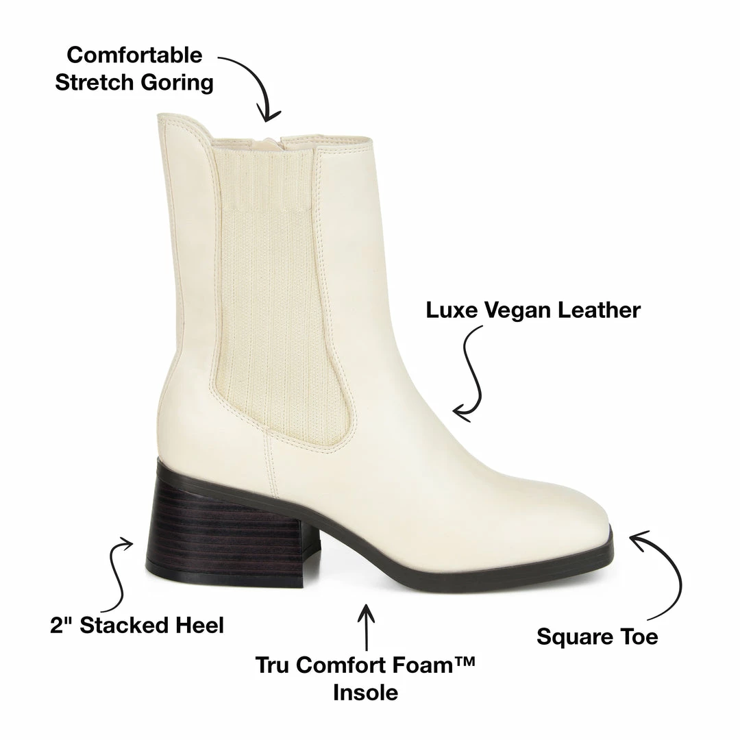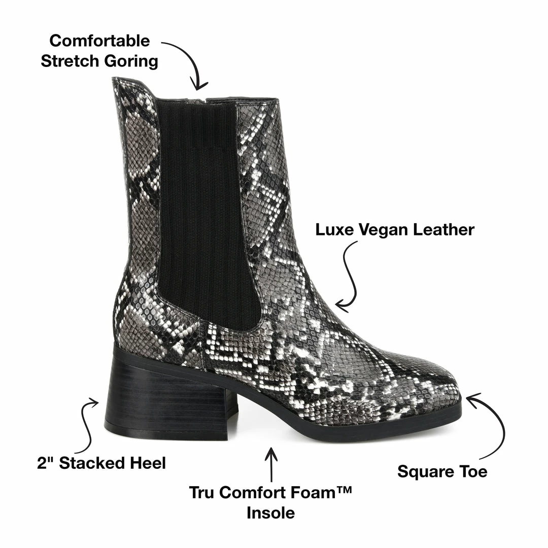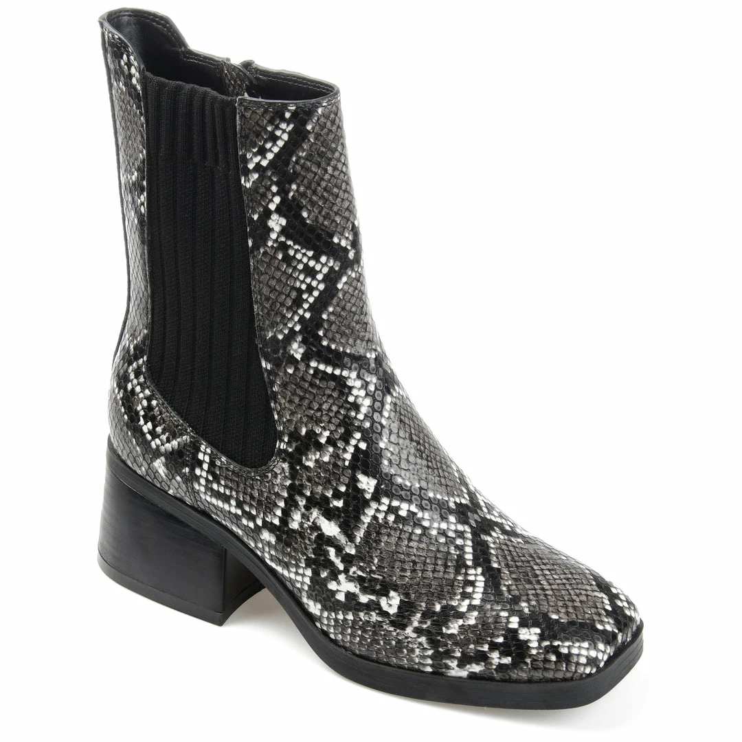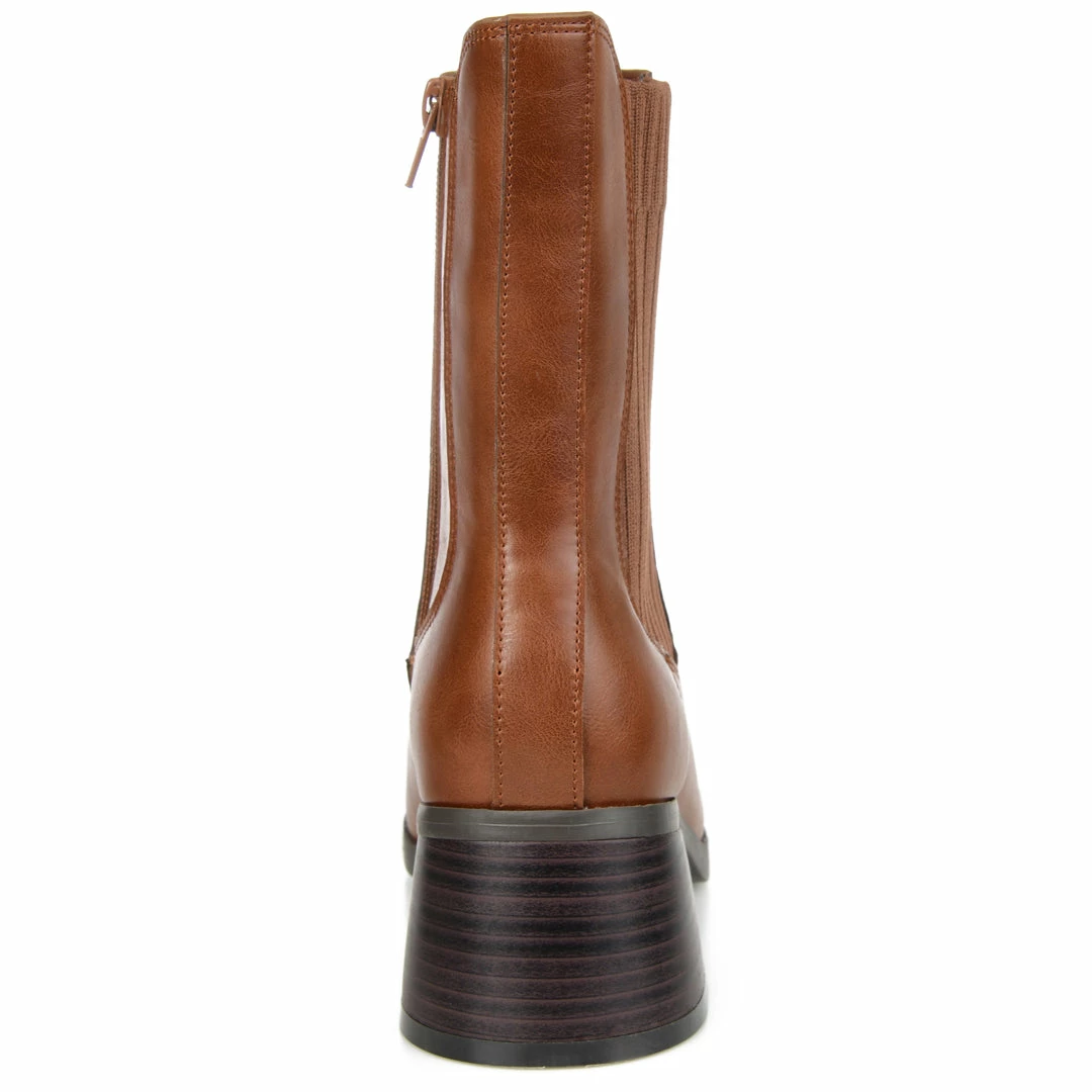 Cool contemporary details define the Desree by Journee Collection. A stretch knit panel and an inside zipper accent this square-toe bootie. A low heel paired with a 4 mm Tru Comfort Foamβ’ footbed finish this vegan leather silhouette. Heel Height – 2-inch Heel Type – Stacked Platform Height – 1/2-inch Shaft Height – 7 inches Top Circumference – 10 1/2 inches Shoe Width – Medium Closure Type – Inside Zip Toe Style – Square Lining – Fabric Upper Material – Vegan Leather Outersole Material – Man-made Footbed – 4 MM Tru Comfort Foamβ’