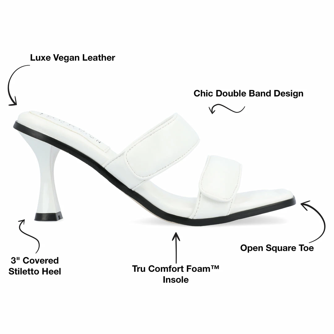 The Essey heels from Journee Collection will give a little extra confidence thanks to the mule silhouette, double straps, and open square-toe. With their 8 mm Tru Comfort foam β’ insole and stiletto heel, they will make you feel comfortable while still allowing you to strut your stuff. This trendy look is sure to turn heads whether you wear them with jeans or a little black dress. Heel Height – 3-inch Heel Type – Stiletto Platform Height – Flat-inch Shoe Width – Medium Closure Type – Slip-on Strap Type – Multi -Strap Toe Style – Open Lining – Faux Leather Upper Material – Vegan Leather Outersole Material – Man-made Footbed – 8 MM Tru Comfort Foamβ’