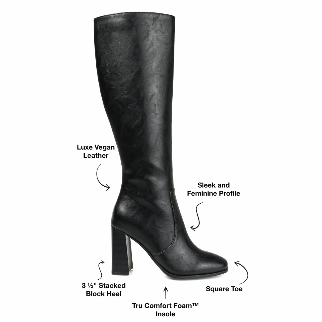 A can’t-live-without style for fall, the Karima boot by Journee Collection. This extra-wide calf boot features a modern square-toe, a 4 mm Tru Comfort Foam™ footbed, and supple vegan leather for a comfortable fit. A chic block heel and a zipper on the inside give this classic design a fresh new look. Heel Height – 3 1/2-inch Heel Type – Stacked Platform Height – Flat-inch Shaft Height – 15 inches Calf Circumference – 17 inches Top Circumference – 18 inches Shoe Width – Medium Closure Type – Inside Zip Toe Style – Square Lining – Fabric Upper Material – Vegan Leather Outersole Material – Man-made Footbed – 4 MM Tru Comfort Foam™
