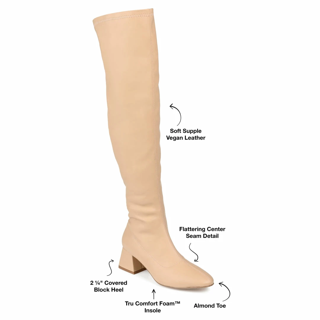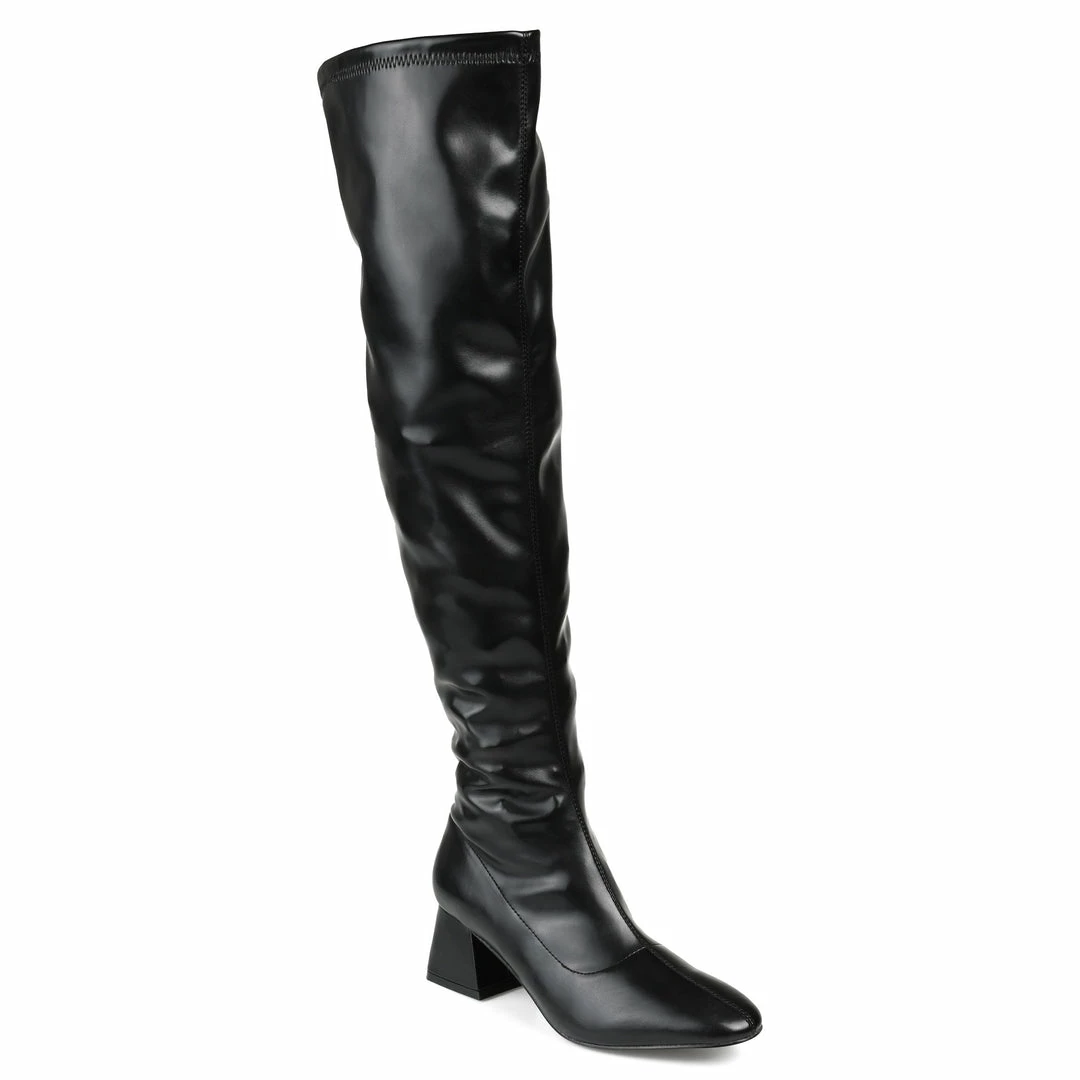 Add a simply chic style to your wardrobe with the Melika by Journee Collection. An almond-toe and a center seam detail give this extra-wide calf boot a dramatic twist. This over-the-knee silhouette features vegan leather, a covered kicked-in block heel, and a 4 mm Tru Comfort Foamโข insole for a comfortable lift. Heel Height – 2 1/4-inch Heel Type – Block Heel Platform Height – Flat-inch Shaft Height – 20 1/2 inches Calf Circumference – 15 1/2 inches Top Circumference – 18 inches Shoe Width – Medium Closure Type – Inside Zip Toe Style – Almond Lining – Fabric Upper Material – Vegan Leather Outersole Material – Man-made Footbed – 4 MM Tru Comfort Foamโข