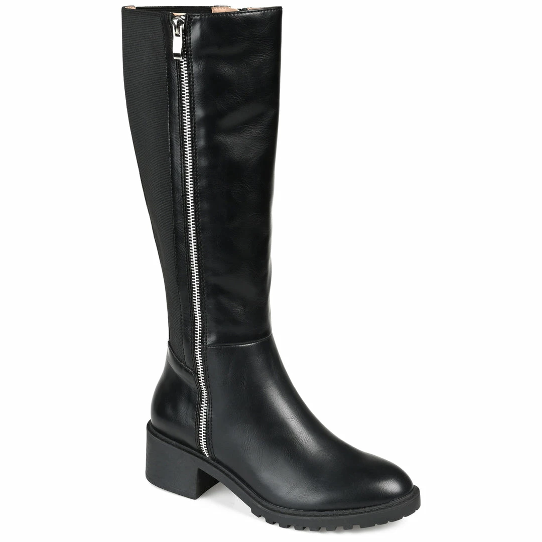 A cool look that matches everything, the Morgaan by Journee Collection. An almond-toe and a zipper detail give this extra-wide calf boot a bold look. This knee-high silhouette features a 4 mm Tru Comfort Foamβ’ insole, vegan leather, and a low block heel. Heel Height – 2-inch Heel Type – Stacked Platform Height – 1/2-inch Shaft Height – 15 inches Calf Circumference – 15 1/2 inches Top Circumference – 16 1/2 inches Shoe Width – Medium Closure Type – Inside Zip Toe Style – Almond Lining – Fabric Upper Material – Vegan Leather Outersole Material – Man-made Footbed – 4 MM Tru Comfort Foamβ’