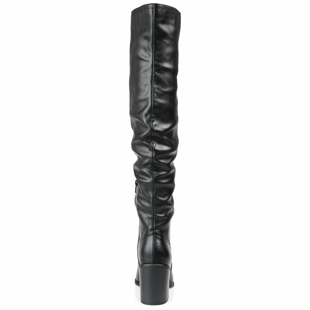 Contemporary but classic styling, introducing the Pia boot by Journee Collection. This over-the-knee vegan leather boot adds a flirty finish to any outfit with its pointed-toe and ruched details. An extra-wide calf, 4 mm Tru Comfort Foam™ insole, and block heel complete this trendy design. Heel Height – 3-inch Heel Type – Stacked Platform Height – Flat-inch Shaft Height – 19 1/2 inches Calf Circumference – 16 inches Top Circumference – 18 1/2 inches Shoe Width – Medium Closure Type – Inside Zip Toe Style – Pointed Lining – Fabric Upper Material – Vegan Leather Outersole Material – Man-made Footbed – 4 MM Tru Comfort Foam™