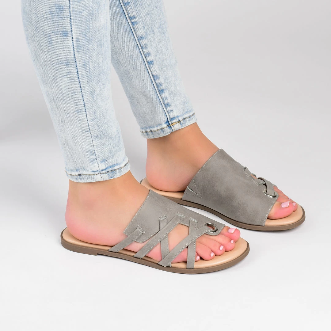 You won’t go unnoticed wearing the stunning Hasten sandal. Its gromet and strap detail on the toe and asymmetrical strappy design on the upper faux leather material truly stand out. Slip into this gorgeous sandal for a day at the office or a night on the town. Thanks to a cushioned insole, your feet will be comfortable no matter what. Heel Height – 1/2-inch Heel Type – Sole Platform Height – 1/2-inch Shoe Width – Medium Closure Type – Slip-on Strap Type – Toe Strap Toe Style – Open Lining – Faux Leather Upper Material – Faux Leather Outersole Material – Rubber Footbed – 4 MM Tru Comfort Foamβ’