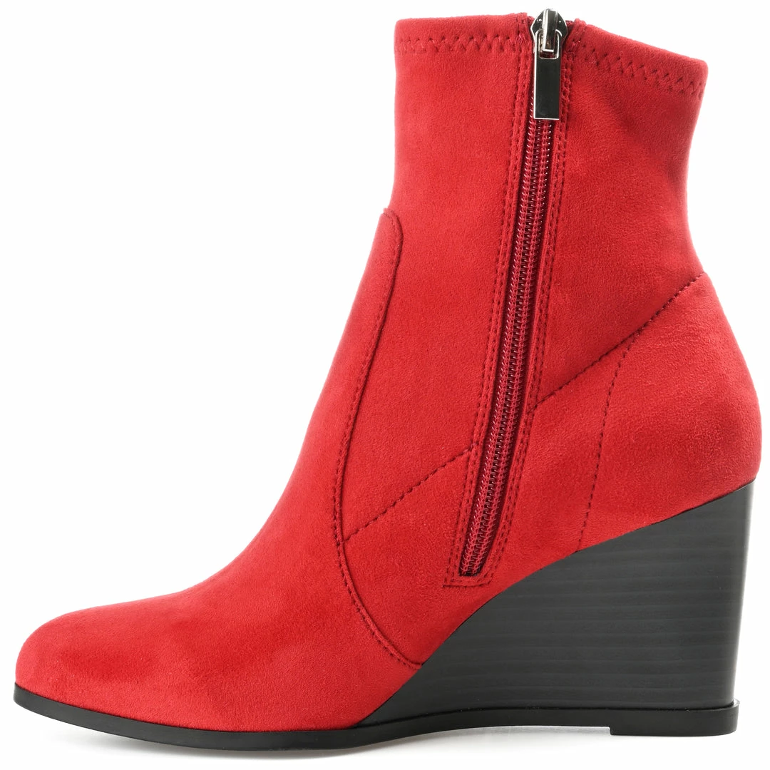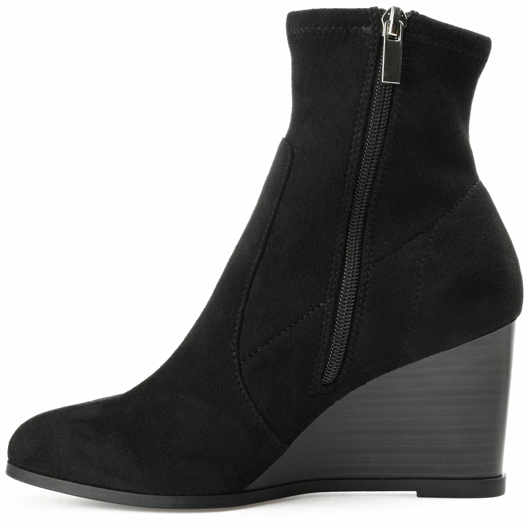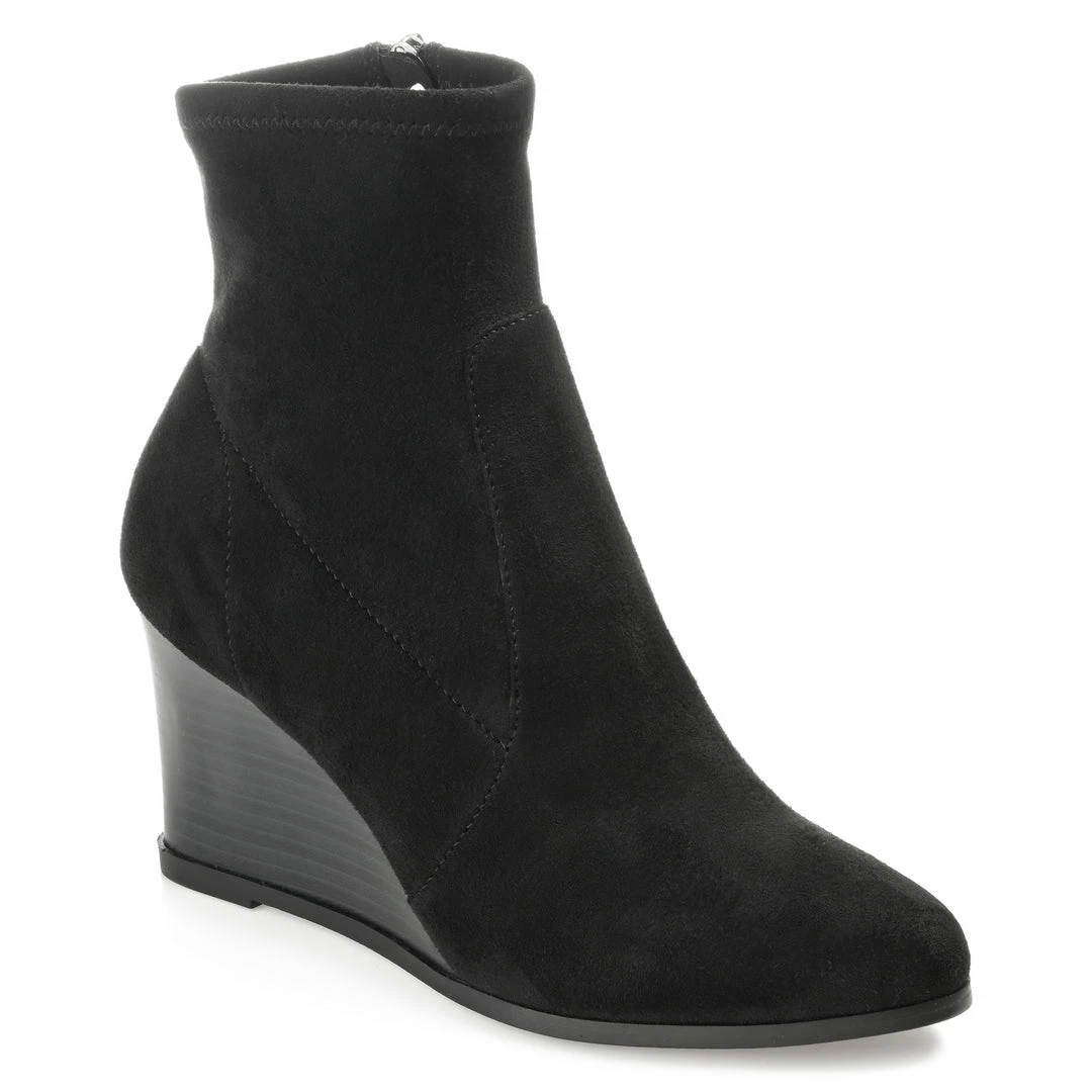 Make every sidewalk your personal runway in this upscale look. The Hepburn is a vegan leather bootie that rises to the ankles with a wedge heel that creates a leg-lengthening look. This design by Journey & Crew is completed with an almond-toe and a with 4 mm Tru Comfort Foamโข footbed for extra cushion to your step. Heel Height – 3 1/4-inch Heel Type – Wedge Platform Height – Flat-inch Shaft Height – 5 inches Top Circumference – 9 1/2 inches Shoe Width – Medium Closure Type – Inside Zip Toe Style – Almond Lining – Fabric Upper Material – Vegan Leather Outersole Material – Man-made Footbed – 4 MM Tru Comfort Foamโข