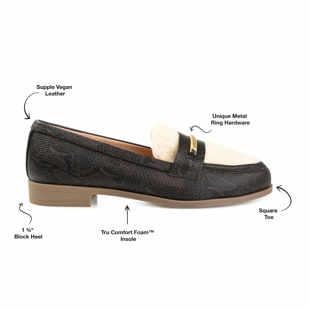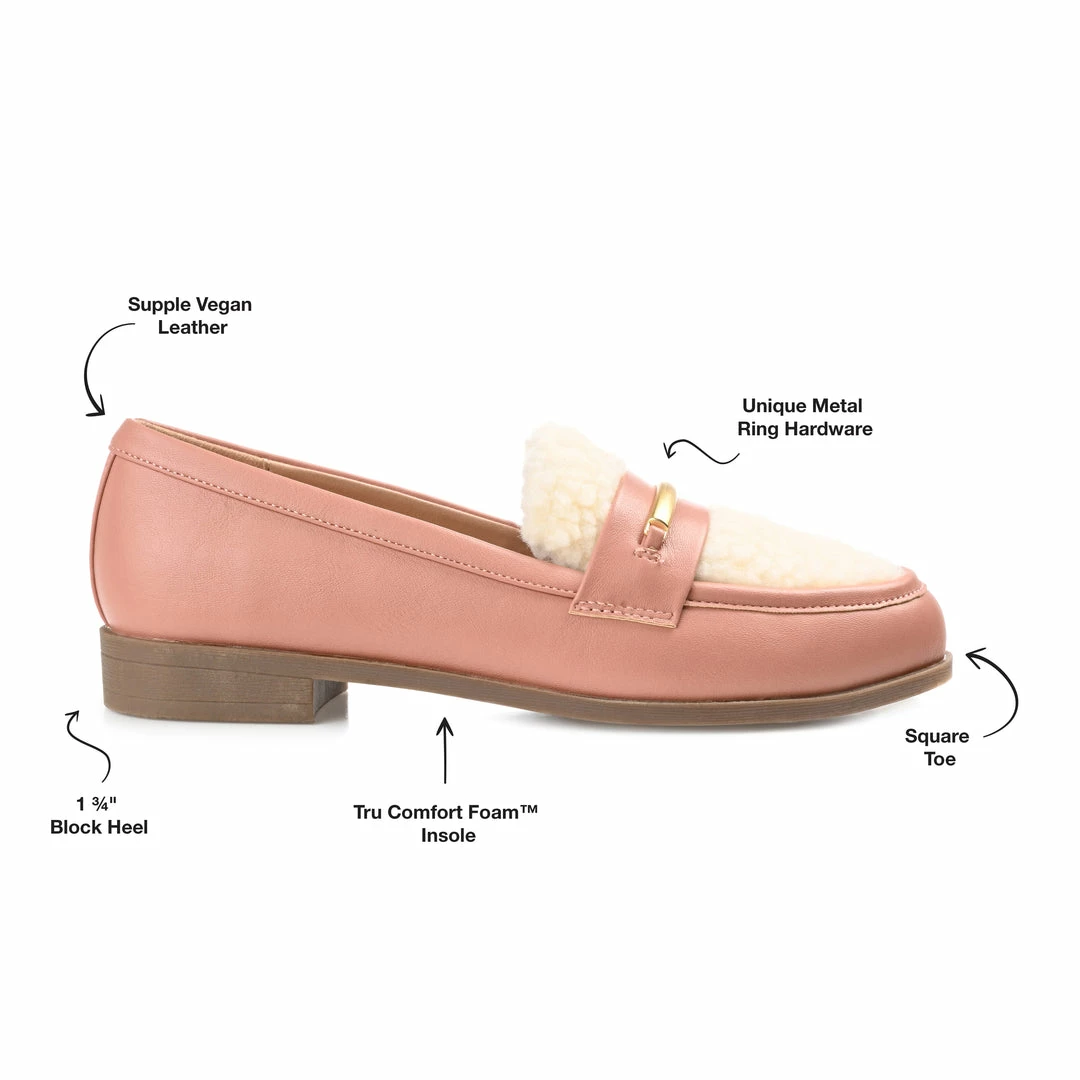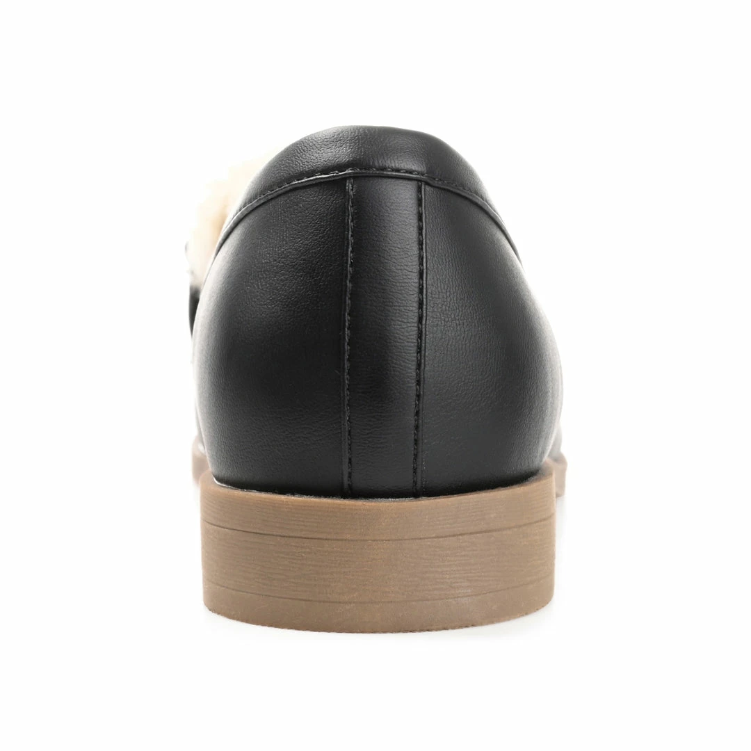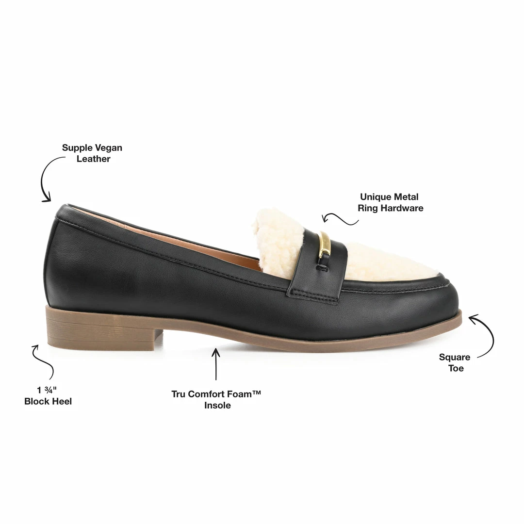 A classic loafer with a twist. The Huntington by Journee Collection hits all the right notes with its almond-toe and faux shearling accent. Vegan leather topped with a hardware detail shapes the design, and a 4 mm Tru Comfort Foamβ’ insole adds the right amount of cushion to your step. Heel Height – 1-inch Heel Type – Block Heel Platform Height – Flat-inch Shoe Width – Medium Closure Type – Slip-on Toe Style – Almond Lining – Faux Leather Upper Material – Vegan Leather Outersole Material – Man-made Footbed – 4 MM Tru Comfort Foamβ’