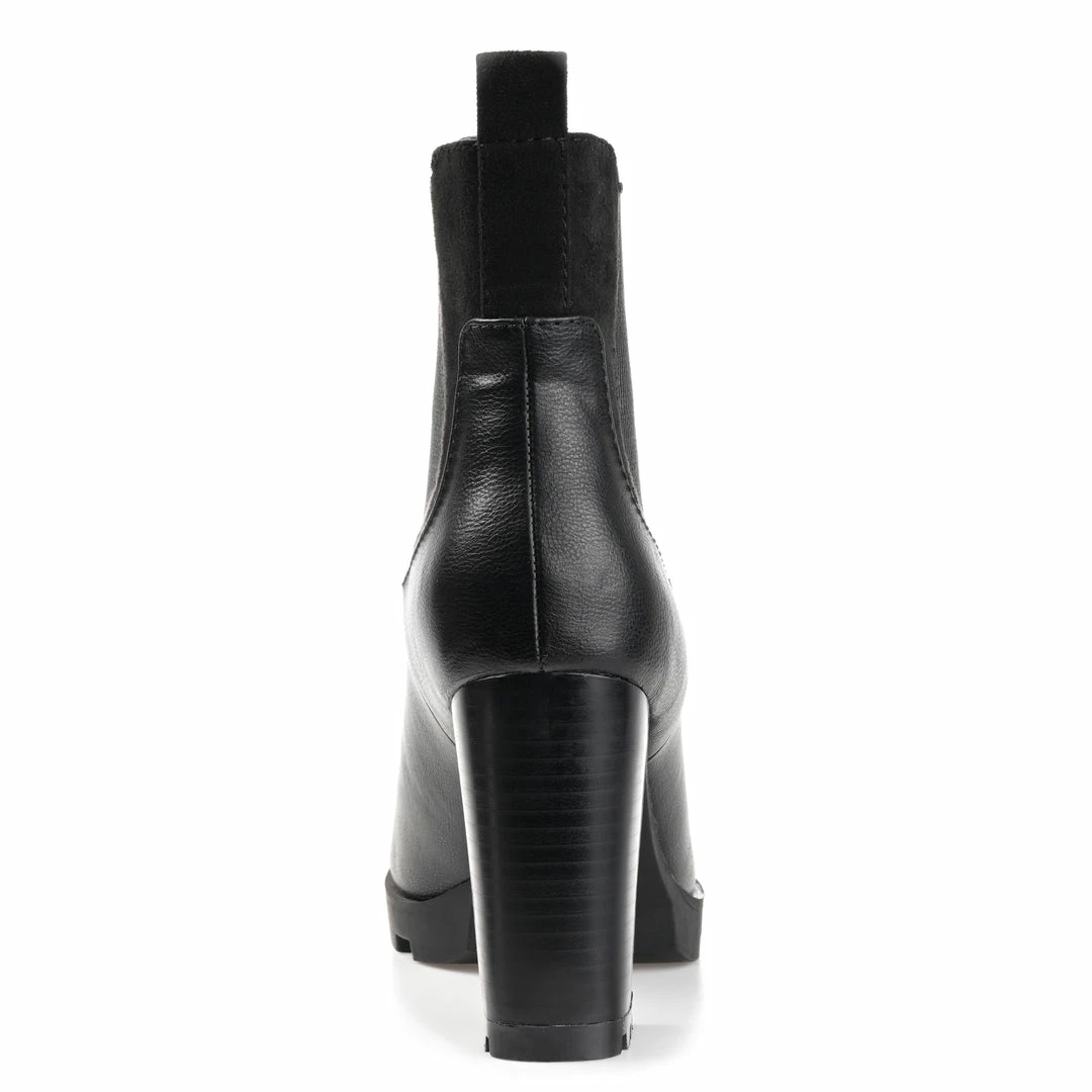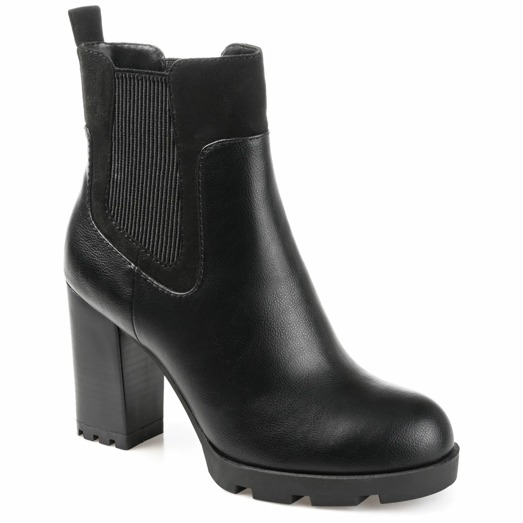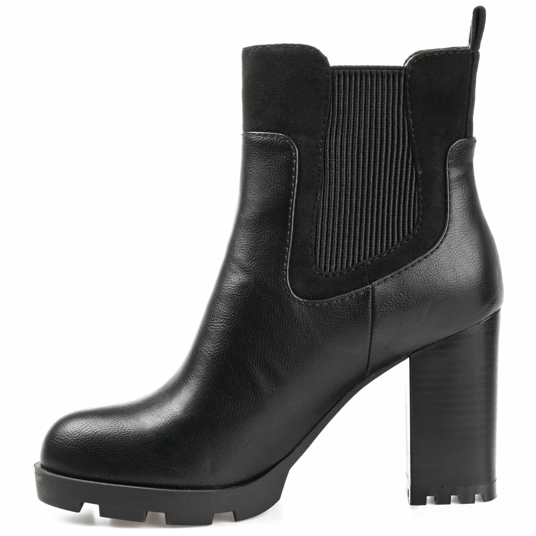 A sassy spin on the chelsea bootie, the Islana by Journee Collection. These modern booties feature supple vegan leather uppers detailed with a chunky block heel and a treaded platform sole. A 4 mm Tru Comfort Foamโข insole makes them comfy to walk in, and twin stretch gore panels at the ankle make them easy to pull on. Heel Height – 3 1/2-inch Heel Type – Stacked Platform Height – 1-inch Shaft Height – 5 inches Top Circumference – 10 inches Shoe Width – Medium Closure Type – Pull-on Toe Style – Round Lining – Fabric Upper Material – Vegan Leather Outersole Material – Man-made Footbed – 4 MM Tru Comfort Foamโข