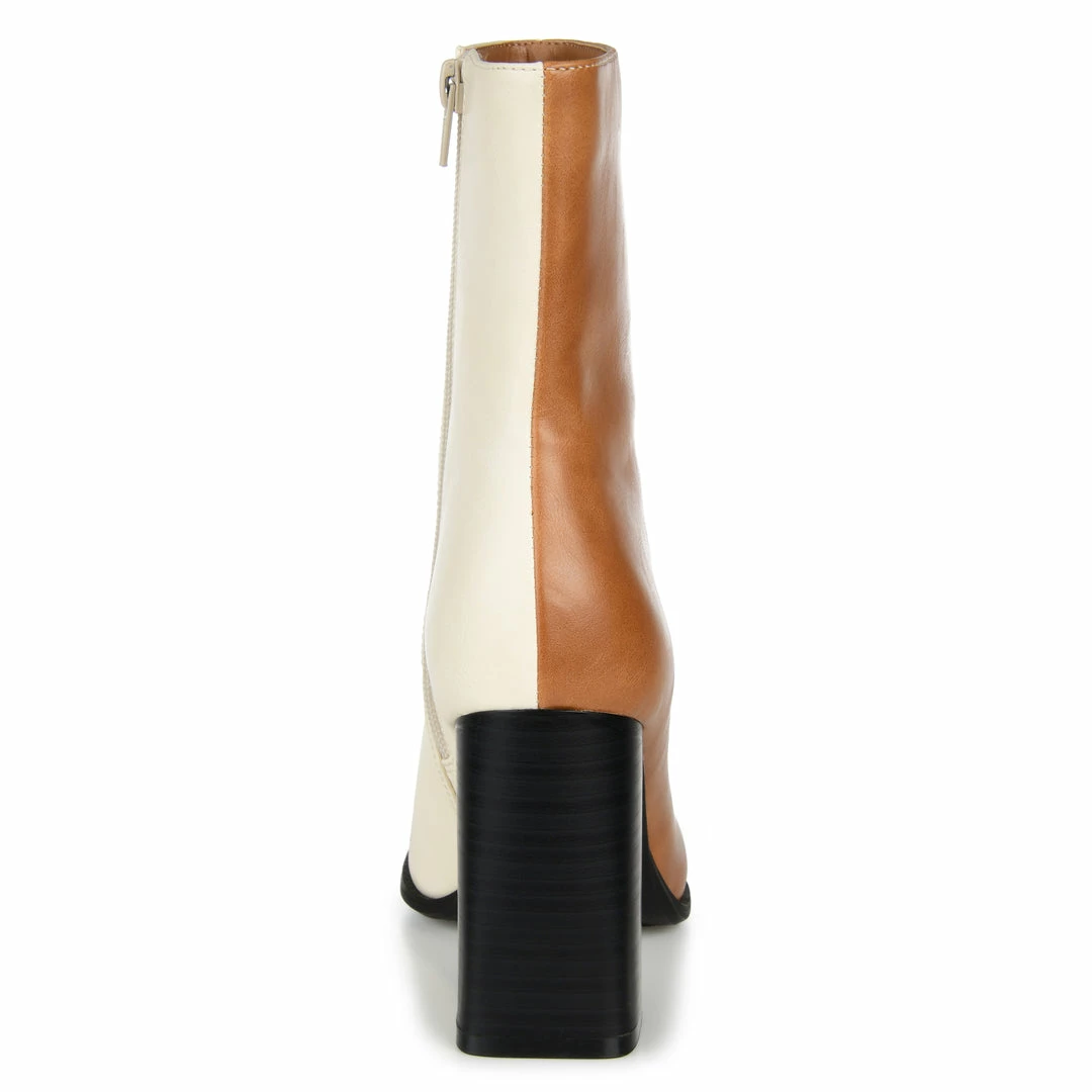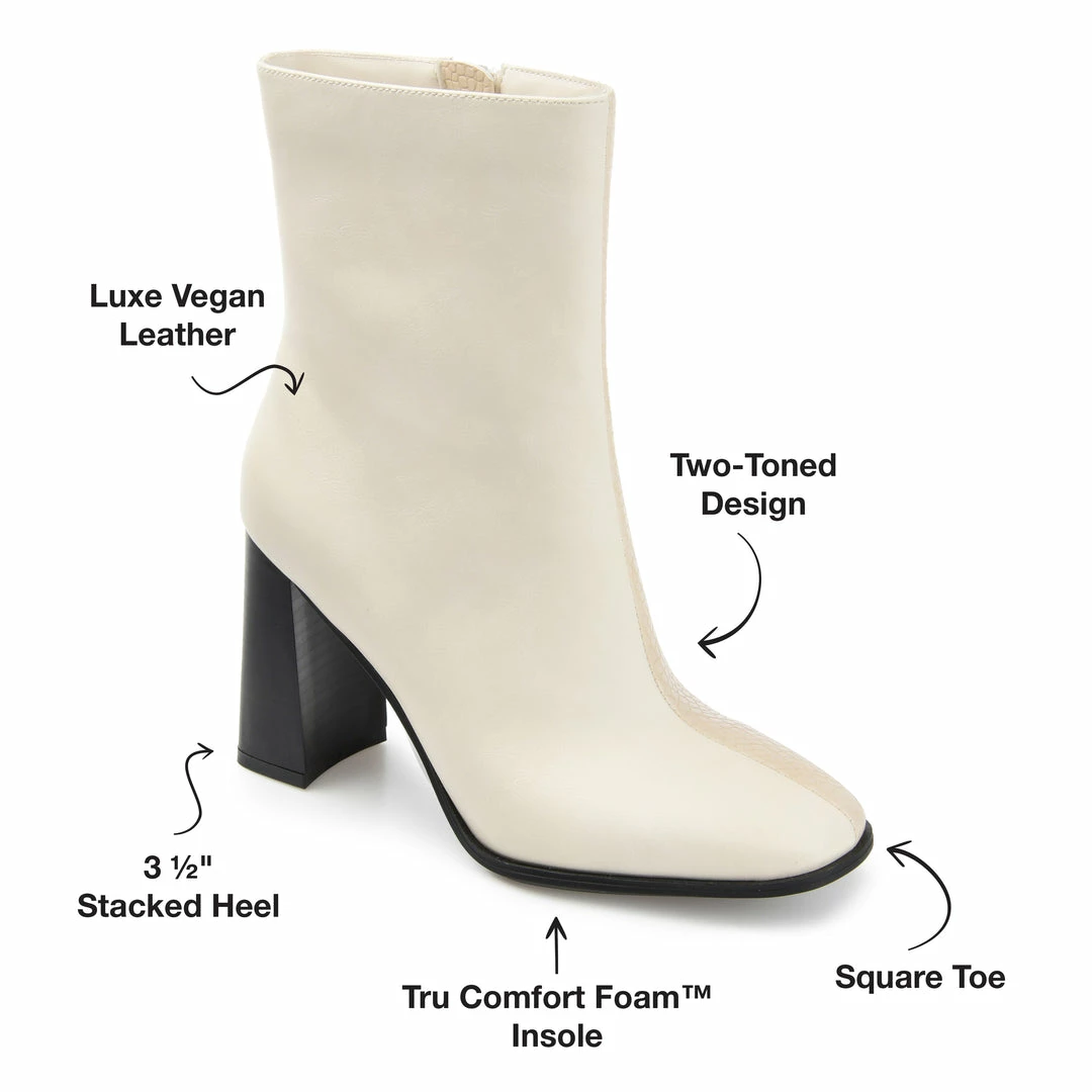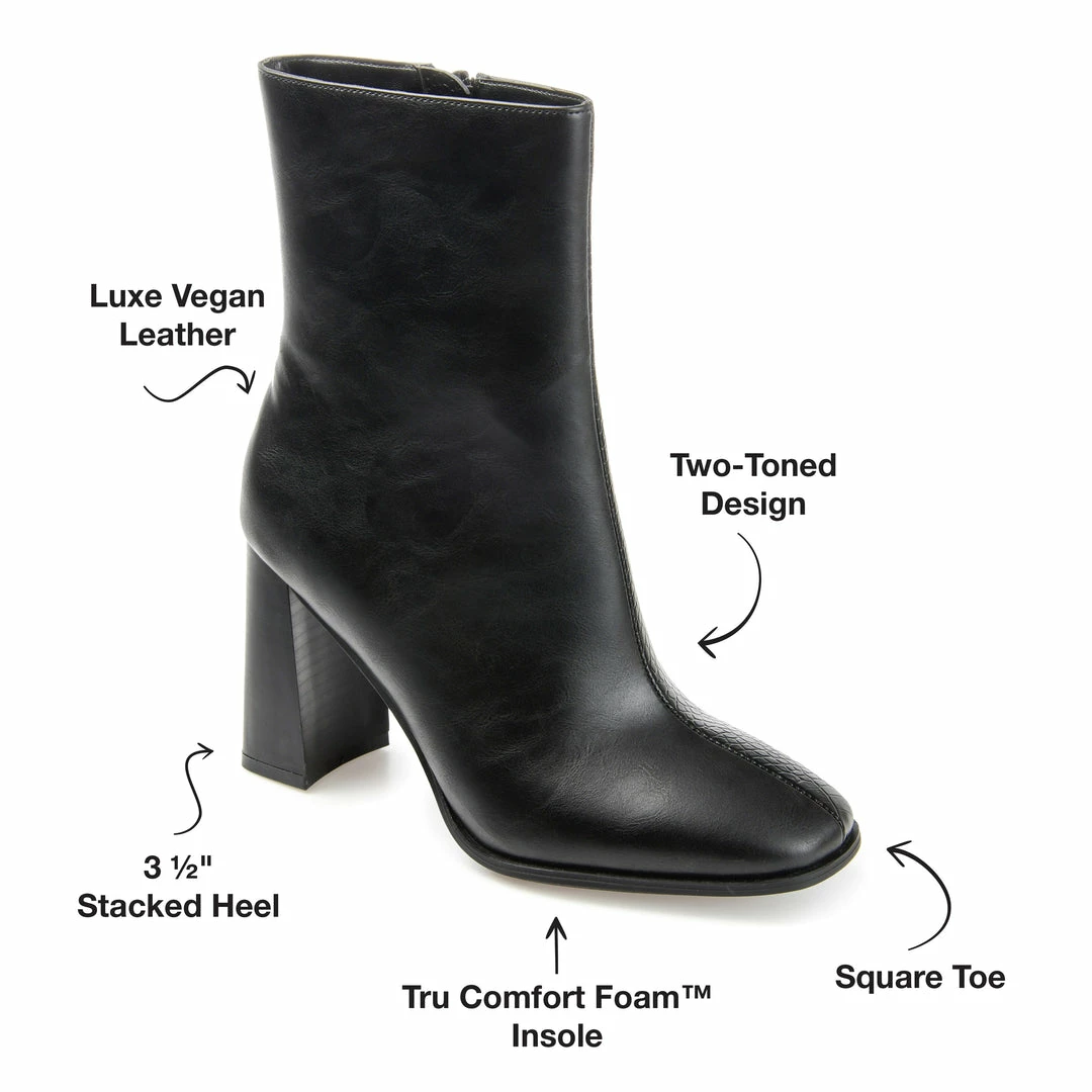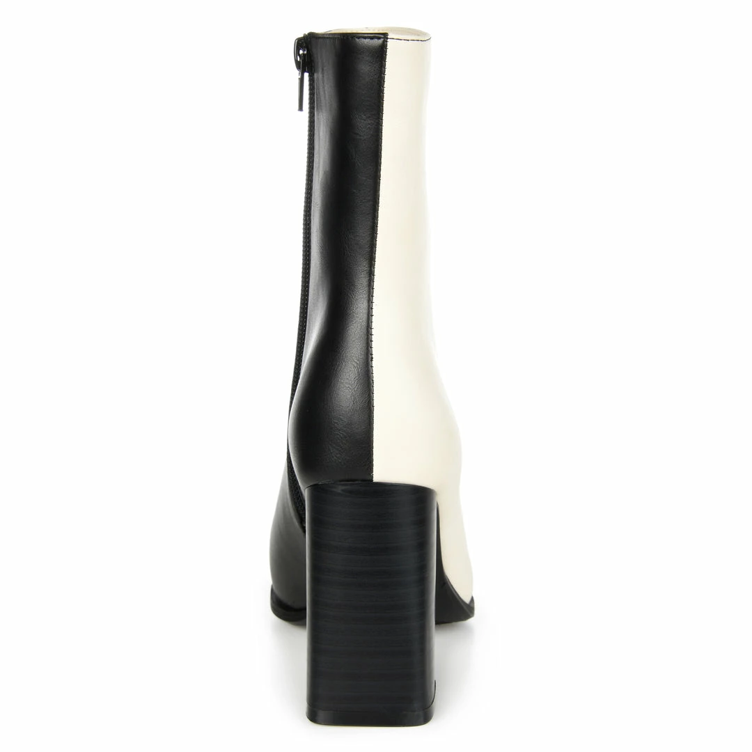 Reach new heights in this ultra-cool bootie, the January by Journee Collection. This two-tone bootie features a square-toe and a lofty block heel. An inside zipper offers easy entry, and a 4 mm Tru Comfort Foamβ’ insole makes them a breeze to walk in. Heel Height – 3 1/2-inch Heel Type – Stacked Platform Height – Flat-inch Shaft Height – 6 inches Top Circumference – 11 inches Shoe Width – Medium Closure Type – Inside Zip Toe Style – Square Lining – Fabric Upper Material – Vegan Leather Outersole Material – Man-made Footbed – 4 MM Tru Comfort Foamβ’