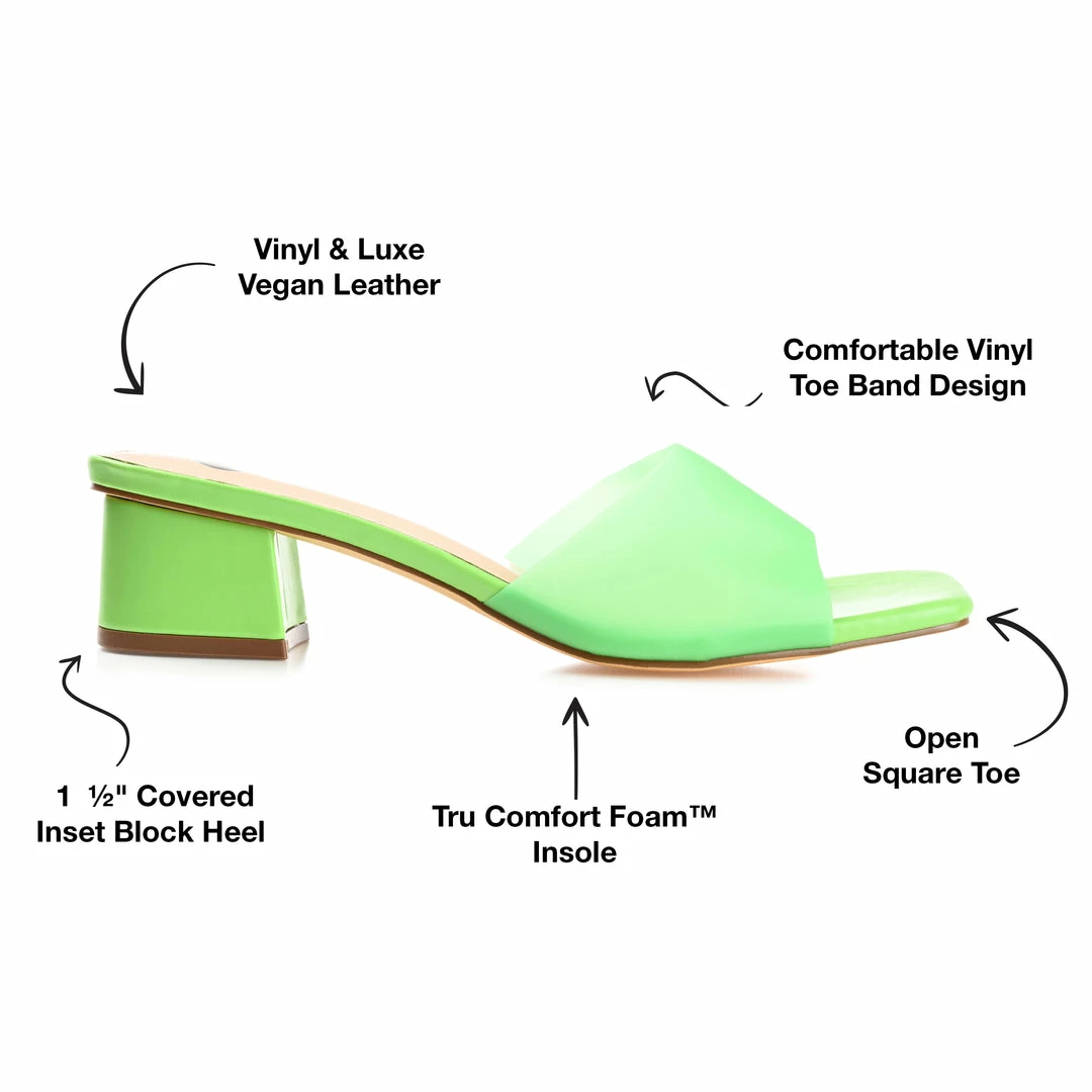 The throwback look from your fantasies is here, the Jaydin by Journee Collection. This 90s inspired heel features a 4 mm Tru Comfort Foamβ’ insole, so it’s as practical as it is stylish. A boldly colored vinyl strap elevated by an inset block heel shape this slip-on silhouette. Heel Height – 1 1/2-inch Heel Type – Block Heel Platform Height – Flat-inch Shoe Width – Medium Closure Type – Slip-on Strap Type – Single Band Toe Style – Open Lining – Man-made Upper Material – Man-made Outersole Material – Man-made Footbed – 4 MM Tru Comfort Foamβ’