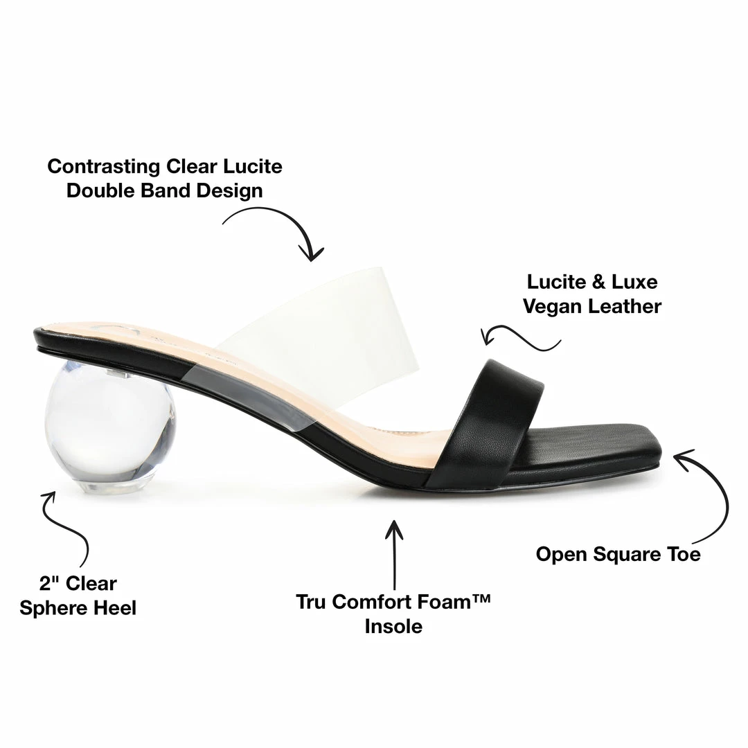 The details on this strappy heel speak for themselves. The July by Journee Collection is a slip-on heel with a clear lucite strap at the vamp and a sphere heel. Soft vegan leather and our signature 4 mm Tru Comfort Foamβ’ footbed complete the design. Heel Height – 2-inch Heel Type – Heel Platform Height – Flat-inch Shoe Width – Medium Closure Type – Slip-on Strap Type – Multi -Strap Toe Style – Open Lining – Man-made Upper Material – Man-made Outersole Material – Man-made Footbed – 4 MM Tru Comfort Foamβ’