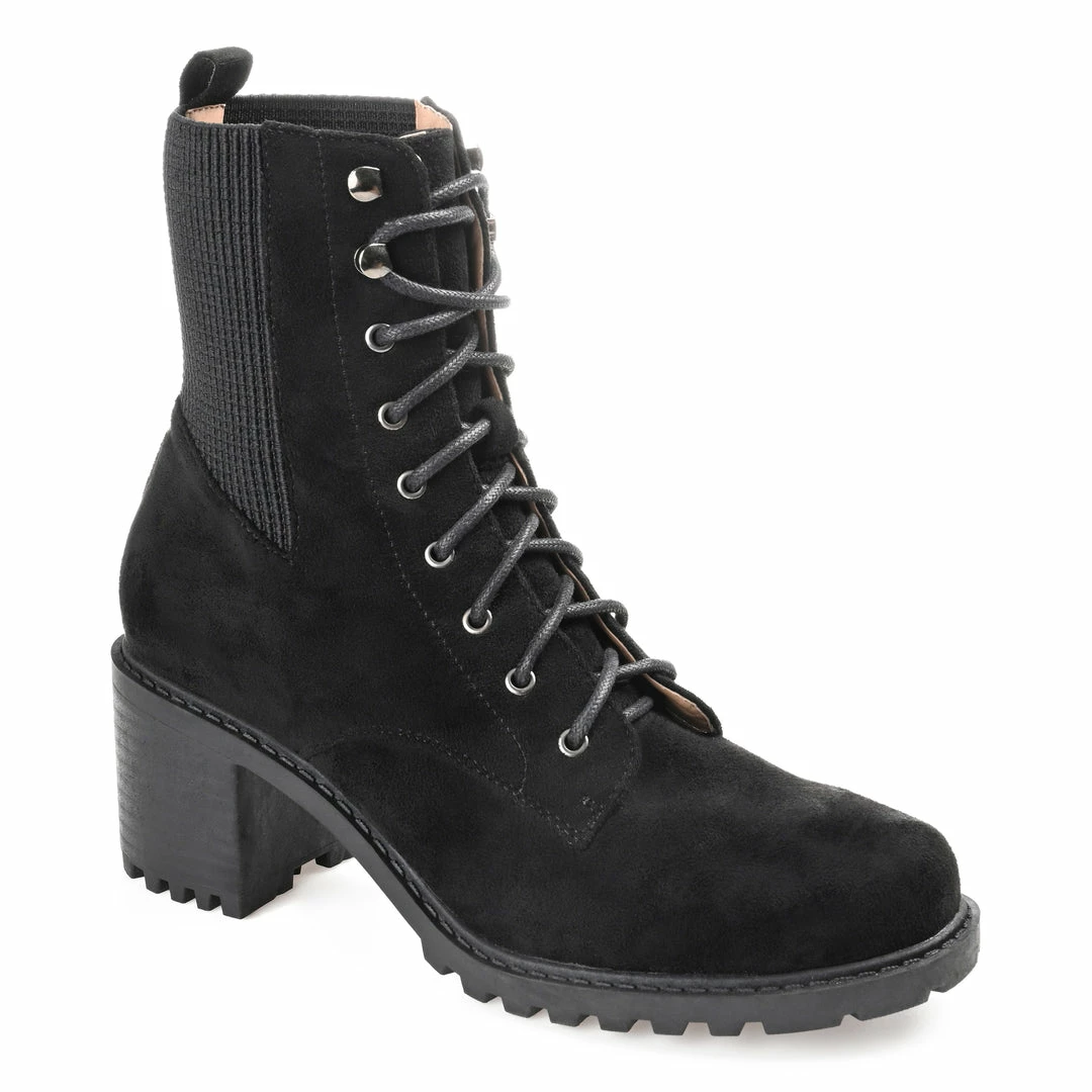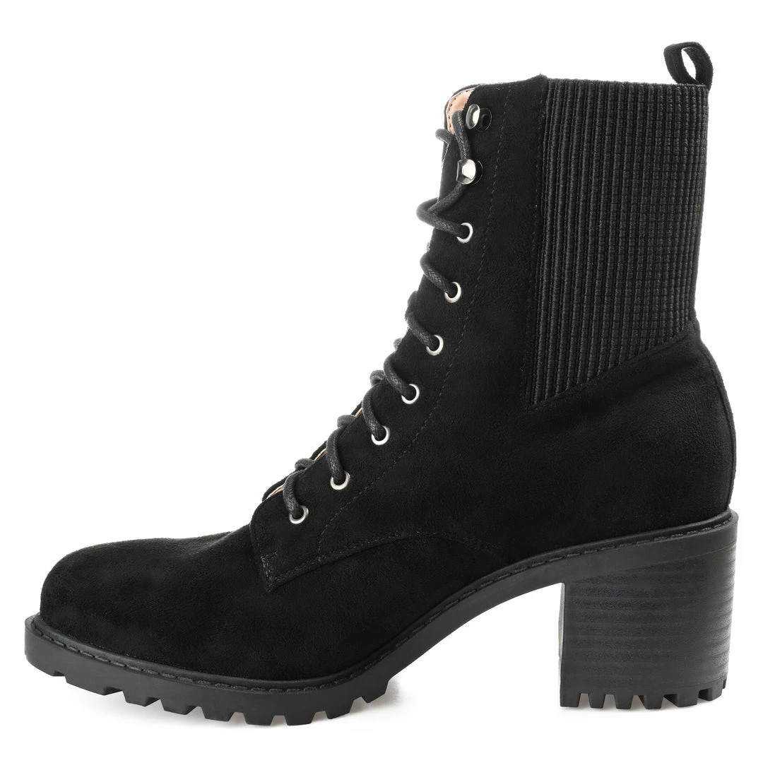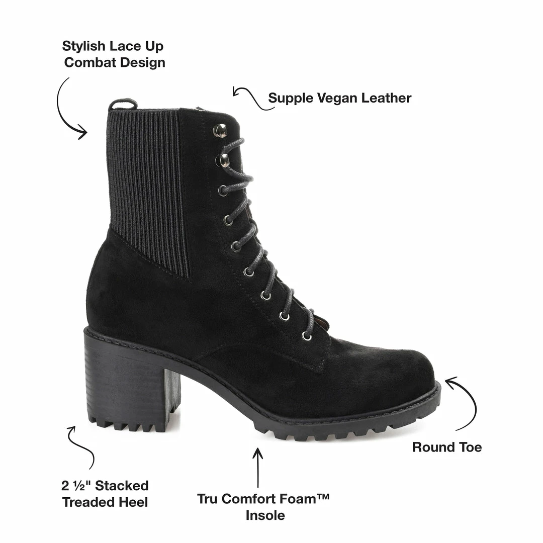 Pull them on and go, the Kassia by Journee Collection. This combat bootie features soft vegan leather, the perfect ankle height, and a stacked chunky heel. The 4 mm Tru Comfort Foamβ’ footbed adds support, and a classic lace-up closure paired with a stretch panel creates an easy entry. Heel Height – 2 1/2-inch Heel Type – Stacked Platform Height – 1/2-inch Shaft Height – 6 inches Top Circumference – 9 1/2 inches Shoe Width – Medium Closure Type – Lace-up Toe Style – Round Lining – Fabric Upper Material – Vegan Leather Outersole Material – Man-made Footbed – 4 MM Tru Comfort Foamβ’