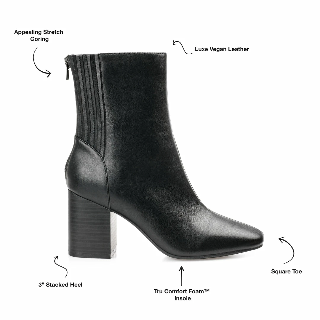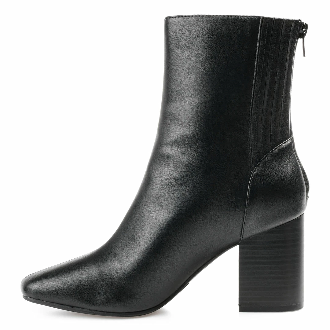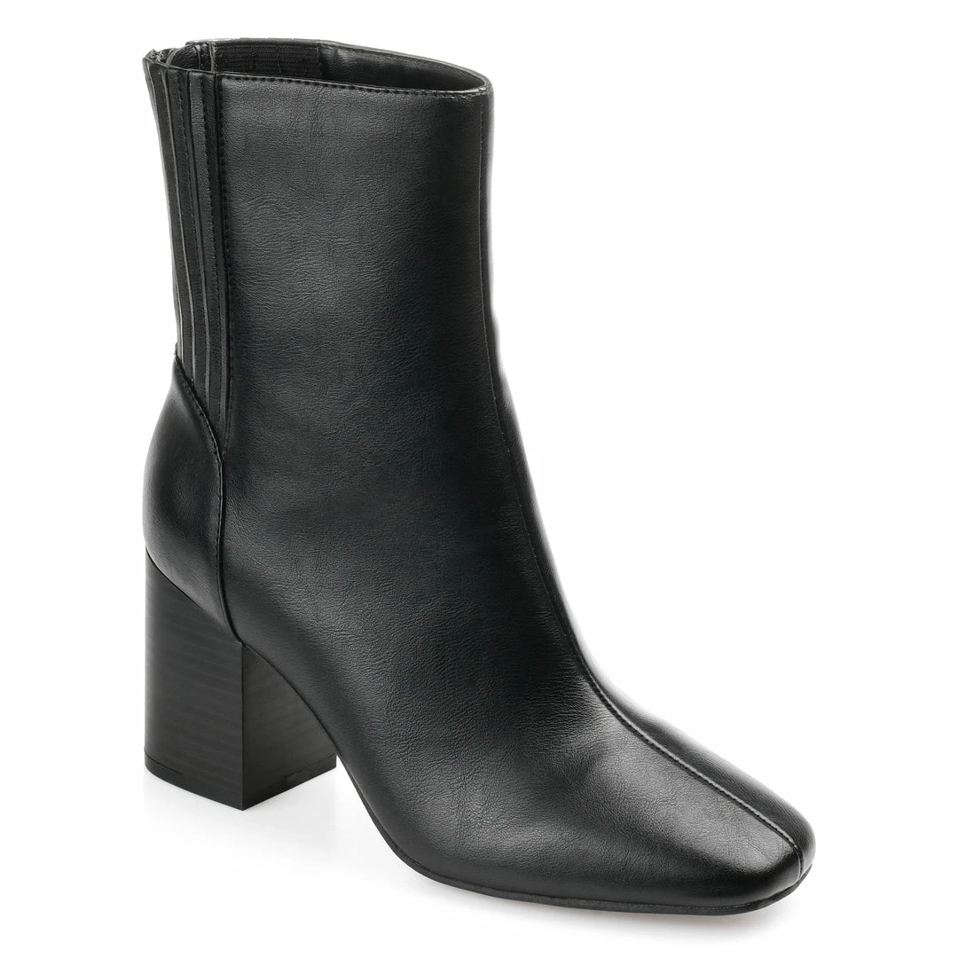 Effortlessly cool details define the Maize bootie by Journee Collection. A seam at the center and square-toe add a chic touch to this vegan leather silhouette. With a 4 mm Tru Comfort Foamβ’ insole and a block heel, this look is oh-so-walkable. Heel Height – 3-inch Heel Type – Stacked Platform Height – Flat-inch Shaft Height – 6 inches Top Circumference – 10 1/2 inches Shoe Width – Medium Closure Type – Back Heel Zip Toe Style – Square Lining – Fabric Upper Material – Vegan Leather Outersole Material – Man-made Footbed – 4 MM Tru Comfort Foamβ’