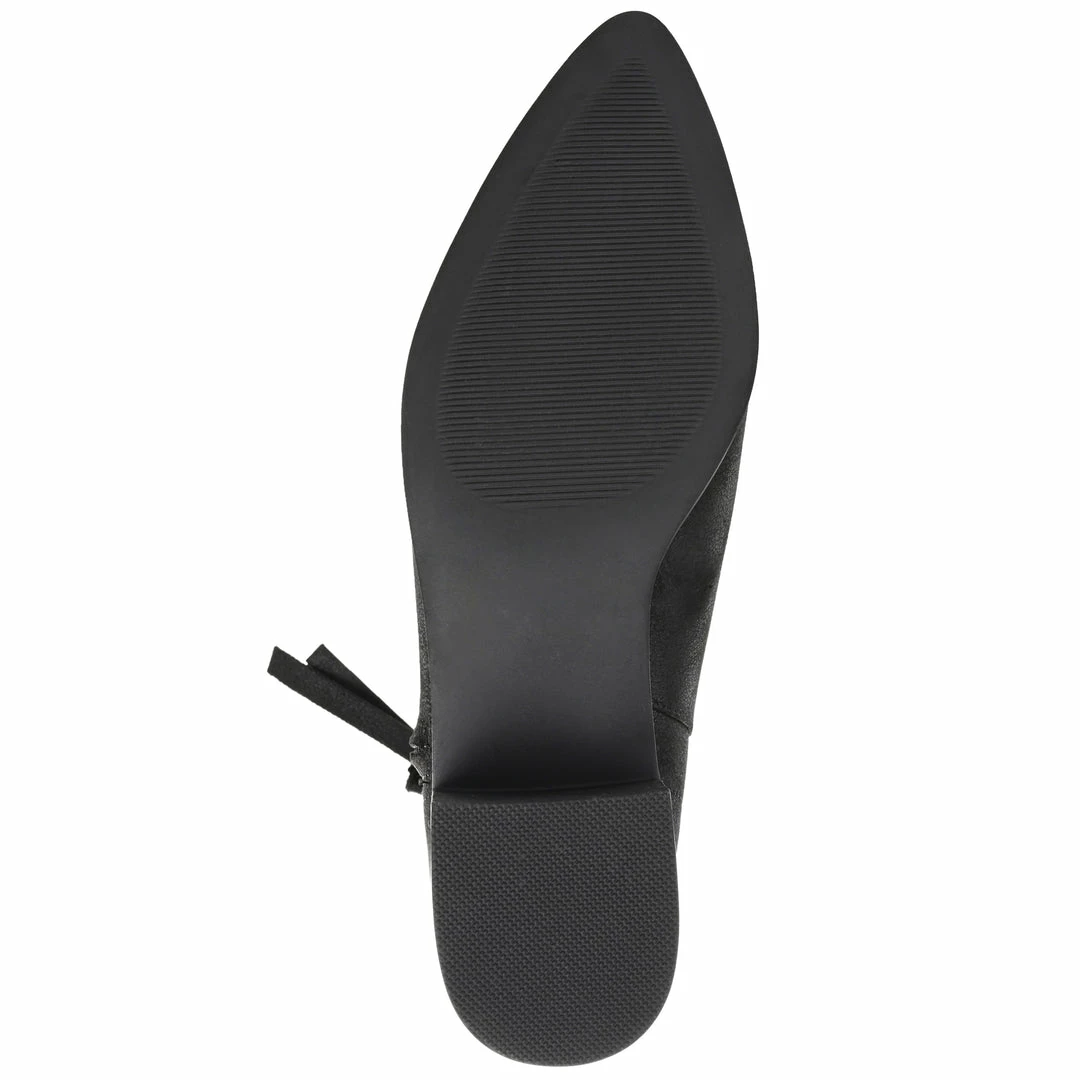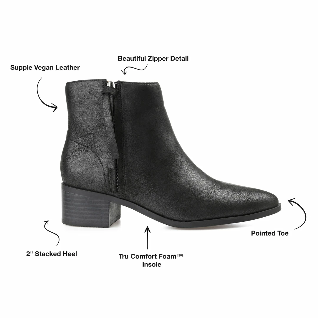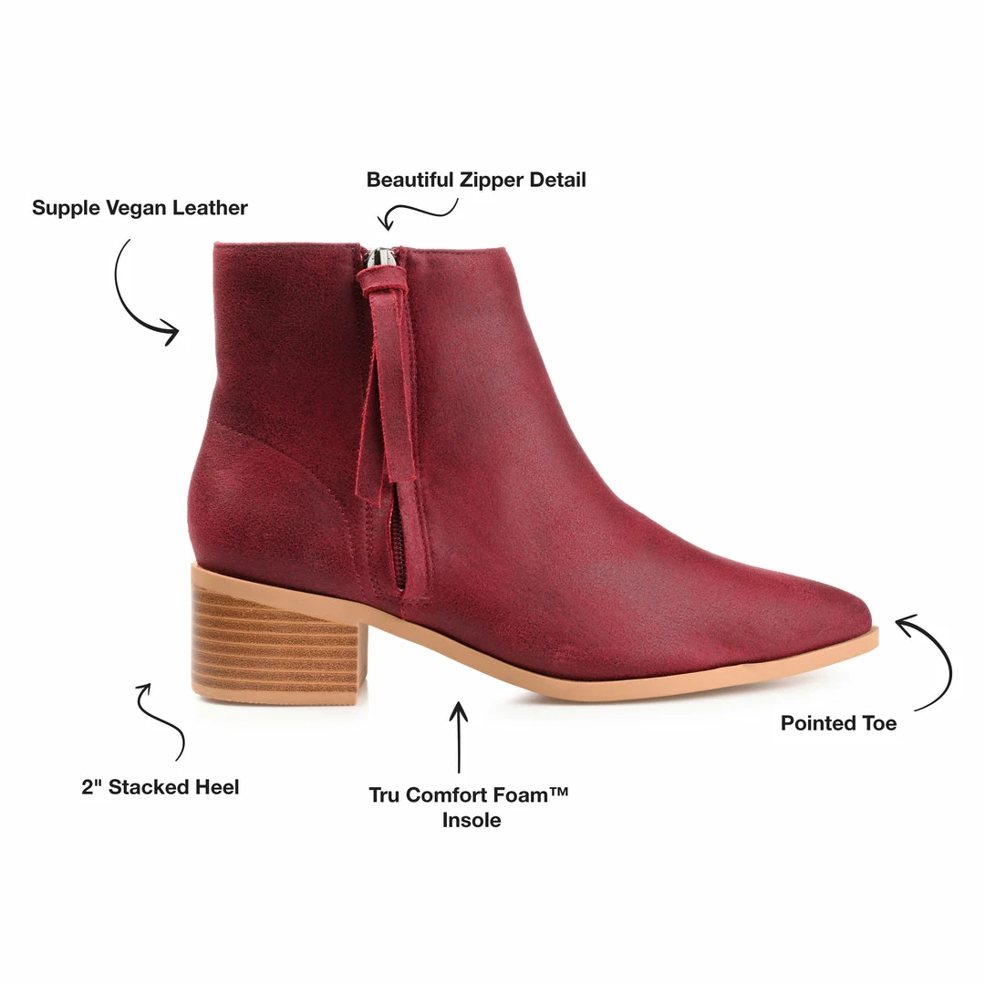 Stride in style in the Sadiya bootie by Journee Collection. This pointed-toe silhouette features soft vegan leather elevated by a stacked block heel. A 4 mm Tru Comfort Foamβ’ insole makes them super comfy, and a side zipper embellished with a tassel makes them easy to slip on. Heel Height – 2-inch Heel Type – Stacked Platform Height – Flat-inch Shaft Height – 4 1/2 inches Top Circumference – 10 1/2 inches Shoe Width – Medium Closure Type – Inside Zip Toe Style – Pointed Lining – Fabric Upper Material – Vegan Leather Outersole Material – Man-made Footbed – 4 MM Tru Comfort Foamβ’