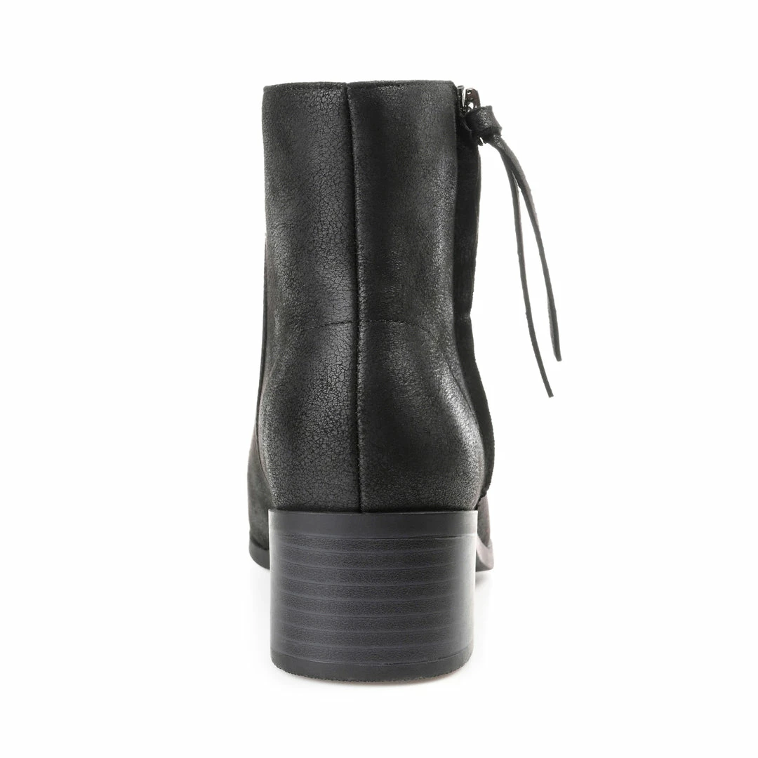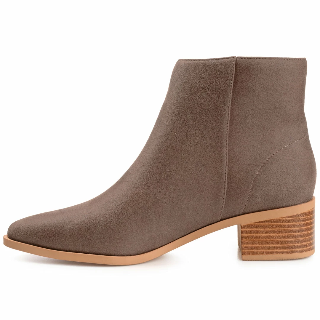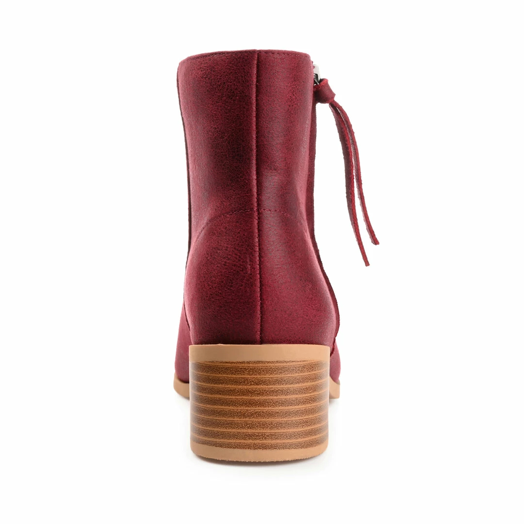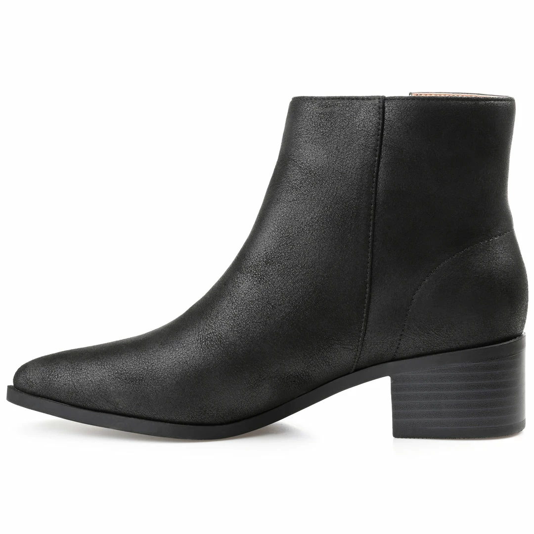 Stride in style in the Sadiya bootie by Journee Collection. This pointed-toe silhouette features soft vegan leather elevated by a stacked block heel. A 4 mm Tru Comfort Foamβ’ insole makes them super comfy, and a side zipper embellished with a tassel makes them easy to slip on. Heel Height – 2-inch Heel Type – Stacked Platform Height – Flat-inch Shaft Height – 4 1/2 inches Top Circumference – 10 1/2 inches Shoe Width – Medium Closure Type – Inside Zip Toe Style – Pointed Lining – Fabric Upper Material – Vegan Leather Outersole Material – Man-made Footbed – 4 MM Tru Comfort Foamβ’
