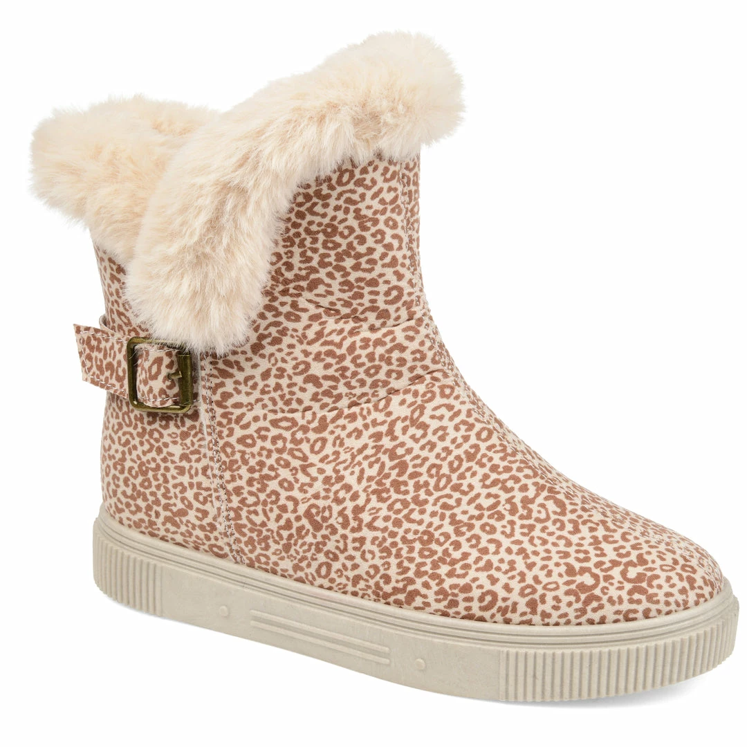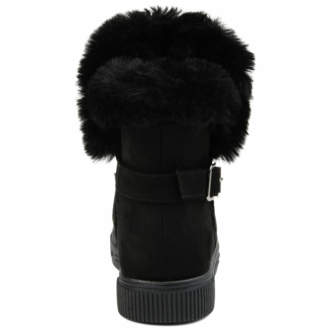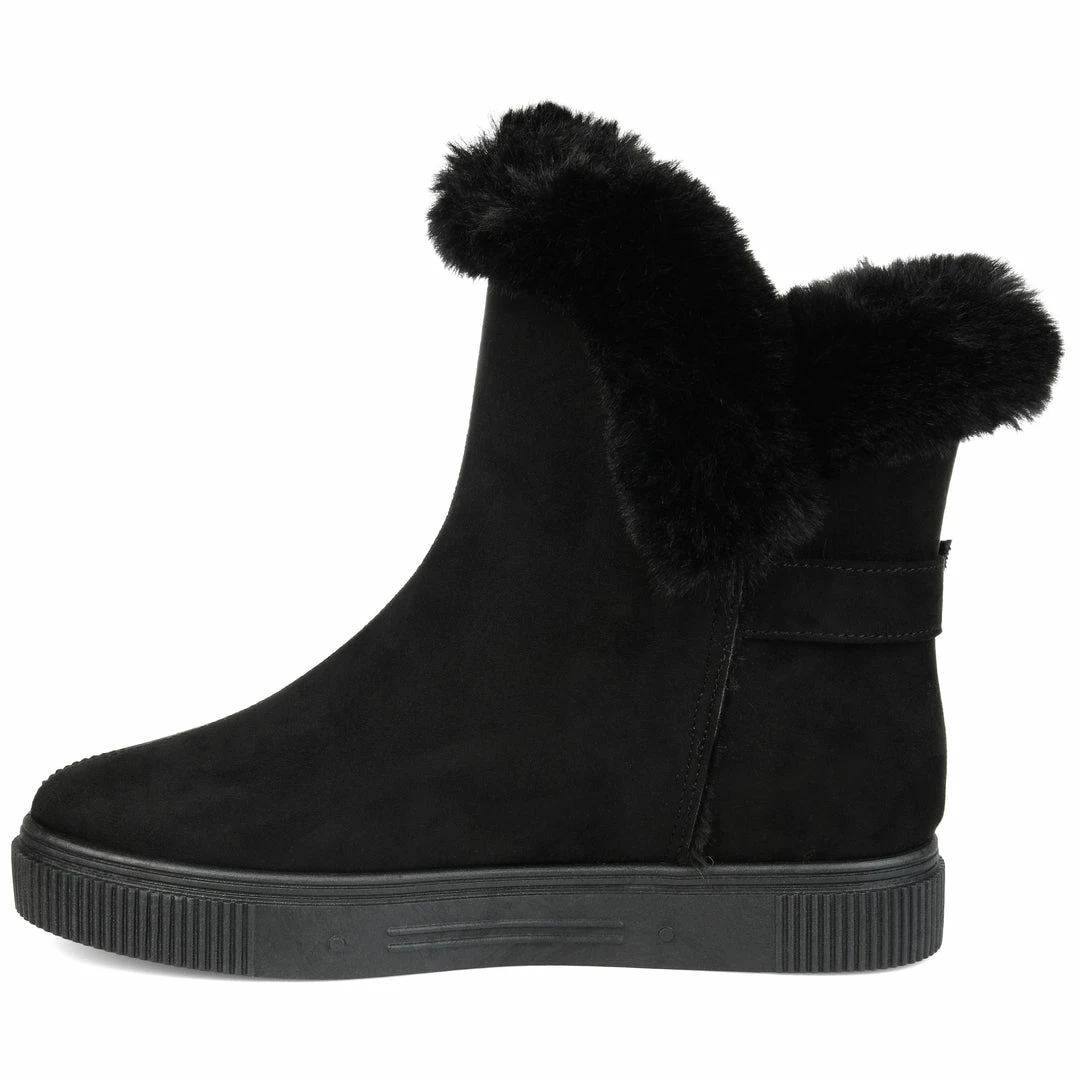 Step into your favorite new winter boot by Journee Collection. The Sibby boot features a soft round toe with fluffy faux fur trim. The platform rubber sole is perfect for those icy days, and the strap and buckle accents adds a little fun to your boot style. Heel Height – 1-inch Heel Type – Sole Platform Height – 1-inch Shaft Height – 6 inches Top Circumference – 14 1/2 inches Shoe Width – Medium Closure Type – Pull-on Toe Style – Round Lining – Fabric Upper Material – Faux Suede Outersole Material – Man-made Footbed – 4 MM Tru Comfort Foamโข